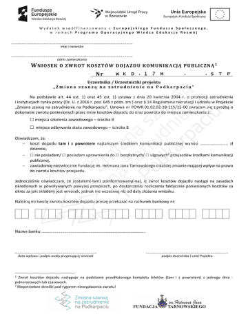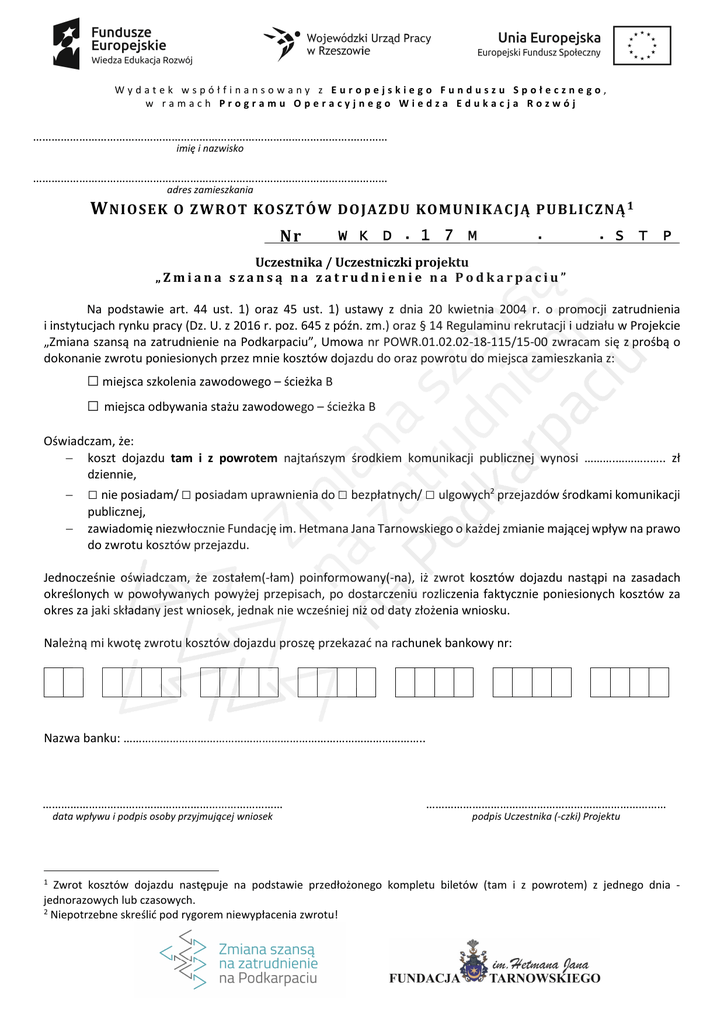 Wydatek współfinansowany z Europejskiego Funduszu Społecznego, w ramach Programu Operacyjnego Wiedza Edukacja Rozwój ………………………………………………………………………………………….………… imię i nazwisko ………………………………………………………………………………………….………… adres zamieszkania W N IO SE K O Z WROT KO SZ T Ó W DO JAZ DU KO M U N IKACJĄ PU BLICZ N Ą 1 Nr W K D . 1 7 M . . S T P Uczestnika / Uczestniczki projektu „Zmiana szansą na zatrudnienie na Podkarpaciu” Na podstawie art. 44 ust. 1) oraz 45 ust. 1) ustawy z dnia 20 kwietnia 2004 r. o promocji zatrudnienia i instytucjach rynku pracy (Dz. U. z 2016 r. poz. 645 z późn. zm.) oraz § 14 Regulaminu rekrutacji i udziału w Projekcie „Zmiana szansą na zatrudnienie na Podkarpaciu”, Umowa nr POWR.01.02.02-18-115/15-00 zwracam się z prośbą o dokonanie zwrotu poniesionych przez mnie kosztów dojazdu do oraz powrotu do miejsca zamieszkania z: □ miejsca szkolenia zawodowego – ścieżka B □ miejsca odbywania stażu zawodowego – ścieżka B Oświadczam, że: − koszt dojazdu tam i z powrotem najtańszym środkiem komunikacji publicznej wynosi ……….………..….. zł dziennie, − □ nie posiadam/ □ posiadam uprawnienia do □ bezpłatnych/ □ ulgowych2 przejazdów środkami komunikacji publicznej, − zawiadomię niezwłocznie Fundację im. Hetmana Jana Tarnowskiego o każdej zmianie mającej wpływ na prawo do zwrotu kosztów przejazdu. Jednocześnie oświadczam, że zostałem(-łam) poinformowany(-na), iż zwrot kosztów dojazdu nastąpi na zasadach określonych w powoływanych powyżej przepisach, po dostarczeniu rozliczenia faktycznie poniesionych kosztów za okres za jaki składany jest wniosek, jednak nie wcześniej niż od daty złożenia wniosku. Należną mi kwotę zwrotu kosztów dojazdu proszę przekazać na rachunek bankowy nr: Nazwa banku: …………………………………………………………………………………….. …………………………………………………………………… …………………………………………………………………… data wpływu i podpis osoby przyjmującej wniosek podpis Uczestnika (-czki) Projektu 1 Zwrot kosztów dojazdu następuje na podstawie przedłożonego kompletu biletów (tam i z powrotem) z jednego dnia jednorazowych lub czasowych. 2 Niepotrzebne skreślić pod rygorem niewypłacenia zwrotu! Wydatek współfinansowany z Europejskiego Funduszu Społecznego, w ramach Programu Operacyjnego Wiedza Edukacja Rozwój Potwierdzenie poniesienia wydatków: Tutaj proszę przedstawić bilety, potwierdzenia wydatków stanowiące koszt jednostkowy dojazdu. Rozliczenie kwoty do zwrotu – W YPEŁ NI A PRAC O W NI K F U ND AC J I Koszt jednostkowy dojazdu Liczba dni kwalifikowanych do zwrotu kosztów Cel podróży (szkolenia) zł, gr. (w oparciu o listy obecności) ……………. , …….. ……… Kwota kosztów kwalifikowanych zł, gr. ……………. , …….. Łącznie suma kosztów kwalifikowanych do zwrotu ……………. , …….. Koszty bezpośrednie Wydatek poniesiony w związku z realizacją Projektu: „Zmiana szansą na zatrudnienie na Podkarpaciu” współfinansowanego z Europejskiego Funduszu Społecznego, realizowanego przez Fundację im. Hetmana Jana Tarnowskiego, w ramach Programu Operacyjnego Wiedza Edukacja Rozwój, Priorytet I, Działanie 1.2, Poddziałanie 1.2.2: Wsparcie udzielane z Inicjatywy na rzecz zatrudnienia ludzi młodych Umowa z Wojewódzkim Urzędem Pracy w Rzeszowie – Nr POWR.01.02.02-18-0115/15 z dnia 07 lipca 2016 r. Kwota dokumentu Wydatek kwalifikowalny w kwocie Zatwierdzono do wypłaty na kwotę ……….….., …. zł ……….….., …. zł ……….….., …. zł Słownie: …………………………………………………………………….… Zad. ….. poz. ……. Nazwa ……………………………………… Zgodnie z zatwierdzonym wnioskiem o dofinansowanie Projektu ………………..…………… (-) Kierowniczka Projektu Sprawdzono pod względem formalno– rachunkowym Sprawdzono pod względem merytorycznym Zatwierdzono do wypłaty …………………………………. ………………………………….