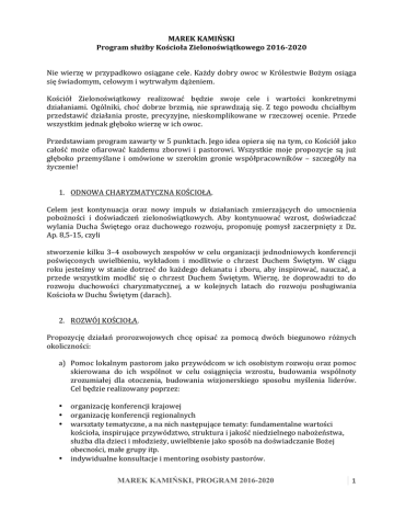 MAREK KAMIŃSKI Program służby Kościoła Zielonoświątkowego 2016-‐2020 Nie wierzę w przypadkowo osiągane cele. Każdy dobry owoc w Królestwie Bożym osiąga się świadomym, celowym i wytrwałym dążeniem. Kościół Zielonoświątkowy realizować będzie swoje cele i wartości konkretnymi działaniami. Ogólniki, choć dobrze brzmią, nie sprawdzają się. Z tego powodu chciałbym przedstawić działania proste, precyzyjne, nieskomplikowane w rzeczowej ocenie. Przede wszystkim jednak głęboko wierzę w ich owoc. Przedstawiam program zawarty w 5 punktach. Jego idea opiera się na tym, co Kościół jako całość może ofiarować każdemu zborowi i pastorowi. Wszystkie moje propozycje są już głęboko przemyślane i omówione w szerokim gronie współpracowników – szczegóły na życzenie! 1. ODNOWA CHARYZMATYCZNA KOŚCIOŁA. Celem jest kontynuacja oraz nowy impuls w działaniach zmierzających do umocnienia pobożności i doświadczeń zielonoświątkowych. Aby kontynuować wzrost, doświadczać wylania Ducha Świętego oraz duchowego rozwoju, proponuję pomysł zaczerpnięty z Dz. Ap. 8,5-‐15, czyli stworzenie kilku 3–4 osobowych zespołów w celu organizacji jednodniowych konferencji poświęconych uwielbieniu, wykładom i modlitwie o chrzest Duchem Świętym. W ciągu roku jesteśmy w stanie dotrzeć do każdego dekanatu i zboru, aby inspirować, nauczać, a przede wszystkim modlić się o chrzest Duchem Świętym. Wierzę, że doprowadzi to do rozwoju duchowości charyzmatycznej, a w kolejnych latach do rozwoju posługiwania Kościoła w Duchu Świętym (darach). 2. ROZWÓJ KOŚCIOŁA. Propozycję działań prorozwojowych chcę opisać za pomocą dwóch biegunowo różnych okoliczności: a) Pomoc lokalnym pastorom jako przywódcom w ich osobistym rozwoju oraz pomoc skierowana do ich wspólnot w celu osiągnięcia wzrostu, budowania wspólnoty zrozumiałej dla otoczenia, budowania wizjonerskiego sposobu myślenia liderów. Cel będzie realizowany poprzez: • organizację konferencji krajowej • organizację konferencji regionalnych • warsztaty tematyczne, a na nich następujące tematy: fundamentalne wartości kościoła, inspirujące przywództwo, struktura i jakość niedzielnego nabożeństwa, służba dla dzieci i młodzieży, uwielbienie jako sposób na doświadczanie Bożej obecności, małe grupy itp. • indywidualne konsultacje i mentoring osobisty pastorów. MAREK KAMIŃSKI, PROGRAM 2016-2020 1 b) Pomoc zborom będącym w stagnacji lub przeżywającym trudności. Utworzyliśmy już grupę pastorów pragnących osobiście zająć się pomocą takim zborom. Oferujemy wiedzę, pomoc ojcowską, wsparcie kaznodziejskie i inne działania konieczne do zatrzymania negatywnych zjawisk mających miejsce w danym zborze. Następnym krokiem będzie przyczynienie się do duchowego, jakościowego i ilościowego rozwoju tych zborów. 3. ZAKŁADANIE ZBORÓW. W roku 2015 założyliśmy 12 nowych zborów. Jest to efekt wcześniej podjętych celowych i świadomych działań. Po rozmowach i uzgodnieniach z wieloma braćmi zajmującymi się tą służbą, zapragnęliśmy dać nowy impuls służbie zakładania nowych zborów. Naszym celem jest powstawanie zboru średnio co miesiąc (tak jak marzył o tym kiedyś brat Michał Hydzik). Jak możemy tę służbę wesprzeć? Jak założyć zbory? c) poprzez wyszkolenie pastorów i misjonarzy, przekazanie wiedzy z tą służbą związanej, d) generowanie finansów na pomoc, e) zaoferowanie osobistego opiekuna/mentora dla każdej placówki, f) kontynuowanie opieki na zborem aż do chwili pełnego usamodzielnienia się, g) uzgodniliśmy już pełną koordynację wszystkich służb i osób „mających serce” do zakładania zborów. h) współpraca z grupami misyjnymi, polskimi i zagranicznymi. 4. ZMIANA MODELU PRACY W OKRĘGACH. MODEL DUSZPASTERSKO -‐ SAMORZĄDNY. Kościół jest zbyt duży, by nie dokonać korekty jego pracy. Jego centralizacja już nie służy naszym wartościom. Cele nowego modelu: • przekazanie lokalnym gremiom pastorów odpowiedzialności za kościół, przez co zaspokojona będzie potrzeba opieki, dzielenia się zasobami w służbie, • zbudowanie i/lub umocnienie więzi braterskich („wzajemnie zasilające się stawy” – Ef. 4,16), • stworzenie systemu wzajemnej pomocy, wsparcia i troski, • oddanie prawa do podejmowania decyzji organizacyjnych, duszpasterskich i dyscyplinarnych lokalnym gremiom pastorów. Jak to osiągnąć? Przede wszystkim poprzez zmianę modelu pracy w okręgach, aby okazać troskę o każdą część kościoła. Prezbiter okręgowy (oraz/lub jego współpracownicy) będzie miał wykonać następujące zadania: i) raz w roku spotkać się z pastorem i starszymi zboru, aby porozmawiać o wszystkim, co dotyczy zboru, MAREK KAMIŃSKI, PROGRAM 2016-2020 2 j) raz na kwartał spotkać się z pastorem, aby dowiedzieć się, jak mu się powodzi i jak można mu pomóc, k) raz w miesiącu zadzwonić do pastora i przeprowadzić przyjacielską rozmowę. Dzięki powyższym zbudujemy relacje, posiądziemy wiedzę o sukcesach, zmaganiach, porażkach i potrzebach zborów. Będziemy mogli następnie, właściwie do tej wiedzy, koordynować działania służące całej wspólnocie. 5. POKOLENIE +35. Chciałbym zachęcić Kościół do troski o swoich „TYMOTEUSZY’. Musimy pokazać młodemu pokoleniu, że są potrzebni, że jest dla nich miejsce w Kościele, że oczekujemy na ich zaangażowanie i służbę. Zaufajmy im, stwórzmy możliwości i inwestujmy w nich. Tyle o celach. A jakie działania? • wyszukiwanie młodych ludzi obdarzonych przez Boga namaszczeniem i talentami, • objęcie ich opieką mentorską, aby inspirować do osobistego rozwoju duchowego oraz rozwoju w służbie, • inwestować w edukację osób wyróżniających się, • udostępnić im miejsce w służbie, pozwolić na sprawdzenie się w „boju”, a nawet gdy pojawią się błędy – dalej okazywać zaufani