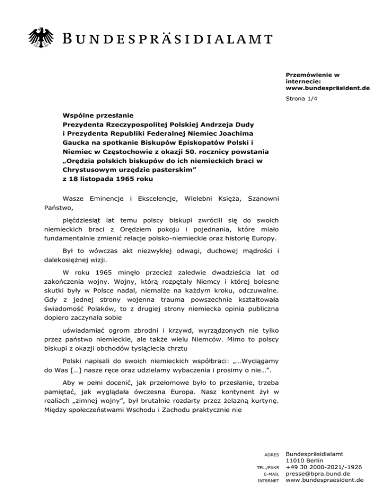 Przemówienie w internecie: www.bundespräsident.de Strona 1/4 Wspólne przesłanie Prezydenta Rzeczypospolitej Polskiej Andrzeja Dudy i Prezydenta Republiki Federalnej Niemiec Joachima Gaucka na spotkanie Biskupów Episkopatów Polski i Niemiec w Częstochowie z okazji 50. rocznicy powstania „Orędzia polskich biskupów do ich niemieckich braci w Chrystusowym urzędzie pasterskim” z 18 listopada 1965 roku Wasze Eminencje i Ekscelencje, Wielebni Księża, Szanowni Państwo, pięćdziesiąt lat temu polscy biskupi zwrócili się do swoich niemieckich braci z Orędziem pokoju i pojednania, które miało fundamentalnie zmienić relacje polsko-niemieckie oraz historię Europy. Był to wówczas akt niezwykłej odwagi, duchowej mądrości i dalekosiężnej wizji. W roku 1965 minęło przecież zaledwie dwadzieścia lat od zakończenia wojny. Wojny, którą rozpętały Niemcy i której bolesne skutki były w Polsce nadal, niemalże na każdym kroku, odczuwalne. Gdy z jednej strony wojenna trauma powszechnie kształtowała świadomość Polaków, to z drugiej strony niemiecka opinia publiczna dopiero zaczynała sobie uświadamiać ogrom zbrodni i krzywd, wyrządzonych nie tylko przez państwo niemieckie, ale także wielu Niemców. Mimo to polscy biskupi z okazji obchodów tysiąclecia chrztu Polski napisali do swoich niemieckich współbraci: „…Wyciągamy do Was […] nasze ręce oraz udzielamy wybaczenia i prosimy o nie…”. Aby w pełni docenić, jak przełomowe było to przesłanie, trzeba pamiętać, jak wyglądała ówczesna Europa. Nasz kontynent żył w realiach „zimnej wojny”, był brutalnie rozdarty przez żelazną kurtynę. Między społeczeństwami Wschodu i Zachodu praktycznie nie ADRES TEL./FAKS E-MAIL INTERNET Bundespräsidialamt 11010 Berlin +49 30 2000-2021/-1926 [email protected] www.bundespraesident.de Strona 2/4 istniały jakiekolwiek kontakty. Dodatkowo, granica na Odrze i Nysie jawiła się jako kość niezgody; niemal wszyscy Polacy obawiali się „zachodnioniemieckiego rewanżyzmu”, celowo podsycanego przez komunistyczne władze. Polscy biskupi przełamali jednak wyliczanie krzywd i klimat wrogości. Wbrew nastrojom własnego społeczeństwa wyciągnęli do niemieckich braci biskupów rękę w geście zbliżenia i dialogu. Znaczenie tego Orędzia było tym ważniejsze, że choć ze swej istoty nie miało ono wymiaru deklaracji politycznej, pochodziło z serca i stanowiło poruszające przesłanie duchowe, wyrażające głęboką refleksję moralną, głos wiary i sumienia. My, Prezydenci Polski i Niemiec, w poczuciu ogromnej wdzięczności pamiętamy o tym akcie założycielskim pokojowego sąsiedztwa. W imieniu naszych Narodów, pragniemy wyrazić serdeczną wdzięczność wszystkim, którzy poszli drogą wytyczoną przez Orędzie biskupów polskich i przyczynili się do pojednania polsko-niemieckiego. Ze szczególnym szacunkiem pragniemy w tym kontekście przywołać zasługi Prymasa Polski Kardynała Stefana Wyszyńskiego, który był jednym z autorów Orędzia i na którym skupiły się ataki komunistycznych władz. Jesteśmy pełni podziwu dla mądrej daleko-wzroczności biskupa wrocławskiego Kardynała Bolesława Kominka, głównego autora Orędzia, który w notatkach towarzyszących jego powstawaniu pisał: „Sposób mówienia nie może być nacjonalistyczny, lecz musi być europejski w najgłębszym znaczeniu tego słowa. Europa to przyszłość – nacjonalizmy są wczorajsze”. Ważną rolę w zbliżeniu polsko-niemieckim odegrało Memorandum Niemieckiego Kościoła Ewangelickiego, apelujące o porozumienie ze wschodnimi sąsiadami i uznanie granicy na Odrze i Nysie. W tym duchu postrzegać należy także późniejsze gesty niemieckiego kościoła katolickiego, choć początkowa reakcja samych adresatów Orędzia była oceniana jako ogólnikowa i powściągliwa. Należy zauważyć, że w obu krajach Kościoły wyprzedziły politykę w procesie polsko-niemieckiego zbliżenia, choć rząd Zachodnich Niemiec już niebawem poprzez politykę wschodnią podjął to, co zapoczątkowały siły społeczne. Szczególnie pamiętamy wielkie symboliczne gesty: uklęknięcie Willy’ego Brandta przed pomnikiem Bohaterów Getta w Warszawie w 1970 roku i objęcie się ramionami przez Helmuta Kohla i Tadeusza Strona 3/4 Mazowieckiego na znak pokoju podczas Mszy Pojednania w Krzyżowej w roku 1989, dwa miesiące po powołaniu w Polsce pierwszego, niekomunistycznego rządu w Europie Środkowo-Wschodniej, trzy dni po upadku muru berlińskiego. Do dialogu, pojednania i partnerstwa przyczyniły się także inne wydarzenia, kontynuujące ducha Orędzia. Fala wolności, zapoczątkowana przez dziesięciomilionowy ruch NSZZ „Solidarność”, rozbiła komunistyczny system w Europie Środkowo-Wschodniej i umożliwiła zjednoczenie Niemiec. Wolna, niepodległa Polska i wolne zjednoczone Niemcy przystąpiły do otwartego dialogu. Przesłanie moralne Orędzia wydało piękne owoce. Obrazem na miarę historycznego symbolu było przejście w 1995 roku Papieża św. Jana Pawła II, jednego z autorów Orędzia, wraz z kanclerzem zjednoczonych Niemiec Helmutem Kohlem przez Bramę Brandenburską. Trzeba było niemało czasu, nim nasze społeczeństwa w pełni obdarzyły się wzajemnym zaufaniem. Ale udało się. Wolni, doświadczamy radości wzajemnych spotkań, z nową, bogatą wiedzą o sobie nawzajem, tocząc niekiedy ostre nawet spory, lecz mając pewność, że ponad podziałami z przeszłości potrafimy budować wspólną przyszłość. Przezwyciężone zostały lęki, gdyż ostatecznie uregulowaliśmy kwestie wspólnych granic. Rany mogły się zabliźnić, bo spotkaliśmy się w duchu prawdy. A ponieważ każda ze stron otworzyła się na cierpienie drugiej, sama mogła doświadczyć współczucia. I tak przyjaźń, porozumienie oraz pojednanie zwyciężyły nad wrogością i urazami. Dziś Polacy i Niemcy są kimś więcej niż tylko dobrymi sąsiadami. Są partnerami