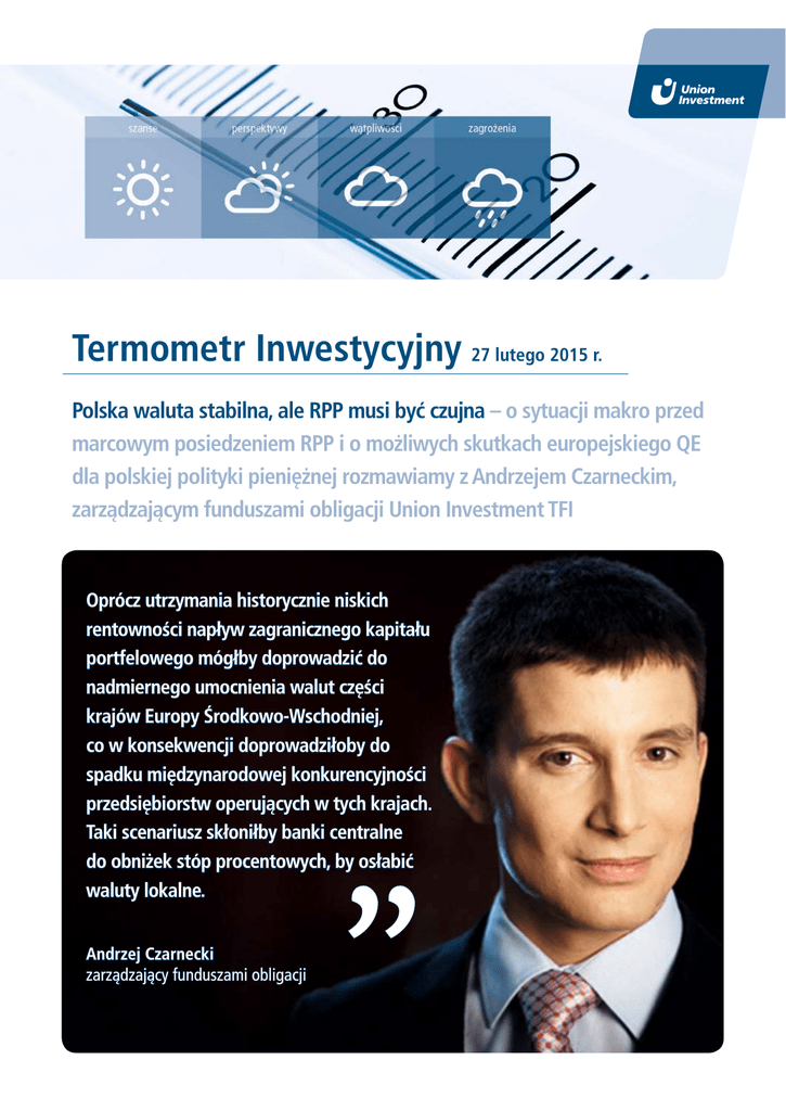 Termometr Inwestycyjny 27 lutego 2015 r. Polska waluta stabilna, ale RPP musi być czujna – o sytuacji makro przed marcowym posiedzeniem RPP i o możliwych skutkach europejskiego QE dla polskiej polityki pieniężnej rozmawiamy z Andrzejem Czarneckim, zarządzającym funduszami obligacji Union Investment TFI Oprócz utrzymania historycznie niskich rentowności napływ zagranicznego kapitału portfelowego mógłby doprowadzić do nadmiernego umocnienia walut części krajów Europy Środkowo-Wschodniej, co w konsekwencji doprowadziłoby do spadku międzynarodowej konkurencyjności przedsiębiorstw operujących w tych krajach. Taki scenariusz skłoniłby banki centralne do obniżek stóp procentowych, by osłabić waluty lokalne. Andrzej Czarnecki zarządzający funduszami obligacji W kontekście programu sovereign QE, który już niebawem zostanie uruchomiony przez Europejski Bank Centralny, rodzi się pytanie: jaki wpływ na gospodarki strefy euro (ale i na kraje europejskie znajdujące się poza tym obszarem) mogą mieć bardzo długo utrzymujące się niskie stopy procentowe? W pierwszej kolejności można się zastanawiać, czy skup aktywów rzeczywiście przyniesie zamierzone przez EBC skutki. Głównym celem EBC jest zwiększenie poziomu inflacji w strefie euro do poziomu bliskiego, ale niższego niż 2% (czyli zgodnego z głównym celem polityki EBC). Cel drugi, który wydaje się nawet ważniejszy, to dalsze złagodzenie warunków kredytowych dla przedsiębiorstw strefy euro. Banki posiadają olbrzymie środki i mogą je albo zainwestować, np. w obligacje niemieckie o ujemnej rentowności, albo pożyczyć przedsiębiorcom. Cel trzeci (niewymieniany w oficjalnych komunikatach) to osłabienie kursu euro wobec głównych walut świata, co przyczyni się do wzrostu konkurencyjności europejskiej gospodarki. Patrząc na kurs euro/dolar amerykański, można zauważyć, że polityka EBC w tym akurat aspekcie działa bardzo dobrze. Tu dochodzimy do wątpliwości, czy w takim wypadku część środków nie rozleje się także poza strefę euro i nie zostanie zainwestowana m.in. w obligacje krajów Europy Środkowo-Wschodniej oferujące dodatnią (zarówno w ujęciu realnym, jak i nominalnym) rentowność, np. polskie, węgierskie i rumuńskie. Jakie mogą być tego skutki? Oprócz utrzymania historycznie niskich rentowności na tych rynkach napływ zagranicznego kapitału portfelowego mógłby również doprowadzić do nadmiernego umocnienia walut tych krajów, co w konsekwencji doprowadziłoby do spadku międzynarodowej konkurencyjności przedsiębiorstw operujących w tych krajach, a docelowo odbiłoby się również na PKB. Taki scenariusz skłoniłby banki centralne tych krajów do obniżek stóp procentowych, by osłabić waluty lokalne. Przed nami marcowe posiedzenie Rady Polityki Pieniężnej. Będzie prewencyjna obniżka? Ogólnie rynek oczekuje obniżki stóp nawet o 50 pb na najbliższych posiedzeniach, a ewentualne następstwa luzowania ilościowego w Europie – w tym jego wpływ na aprecjację kursu złotówki w relacji do euro – są monitorowane przez RPP. Obecny kurs złotego nie wykazuje jednak żadnych niepokojących odchyleń, dlatego najbliższe obniżki będą miały raczej inne podłoże. Co sugerują dane makro? Gdyby brać pod uwagę wyłącznie tempo wzrostu gospodarczego w Polsce, poziom stóp powinien być taki, jak obecnie lub wręcz wyższy. Dużo ważniejsze punkty odniesienia dla RPP stanowią jednak ujemna inflacja oraz środowisko niskich stóp procentowych w Europie. Otoczenie to sugeruje, że także u nas stopy procentowe powinny znajdować się zdecydowanie niżej niż obecnie. Dodatkowo potwierdza to realna stopa procentowa (czyli różnica pomiędzy stopą referencyjną a inflacją) na poziomie przekraczającym 3%. Czy ewentualne marcowe cięcia stóp mogłyby pozytywnie wpłynąć na rentowności polskich obligacji? Tak, ale pod warunkiem, że byłyby one wyższe od konsensusu. Rynek wycenia już bowiem cięcie o 25 pb w marcu i o kolejne 25 pb (a nawet trochę więcej) w kwietniu. Z tego względu nie spodziewałbym się znaczącego wpływu decyzji RPP na krzywą rentowności. Z uwagi na znaczący, blisko 40-procentowy udział inwestorów zagranicznych w rynku złotówkowych obligacji skarbowych dużo większy wpływ na kształtowanie się trendu będzie miał sentyment w Europie. W kontekście kształtowania się sentymentu Europejski Bank Centralny zapowiedział, że będzie skupował obligacje poszczególnych krajów proporcjonalnie do ich udziału w kapitale EBC. Jakie konsekwencje dla rynków będą miały te interwencje? Udział poszczególnych narodowych banków centralnych w kapitale EBC odpowiada rozmiarowi gospodarki i wielkości populacji, a nie rozmiarowi rynku długu danego kraju. Oznacza to, że mogą wystąpić problemy z dostępnością obligacji rządowych niektórych krajów – staną się one bardzo drogie i mało płynne. Bardzo dobrym przykładem są obligacje Słowacji, które bardzo mocno zdrożały po tym, jak opublikowano detale programu skupu aktywów. Wcześniej obligacje słowackie w euro były wyceniane podobnie do polskich obligacji w euro (spread ok. 55 pb do bundów), a zaraz po komunikacie spread zmniejszył się o połowę. Masz pytania? 800 567 662 (22) 449 03 33 (od poniedziałku do piątku, od 8.00 do 18.00) [email protected] @ www.doradcy.unionklub.pl