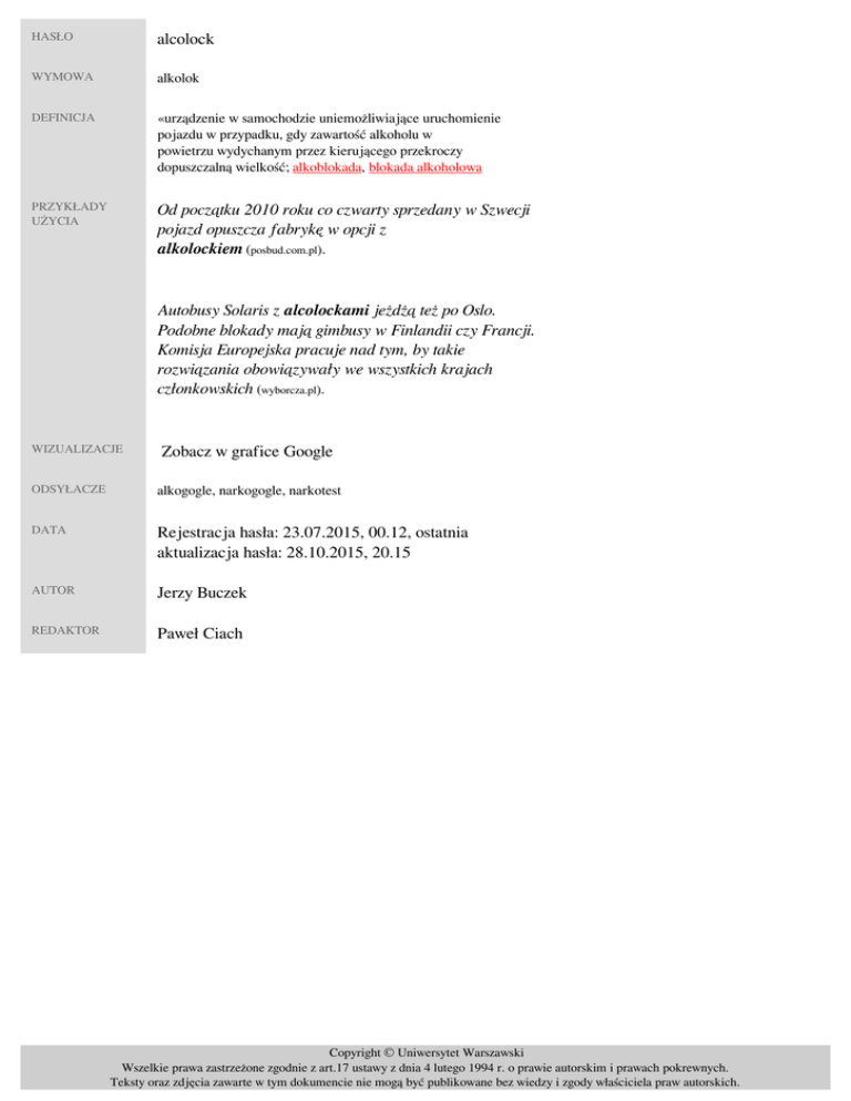 HASŁO alcolock WYMOWA alkolok DEFINICJA «urządzenie w samochodzie uniemożliwiające uruchomienie pojazdu w przypadku, gdy zawartość alkoholu w powietrzu wydychanym przez kierującego przekroczy dopuszczalną wielkość; alkoblokada, blokada alkoholowa» PRZYKŁADY UŻYCIA Od początku 2010 roku co czwarty sprzedany w Szwecji pojazd opuszcza fabrykę w opcji z alkolockiem (posbud.com.pl). Autobusy Solaris z alcolockami jeżdżą też po Oslo. Podobne blokady mają gimbusy w Finlandii czy Francji. Komisja Europejska pracuje nad tym, by takie rozwiązania obowiązywały we wszystkich krajach członkowskich (wyborcza.pl). WIZUALIZACJE Zobacz w grafice Google ODSYŁACZE alkogogle, narkogogle, narkotest DATA Rejestracja hasła: 23.07.2015, 00.12, ostatnia aktualizacja hasła: 28.10.2015, 20.15 AUTOR Jerzy Buczek REDAKTOR Paweł Ciach Copyright © Uniwersytet Warszawski Wszelkie prawa zastrzeżone zgodnie z art.17 ustawy z dnia 4 lutego 1994 r. o prawie autorskim i prawach pokrewnych. Teksty oraz zdjęcia zawarte w tym dokumencie nie mogą być publikowane bez wiedzy i zgody właściciela praw autorskich. Powered by TCPDF (www.tcpdf.org)