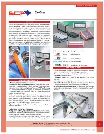 ex-con.elektronikab2b.pl Ex-Con OFIRMIE Firma Ex-Con jest autoryzowanym dystrybutorem niemieckich producentów obudów – Bopli iRose – na rynek polski. Rose iBopla to firmy należące do światowego koncernu Phoenix Mecano AG. Są liderem wśród producentów obudów, znajdujących zastosowanie głównie welektronice, automatyce iprzemyśle. Jesteśmy również autoryzowanym dystrybutorem firmy PFLITSCH zajmującej się produkcją systemów prowadzenia kabli – począwszy od najbardziej innowacyjnych na świecie dławnic kablowych poprzez systemowe rozwiązania zabudowy kabli jak koryta i kanały kablowe. Naszą ofertę uzupełniają dławnice ipeszle kablowe firmy FLEXA, ORTAC oraz całą gama złączy firmy BINDER. Posiadamy szeroką gamę produktów zcertyfikacją ATEX do stref zagrożonych wybuchem. Jesteśmy autoryzowanym dystrybutorem firm: Bopla www.bopla.de Rose www.rose-pw.de PFLITSCH www.pflitsch.de BINDER www.binder-connector.de OBSŁUGA KLIENTA OFEROWANE PRODUKTY Materiały do produkcji elektronicznej Obudowy do urządzeń elektronicznych: ztworzyw sztucznych, metalowe, z zabezpieczeniem EMC, obudowy do pracy w trudnych warunkach – maksymalny stopień ochrony IP 67, szafy/kasety 19’’, obudowy do montażu na szynę, dla elektroniki, przełączniki. Zapewniamy wiercenie/frezowane otworów. Zapewniamy montaż małych serii iprototypów. Systemów prowadzenia kabli: dławnice i przepusty z tworzywa, mosiądzu, stali nierdzewnej, stopień ochrony do IP 69 K. Szeroka gama wyrobów zcertyfikatem ATEX do stref zagrożonych wybuchem. Pełne systemy ochrony i prowadzenia kabli – od peszeli kablowych poprzez koryta ikanały przemysłowe. Złącza: pełna gama złączy elektronicznych renomowanego producenta – BINDER Pomoc techniczna: doradztwo techniczne, konsultacje, udostępniamy materiały iliteraturę techniczną producenta Dostawy: typowa szybkość dostawy produktu 10 dni Płatności: kredyt do 21 dni Oferujemy rabaty: przy dużych zamówieniach, dla stałych klientów Informacje orabatach podajemy: telefonicznie, faksem, e-mailem Materiały informacyjne: dysponujemy katalogami własnymi ikatalogami firmowymi dystrybuowanych dostawców Inne formy współpracy zklientem: przyśpieszony czas dostawy, możliwość reklamacji, zapewniamy kompletację dostaw, wysyłkę wzorów Laboratoria pomiarowe ibadawcze Wydajemy certyfikaty iświadectwa na badania: mechaniczne, elektryczne, bezpieczeństwa użytkowania, kompatybilności elektromagnetycznej, chemiczne, ognioodpornościowe. Specjalizacja: elektronika powszechnego użytku, telekomunikacja, automatyka, aparatura kontrolno-pomiarowa, elektroenergetyka. EX-CON Sp. zo.o., ul. Braniborska 58-68, 53-680 Wrocław tel. 71 794 70 47, faks 71 794 70 37, www.ex-con.pl, [email protected] I N F O R M AT O R R Y N KO W Y E L E K T R O N I K I 131 2011