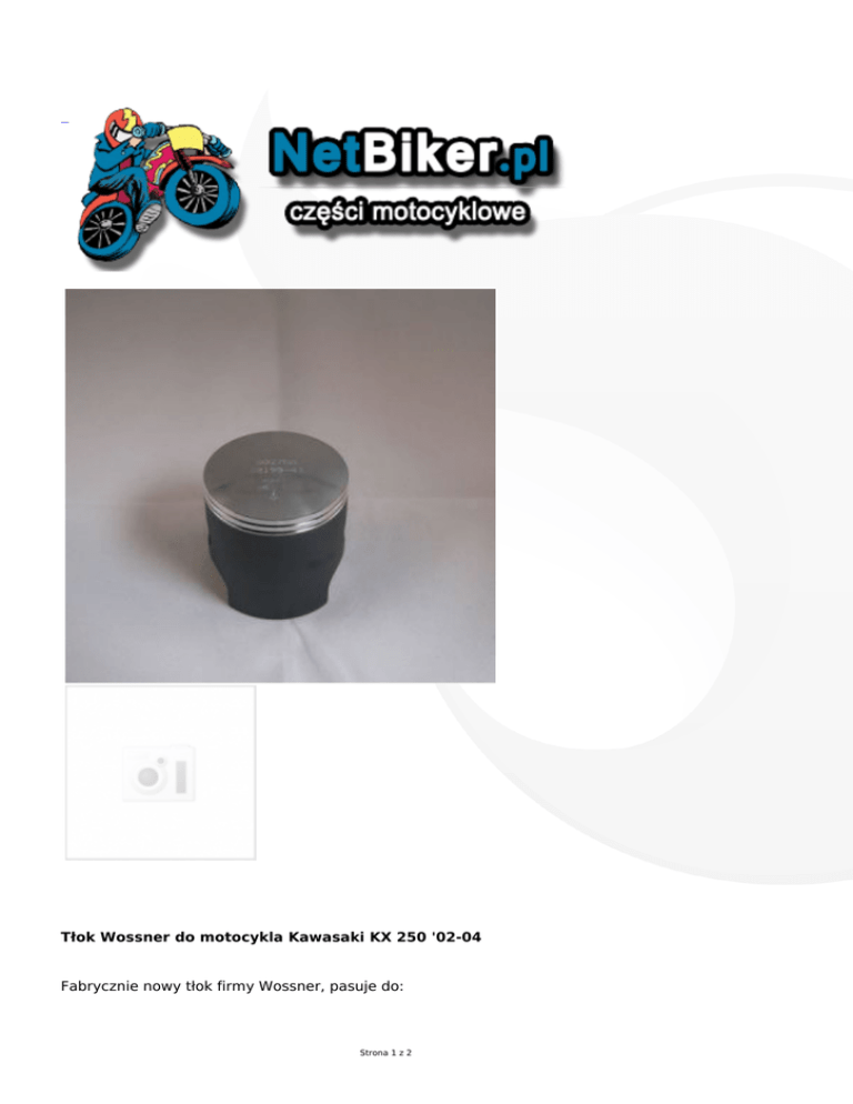 Tłok Wossner do motocykla Kawasaki KX 250 '02-04 Fabrycznie nowy tłok firmy Wossner, pasuje do: Strona 1 z 2 Kawasaki KX 250 z roczników 2002-04 Dostępne średnice tłoków do wyboru: 66.34 mm (symbol 8088DA) 66.35 mm (symbol 8088DB) 66.36 mm (symbol 8088DC) Tłok sprzedawany w komplecie z pierścieniami, sworzniem, zabezpieczeniami Zdjęcia poglądowe Strona 2 z 2
