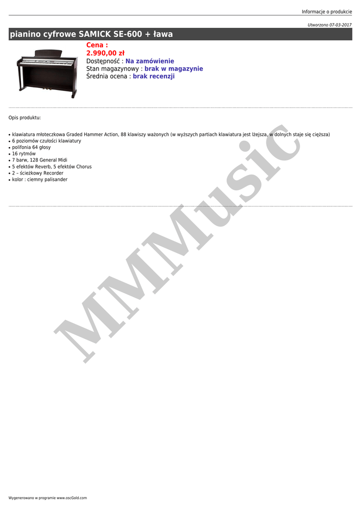 Informacje o produkcie Utworzono 07-03-2017 pianino cyfrowe SAMICK SE-600 + ława Cena : 2.990,00 zł Dostępność : Na zamówienie Stan magazynowy : brak w magazynie Średnia ocena : brak recenzji Opis produktu: ● ● ● ● ● ● M M M us ● klawiatura młoteczkowa Graded Hammer Action, 88 klawiszy ważonych (w wyższych partiach klawiatura jest lżejsza, w dolnych staje się cięższa) 6 poziomów czułości klawiatury polifonia 64 głosy 16 rytmów 7 barw, 128 General Midi 5 efektów Reverb, 5 efektów Chorus 2 – ścieżkowy Recorder kolor : ciemny palisander ic ● Wygenerowano w programie www.oscGold.com