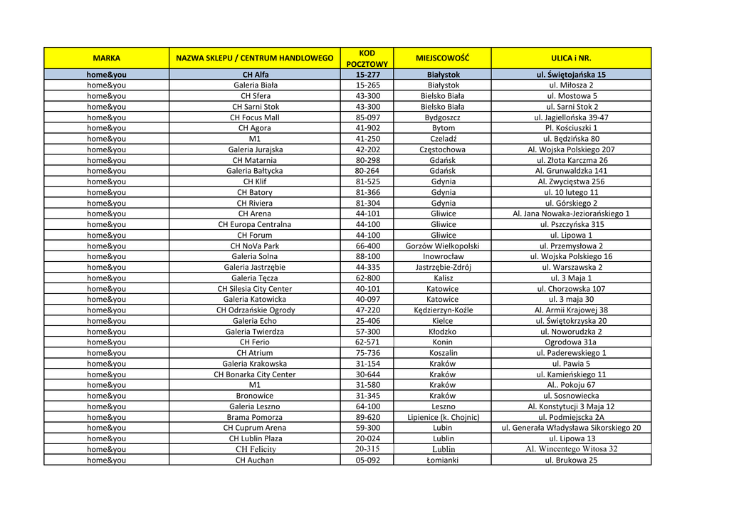 MARKA NAZWA SKLEPU / CENTRUM HANDLOWEGO home&you home&you home&you home&you home&you home&you home&you home&you home&you home&you home&you home&you home&you home&you home&you home&you home&you home&you home&you home&you home&you home&you home&you home&you home&you home&you home&you home&you home&you home&you home&you home&you home&you home&you home&you home&you home&you CH Alfa Galeria Biała CH Sfera CH Sarni Stok CH Focus Mall CH Agora M1 Galeria Jurajska CH Matarnia Galeria Bałtycka CH Klif CH Batory CH Riviera CH Arena CH Europa Centralna CH Forum CH NoVa Park Galeria Solna Galeria Jastrzębie Galeria Tęcza CH Silesia City Center Galeria Katowicka CH Odrzańskie Ogrody Galeria Echo Galeria Twierdza CH Ferio CH Atrium Galeria Krakowska CH Bonarka City Center M1 Bronowice Galeria Leszno Brama Pomorza CH Cuprum Arena CH Lublin Plaza CH Felicity CH Auchan KOD POCZTOWY 15-277 15-265 43-300 43-300 85-097 41-902 41-250 42-202 80-298 80-264 81-525 81-366 81-304 44-101 44-100 44-100 66-400 88-100 44-335 62-800 40-101 40-097 47-220 25-406 57-300 62-571 75-736 31-154 30-644 31-580 31-345 64-100 89-620 59-300 20-024 20-315 05-092 MIEJSCOWOŚĆ ULICA i NR. Białystok Białystok Bielsko Biała Bielsko Biała Bydgoszcz Bytom Czeladź Częstochowa Gdańsk Gdańsk Gdynia Gdynia Gdynia Gliwice Gliwice Gliwice Gorzów Wielkopolski Inowrocław Jastrzębie-Zdrój Kalisz Katowice Katowice Kędzierzyn-Koźle Kielce Kłodzko Konin Koszalin Kraków Kraków Kraków Kraków Leszno Lipienice (k. Chojnic) Lubin Lublin Lublin Łomianki ul. Świętojańska 15 ul. Miłosza 2 ul. Mostowa 5 ul. Sarni Stok 2 ul. Jagiellońska 39-47 Pl. Kościuszki 1 ul. Będzińska 80 Al. Wojska Polskiego 207 ul. Złota Karczma 26 Al. Grunwaldzka 141 Al. Zwycięstwa 256 ul. 10 lutego 11 ul. Górskiego 2 Al. Jana Nowaka-Jeziorańskiego 1 ul. Pszczyńska 315 ul. Lipowa 1 ul. Przemysłowa 2 ul. Wojska Polskiego 16 ul. Warszawska 2 ul. 3 Maja 1 ul. Chorzowska 107 ul. 3 maja 30 Al. Armii Krajowej 38 ul. Świętokrzyska 20 ul. Noworudzka 2 Ogrodowa 31a ul. Paderewskiego 1 ul. Pawia 5 ul. Kamieńskiego 11 Al.. Pokoju 67 ul. Sosnowiecka Al. Konstytucji 3 Maja 12 ul. Podmiejscka 2A ul. Generała Władysława Sikorskiego 20 ul. Lipowa 13 Al. Wincentego Witosa 32 ul. Brukowa 25 home&you home&you home&you home&you home&you home&you home&you home&you home&you home&you home&you home&you home&you home&you home&you home&you home&you home&you home&you home&you home&you home&you home&you home&you home&you home&you home&you home&you home&you home&you home&you home&you home&you home&you home&you home&you home&you home&you home&you CH Manufaktura CH Port Łódź CH Tulipan Galeria Łódzka Trzy Korony CH Alfa CH Solaris Center CH Karolinka Galeria Ostrovia Galeria Kasztanowa CH Focus Mall Galeria Mazovia CH King Cross Marcelin CH M1 CH Plaza CH Stary Browar Galeria Malta PKP City Center CH Yeti Galeria Słoneczna CH Plaza CH Plaza CH Millenium Hall City Center Galeria Siedlce CH Jantar Galeria Słupska Sosnowiec Plaza CH Atrium Molo Galeria Kaskada CH Galaxy Galeria Świdnicka CH Gemini Park CH Copernicus CH Plaza CH Arkadia CH Reduta CH Sadyba Best Mall CH Targówek 91-071 93-547 92-202 90-307 33-300 10-576 45-040 46-020 63-400 64-920 97-300 09-410 60-198 61-285 61-693 61-888 61-131 61-586 24-100 26-609 41-710 44-200 35-315 32-035 08-110 76-200 76-200 41-200 71-011 70-404 70-554 58-100 33-100 87-100 87-100 00-175 02-326 02-903 03-287 Łódź Łódź Łódź Łódź Nowy Sącz Olsztyn Opole Opole Ostrów Wielkopolski Piła Piotrków Trybunalski Płock Poznań Poznań Poznań Poznań Poznań Poznań Puławy Radom Ruda Śląska Rybnik Rzeszów Rzeszów Siedlce Słupsk Słupsk Sosnowiec Szczecin Szczecin Szczecin Świdnica Tarnów Toruń Toruń Warszawa Warszawa Warszawa Warszawa ul. Karskiego 5 ul. Pabianicka 245 ul. Piłsudskiego 94 Al. Piłsudskiego 15/23 ul. Lwowska 80 Al. Piłsudskiego 16 Pl. Kopernika 16 ul. Wrocławska 152/154 ul. Kaliska 120 Al. Powstańców Wielkopolskich 99 ul. Słowackiego 123 ul. Wyszogrodzka 127 ul. Bukowska 156 ul. Szwajcarska 14 ul. Kacpra Drużbickiego 2 ul. Półwiejska 32 ul. Maltańska 1 ul. Stanisława Matyi 2 ul. Piłsudskiego 51 ul. Bolesława Chrobrego 1 ul. 1 Maja 310 ul. Raciborska 16 ul. Kopisto 1 ul. Lisa Kuli 19 Wojskowa 3 ul. Szczecińska 58 ul. Tuwima 32-33 ul. Sienkiewicza 2 ul. Mieszka I 73 Al. Niepodległości 36 Al. Wyzwolenia 18-20 ul. Westerplatte 29 ul. Nowodąbrowska 127 ul. Żółkiewskiego 15 ul. Broniewskiego 90 Al. Jana Pawła II 82 Al. Jerozolimskie 148 ul. Powsińska 31 ul. Głębocka 15 home&you home&you home&you home&you home&you home&you home&you home&you home&you home&you home&you home&you home&you home&you CH Wars & Sawa CH Wola Park Galeria Mokotów Plan unii Skorosze CH Wzorcownia CH Magnolia Park CH Pasaż Grunwaldzki CH Renoma CH Sky Tower CH M1 Galeria Twierdza Galeria Słowiańska CH Focus Mall 00-017 01-460 02-675 02-566 02-497 87-800 54-204 50-363 50-950 53-332 41-800 22-400 59-900 65-427 Warszawa Warszawa Warszawa Warszawa Warszawa Włocławek Wrocław Wrocław Wrocław Wrocław Zabrze Zamość Zgorzelec Zielona Góra ul. Marszałkowska 104/122 ul. Górczewska 124 ul. Wołoska 12 ul. Puławska 2 ul. Gen. Sławoja - Składowskiego 4 ul. Kilińskiego 3 ul. Legnicka 58 Pl. Grunwaldzki 22 ul. Świdnicka 40 ul. Powstańców Śląskich 95 ul. Szkubacza 1 ul. Przemysłowa 10 ul. Jeleniogórska 42 ul. Wrocławska 17