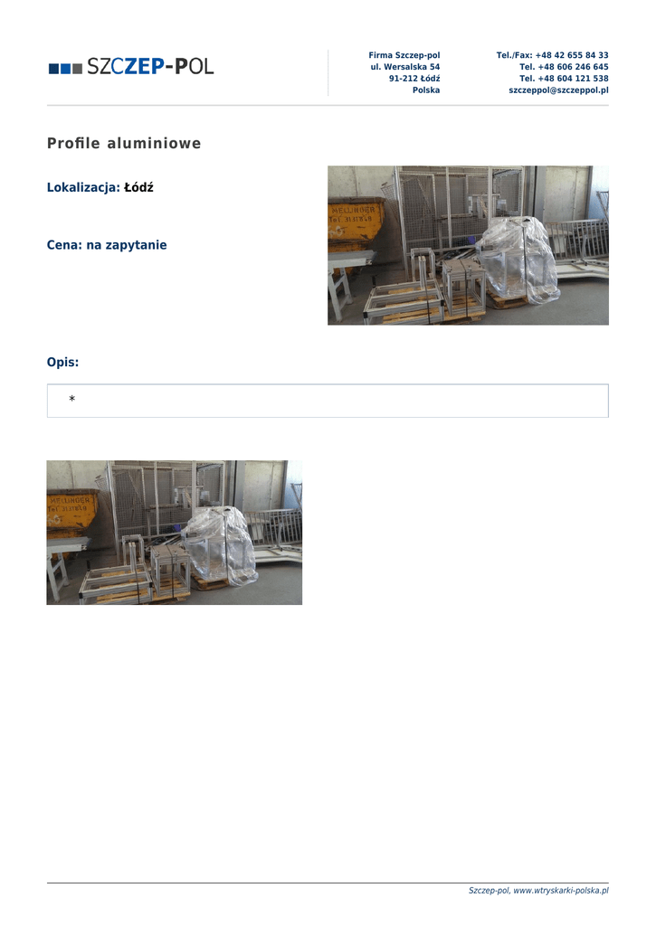 Firma Szczep-pol ul. Wersalska 54 91-212 Łódź Polska Tel./Fax: +48 42 655 84 33 Tel. +48 606 246 645 Tel. +48 604 121 538 [email protected] Profile aluminiowe Lokalizacja: Łódź Cena: na zapytanie Opis: * Szczep-pol, www.wtryskarki-polska.pl
