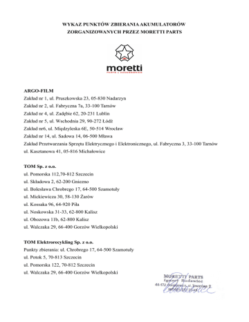 WYKAZ PUNKTÓW ZBIERANIA AKUMULATORÓW ZORGANIZOWANYCH PRZEZ MORETTI PARTS ARGO-FILM Zakład nr 1, ul. Pruszkowska 23, 05-830 Nadarzyn Zakład nr 2, ul. Fabryczna 7a, 33-100 Tarnów Zakład nr 4, ul. Zadębie 62, 20-231 Lublin Zakład nr 5, ul. Wschodnia 29, 90-272 Łódź Zakład nr6, ul. Międzyleska 6E, 50-514 Wrocław Zakład nr 14, ul. Sadowa 14, 06-500 Mława Zakład Przetwarzania Sprzętu Elektrycznego i Elektronicznego, ul. Fabryczna 3, 33-100 Tarnów ul. Kasztanowa 41, 05-816 Michałowice TOM Sp. z o.o. ul. Pomorska 112,70-812 Szczecin ul. Składowa 2, 62-200 Gniezno ul. Bolesława Chrobrego 17, 64-500 Szamotuły ul. Mickiewicza 30, 58-130 Żarów ul. Kossaka 96, 64-920 Piła ul. Noskowska 31-33, 62-800 Kalisz ul. Obozowa 11b, 62-800 Kalisz ul. Walczaka 29, 66-400 Gorzów Wielkopolski TOM Elektrorecykling Sp. z o.o. Punkty zbierania: ul. Chrobrego 17, 64-500 Szamotuły ul. Potok 5, 70-813 Szczecin ul. Pomorska 122, 70-812 Szczecin ul. Walczaka 29, 66-400 Gorzów Wielkopolski