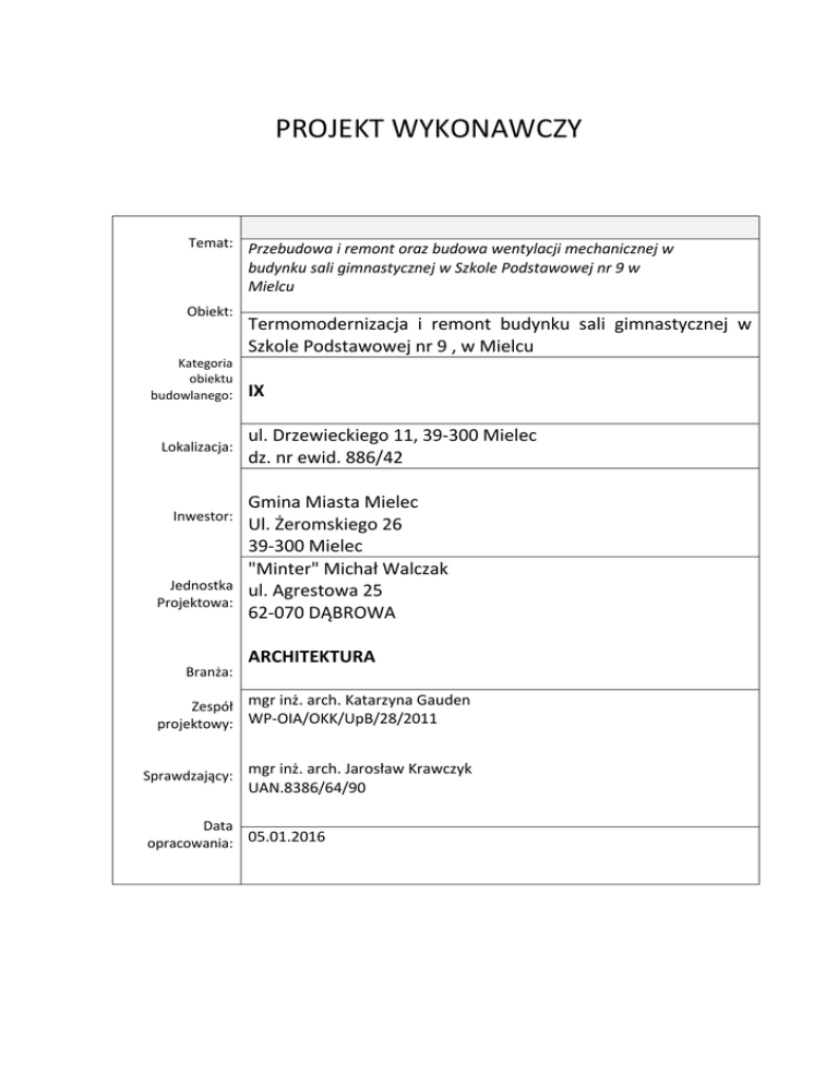 PROJEKT WYKONAWCZY Temat: Przebudowa i remont oraz budowa wentylacji mechanicznej w budynku sali gimnastycznej w Szkole Podstawowej nr 9 w Mielcu Obiekt: Kategoria obiektu budowlanego: Lokalizacja: Inwestor: Jednostka Projektowa: Branża: Termomodernizacja i remont budynku sali gimnastycznej w Szkole Podstawowej nr 9 , w Mielcu IX ul. Drzewieckiego 11, 39-300 Mielec dz. nr ewid. 886/42 Gmina Miasta Mielec Ul. Żeromskiego 26 39-300 Mielec "Minter" Michał Walczak ul. Agrestowa 25 62-070 DĄBROWA ARCHITEKTURA Zespół mgr inż. arch. Katarzyna Gauden projektowy: WP-OIA/OKK/UpB/28/2011 Sprawdzający: mgr inż. arch. Jarosław Krawczyk UAN.8386/64/90 Data opracowania: 05.01.2016 Termomodernizacja i remont budynku sali gimnastycznej w Szkole Podstawowej nr 9, w Mielcu SPIS TREŚCI SPIS TREŚCI ......................................................................................................................................... 2 1. DOKUMENTY ZWIĄZANE Z PROJEKTEM .................................................................................. 4 1.1. UPRAWNIENIA PROJEKTOWE MGR INŻ. ARCH. KATARZYNY GAUDEN.................................... 4 1.2. ZAŚWIADCZENIE O PRZYNALEŻNOŚCI DO IZBY MGR INŻ. ARCH. KATARZYNY GAUDEN ......... 6 1.3. UPRAWNIENIA PROJEKTOWE MGR INŻ. ARCH. JAROSŁAWA KRAWCZYKA............................. 7 1.4. ZAŚWIADCZENIE O PRZYNALEŻNOŚCI DO IZBY MGR INŻ. ARCH. JAROSŁAWA KRAWCZYKA .. 9 1.5. OŚWIADCZENIE PROJEKTANTA .............................................................................................. 10 2. PLAN ZAGOSPODAROWANIA DZIAŁKI ................................................................................... 11 2.1. Przedmiot opracowania ......................................................................................................... 11 2.2. Istniejący stan zagospodarowania działki .............................................................................. 11 2.3. Projektowane zagospodarowanie działki .............................................................................. 11 2.4. Dane dotyczące ochrony konserwatorskiej ........................................................................... 11 2.5. Dane określające wpływ eksploatacji górniczej na teren zamierzenia budowlanego znajdującego się w granicach terenu górniczego......................................................................... 11 3. PROJEKT WYKONAWCZY ........................................................................................................ 12 3.1. Dane zlecenia ......................................................................................................................... 12 3.2. Podstawa opracowania .......................................................................................................... 12 3.3. Opis techniczny ...................................................................................................................... 12 4. PRZEDMIOT ZAMÓWIENIA .................................................................................................... 13 5. OPIS STANU ISTNIEJĄCEGO .................................................................................................... 13 5.1. Dane ogólne ........................................................................................................................... 13 5.2. Dane konstrukcyjno-materiałowe obiektu ............................................................................ 14 5.3. Ocena ciepłochłonności budynku .......................................................................................... 14 6. ROZWIĄZANIA ARCHITEKTONICZNO - BUDOWLANE............................................................. 14 6.1. Zakres projektowy.................................................................................................................. 14 6.2. Prace przygotowawcze-rozbiórkowe ..................................................................................... 15 6.3. Stolarka zewnętrzna............................................................................................................... 16 6.4. Posadzki ................................................................................................................................. 17 6.5. Schody i pochylnie zewnętrzne i wewnętrzne ....................................................................... 18 6.6. Izolacje przeciwwilgociowe .................................................................................................... 20 6.7. Wykończenie wewnętrzne ..................................................................................................... 20 6.8. Parapety zewnętrzne i wewnętrzne ...................................................................................... 20 6.9. Prace towarzyszące wymianie instalacji C.O. i przebudowie C.W.U ..................................... 21 6.10. Sposób zapewnienia warunków niezbędnych do korzystania z obiektu przez osoby niepełnosprawne.......................................................................................................................... 21 6.11. Wpływ obiektu na środowisko oraz zdrowie ludzi i obiektów sąsiednich .......................... 21 6.12. Informacja o obszarze oddziaływania obiektu .................................................................... 21 6.13. Prace remontowe i związane z nimi uregulowania prawne w zakresie ochrony ptaków .. 21 7. WARUNKI OCHRONY POŻAROWEJ ........................................................................................ 22 7.1. Dane ogólne ........................................................................................................................... 22 7.2. Ocena zagrożenia wybuchem ................................................................................................ 22 7.3. Warunki ewakuacji.........................................................................................