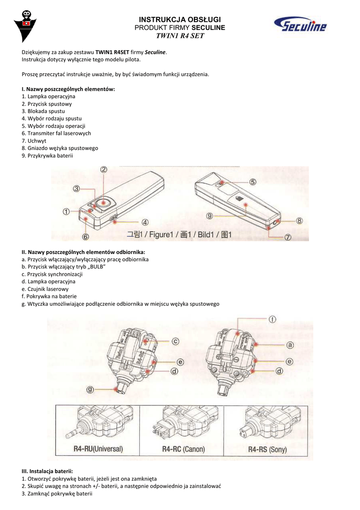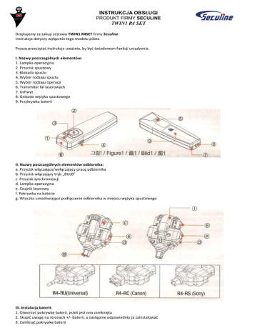 INSTRUKCJA OBSŁUGI PRODUKT FIRMY SECULINE TWIN1 R4 SET Dziękujemy za zakup zestawu TWIN1 R4SET firmy Seculine. Instrukcja dotyczy wyłącznie tego modelu pilota. Proszę przeczytać instrukcje uważnie, by być świadomym funkcji urządzenia. I. Nazwy poszczególnych elementów: 1. Lampka operacyjna 2. Przycisk spustowy 3. Blokada spustu 4. Wybór rodzaju spustu 5. Wybór rodzaju operacji 6. Transmiter fal laserowych 7. Uchwyt 8. Gniazdo wężyka spustowego 9. Przykrywka baterii II. Nazwy poszczególnych elementów odbiornika: a. Przycisk włączający/wyłączający pracę odbiornika b. Przycisk włączający tryb „BULB” c. Przycisk synchronizacji d. Lampka operacyjna e. Czujnik laserowy f. Pokrywka na baterie g. Wtyczka umożliwiające podłączenie odbiornika w miejscu wężyka spustowego III. Instalacja baterii: 1. Otworzyć pokrywkę baterii, jeżeli jest ona zamknięta 2. Skupić uwagę na stronach +/- baterii, a następnie odpowiednio ja zainstalować 3. Zamknąć pokrywkę baterii IV. Wybór rodzaju operacji: 1. Pilot R3-SET posiada trzy typy operacji – uniwersalny pilot laserowy, system odbioru prywatnego oraz tryb latarki. 2. Tryb operacji może być konfigurowany przez przycisk wyboru operacji. 3. Jeśli docelowy aparat posiada zintegrowany odbiornik podczerwieni i odbiornik ten jest używany do odbioru sygnału IR, powinno sie użyć uniwersalnego spustu. Przycisk wybory operacji powinien być ustawiony na LIT. 4. Jeśli używany jest dodatkowy (zewnętrzny) odbiornik podczerwieni firmy Seculine odbiornik, należy ustawić opcje odbioru prywatnego. Przycisk wybory operacji powinien być ustawiony na ¤. 5. Jeśli przycisk wyboru operacji ustawiony jest na (żarówkę) to R3-SET pełni funkcje latarki. V. Włączanie i wyłączanie zasilania odbiornika: 1. Wybór rodzaju zasilania i rodzaju spustu ustawić w prawidłowej pozycji. Do wyboru tryb odbiornika wyłączonego – OFF, tryb pilota laserowego, tryb wężyka spustowego – ON, tryb długiego naświetlania - BULB 2. Jeżeli odbiornik nie jest podłączony do aparatu, a jego zasilanie jest włączone to po 5 minutach nastąpi automatyczne odłączenie zasilania odbiornika. Włączenie zasilania odbiornika nastąpi po ponownym podłączeniu go do aparatu. VI. Wybór rodzaju spustu w odbiorniku: 1. Odbiornik ma dwa typy spustu, normalny pilot radiowy i tryb wężyka spustowego. 2. Ustaw odbiornik na ON, aby uzyskać tryb spustu normalnego. 3. Ustaw odbiornik na BULB, aby uzyskać tryb długiego czasu naświetlania. Jedno przyciśniecie klawisza spustu spowoduje otwarcie spustu docelowego aparatu, nastąpi rozpoczęcie naświetlania kompozycji. Ponownie wciśniecie klawisza spustu spowoduje jego zamkniecie. VII. Synchronizacja pomiędzy nadajnikiem, a odbiornikiem: 1. Przed użyciem zestawu TWIN1 R3 należy ustawić synchronizacje pomiędzy pilotem, a odbiornikiem. 2. Wystarczy raz ustawić synchronizacje. 3. Należy odłączyć kabel, jeżeli jest on podłączony w celu działania ustawionej synchronizacji. 4. Ustaw przycisk wybory operacji nadajnika na ¤, a odbiornik przełącz w tryb ON 5. Naciśnij przycisk synchronizacji odbiornika przez 2 sekundy (igła), a lampka odbiornika powinna migać. 6. Wyrównaj odległość pomiędzy sensorem nadajnika, a sensorem odbiornika, a następnie naciśnij przycisk spustu. 7. Jeżeli odbiornik odbierze sygnał nadajnika lampka będzie migać szybko, następnie się wyłączy. 8. Naciśnij ponownie przycisk spustu. Konfiguruj wtedy, gdy lampka nadajnika miga normalnie. VIII. Jak używać pilota laserowego aparatami z wbudowanym odbiornikiem podczerwieni: 1. Prosimy ustawić przycisk operacji na LIT. 2. Prosimy rozłączyć kabel wężyka spustowego, jeżeli jest podłączony. 3. Ustawić docelowy aparat w tryb bezprzewodowej kontroli. 4. Prosimy nacisnąć klawisz akcji do końca, aby aparat dobrał ostrość i zrobił zdjęcie. *Niektóre aparaty mogą zrobić zdjęcie bez uprzedniej konieczności dobrania ostrości. W tym celu prosimy zajrzeć do instrukcji obsługi aparatu. IX. Jak używać trybu opóźnionego spustu: 1. Prosimy ustawić przycisk operacji na ··• 2. Prosimy nacisnąć przycisk akcji do końca. Aparat powinien wykonać zdjęcie po 2 sekundach od chwili wciśnięcia klawisza. 3. Dla niektórych modeli firmy Nikon i Pentax, aparaty te powinny być ustawione w trybie opóźnionego spustu. (opis trybu w instrukcji aparatu) X. Jak używać pilota, jako wężyk spustowy: 1. Połączyć nadajnik z aparatem za pomocą kabla. 2. Prosimy nacisnąć przycisk akcji delikatnie, w celu dobrania ostrości przez aparat. 3. Prosimy nacisnąć przycisk do końca, w celu zrobienia zdjęcia. 4. Podczas używania trybu spustu kablowego bateria nie jest używana. XI. Jak używać pilota laserowego z dodatkowym odbiornikiem: 1. Prosimy podłączyć odbiornik do aparatu w miejsce wężyka spustowego. 2. Prosimy ustawić tryb na odbiorniku – ON 3. Prosimy włączyć pilot w trybie kanału indywidualnego. 4. W celu uzyskania optymalnego zasięgu prosimy ustawić odbiornik w odpowiedniej pozycji, natomiast nadajnik prosimy skierować w stronę aparatu. 5. Pilot pracuje, jako bezprzewodowy wężyk spustowy zawierając wszystkie jego funkcje, czyli: a) Tryb wyzwalania natychmiastowego – całkowite wciśnięcie klawisza spowoduje wyostrzenie i wyzwolenie migawki b) Tryb przycisku dwuetapowego – dociśnięcie klawisza do połowy spowoduje wyostrzenie kadru, dociśnięcie do końca spowoduje wyzwolenie migawki. c) Tryb zdjęć seryjnych – wciśnięcie i przesuniecie klawisza do przodu spowoduje ciągłe ostrzenie i wyzwalanie migawki aż do momentu odblokowania klawisza. d) Tryb BULB wciśnięcie i przesuniecie klawisza do przodu spowoduje wyostrzenie i rozpoczęcie naświetlania ekspozycji. Zwolnienie klawisza doprowadzi do wyzwolenia migawki. XII. Jak używać pilota, jako wężyka spustowego w trybie BULB: 1. Tryb BULB jest używany w celu wydłużenia czasu naświetlania eks