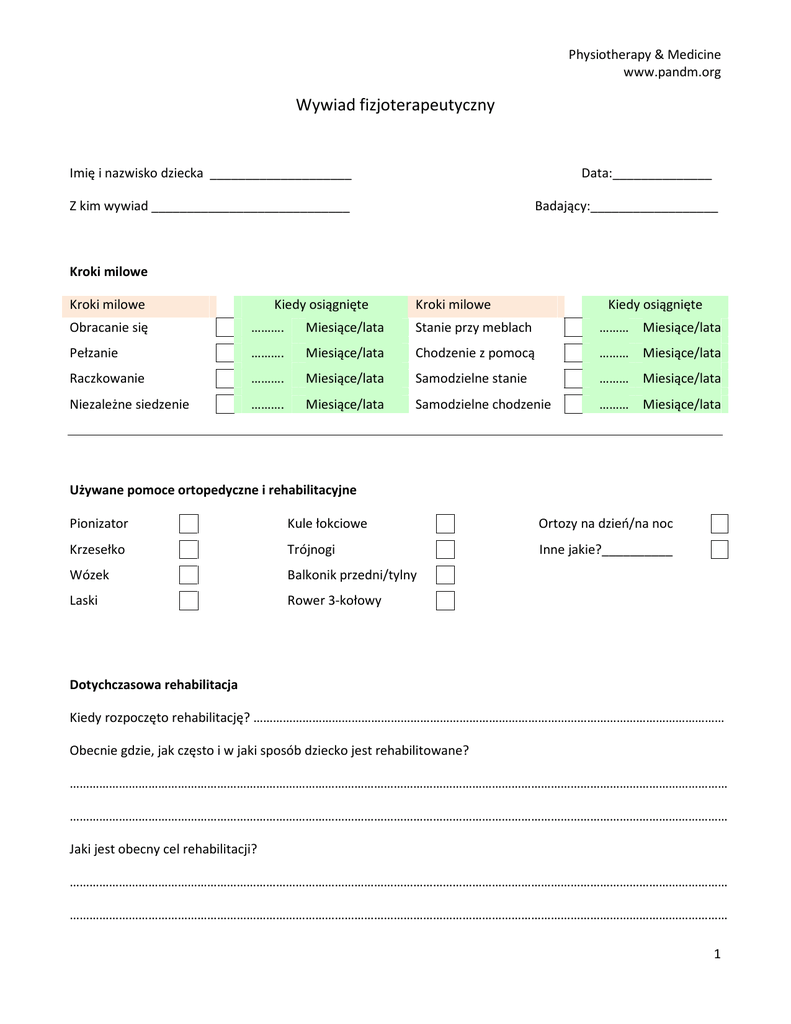 Physiotherapy & Medicine www.pandm.org Wywiad fizjoterapeutyczny Data:______________ Imię i nazwisko dziecka ____________________ Z kim wywiad ____________________________ Badający:__________________ Kroki milowe Kroki milowe Kiedy osiągnięte Kroki milowe Kiedy osiągnięte Obracanie się ………. Miesiące/lata Stanie przy meblach ……… Miesiące/lata Pełzanie ………. Miesiące/lata Chodzenie z pomocą ……… Miesiące/lata Raczkowanie ………. Miesiące/lata Samodzielne stanie ……… Miesiące/lata Niezależne siedzenie ………. Miesiące/lata Samodzielne chodzenie ……… Miesiące/lata Używane pomoce ortopedyczne i rehabilitacyjne Pionizator Kule łokciowe Ortozy na dzień/na noc Krzesełko Trójnogi Inne jakie?__________ Wózek Balkonik przedni/tylny Laski Rower 3-kołowy Dotychczasowa rehabilitacja Kiedy rozpoczęto rehabilitację? ……………………………………………………………………………………………………………………………… Obecnie gdzie, jak często i w jaki sposób dziecko jest rehabilitowane? ………………………………………………………………………………………………………………………………………………………………………………… ………………………………………………………………………………………………………………………………………………………………………………… Jaki jest obecny cel rehabilitacji? ………………………………………………………………………………………………………………………………………………………………………………… ………………………………………………………………………………………………………………………………………………………………………………… 1 Główny problem zgłaszany przez pacjenta Physiotherapy & Medicine www.pandm.org ………………………………………………………………………………………………………………………………………………………………………………… ………………………………………………………………………………………………………………………………………………………………………………… Główny problem zgłaszany przez rodziców ………………………………………………………………………………………………………………………………………………………………………………… ………………………………………………………………………………………………………………………………………………………………………………… ………………………………………………………………………………………………………………………………………………………………………………… Główny problem obserwowany przez terapeutę ………………………………………………………………………………………………………………………………………………………………………………… ………………………………………………………………………………………………………………………………………………………………………………… ………………………………………………………………………………………………………………………………………………………………………………… ………………………………………………………………………………………………………………………………………………………………………………… ………………………………………………………………………………………………………………………………………………………………………………… Umiejętności w zakresie dużej motoryki leży -> siedzi + ± - chodzi na palcach + ± - klęk prosty + ± - siedzi ->stoi + ± - chodzi na piętach + ± - chodzenie w klęku prostym + ± - stoi z pomocą + - 8 przysiadów + ± - klęk jednonóż prawa + ± - stoi bez pomocy + - pozycja czworacza + ± - klęk jednonóż lewa + ± - wstaje prawą nogą + ± - wstaje lewą nogą + ± - stoi 1 noga prawa + ± - czworakowanie stoi 1 noga lewa + ± - typ czworakowania stoi na palcach + ± - + naprz żabka 2