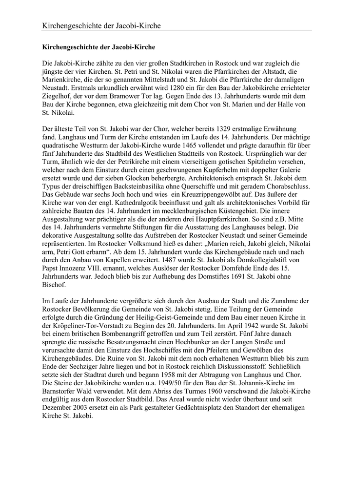 Kirchengeschichte der Jacobi-Kirche Kirchengeschichte der Jacobi-Kirche Die Jakobi-Kirche zählte zu den vier großen Stadtkirchen in Rostock und war zugleich die jüngste der vier Kirchen. St. Petri und St. Nikolai waren die Pfarrkirchen der Altstadt, die Marienkirche, die der so genannten Mittelstadt und St. Jakobi die Pfarrkirche der damaligen Neustadt. Erstmals urkundlich erwähnt wird 1280 ein für den Bau der Jakobikirche errichteter Ziegelhof, der vor dem Bramower Tor lag. Gegen Ende des 13. Jahrhunderts wurde mit dem Bau der Kirche begonnen, etwa gleichzeitig mit dem Chor von St. Marien und der Halle von St. Nikolai. Der älteste Teil von St. Jakobi war der Chor, welcher bereits 1329 erstmalige Erwähnung fand. Langhaus und Turm der Kirche entstanden im Laufe des 14. Jahrhunderts. Der mächtige quadratische Westturm der Jakobi-Kirche wurde 1465 vollendet und prägte daraufhin für über fünf Jahrhunderte das Stadtbild des Westlichen Stadtteils von Rostock. Ursprünglich war der Turm, ähnlich wie der der Petrikirche mit einem vierseitigem gotischen Spitzhelm versehen, welcher nach dem Einsturz durch einen geschwungenen Kupferhelm mit doppelter Galerie ersetzt wurde und der sieben Glocken beherbergte. Architektonisch entsprach St. Jakobi dem Typus der dreischiffigen Backsteinbasilika ohne Querschiffe und mit geradem Chorabschluss. Das Gebäude war sechs Joch hoch und wies ein Kreuzrippengewölbt auf. Das äußere der Kirche war von der engl. Kathedralgotik beeinflusst und galt als architektonisches Vorbild für zahlreiche Bauten des 14. Jahrhundert im mecklenburgischen Küstengebiet. Die innere Ausgestaltung war prächtiger als die der anderen drei Hauptpfarrkirchen. So sind z.B. Mitte des 14. Jahrhunderts vermehrte Stiftungen für die Ausstattung des Langhauses belegt. Die dekorative Ausgestaltung sollte das Aufstreben der Rostocker Neustadt und seiner Gemeinde repräsentierten. Im Rostocker Volksmund hieß es daher: „Marien reich, Jakobi gleich, Nikolai arm, Petri Gott erbarm“. Ab dem 15. Jahrhundert wurde das Kirchengebäude nach und nach durch den Anbau von Kapellen erweitert. 1487 wurde St. Jakobi als Domkollegialstift von Papst Innozenz VIII. ernannt, welches Auslöser der Rostocker Domfehde Ende des 15. Jahrhunderts war. Jedoch blieb bis zur Aufhebung des Domstiftes 1691 St. Jakobi ohne Bischof. Im Laufe der Jahrhunderte vergrößerte sich durch den Ausbau der Stadt und die Zunahme der Rostocker Bevölkerung die Gemeinde von St. Jakobi stetig. Eine Teilung der Gemeinde erfolgte durch die Gründung der Heilig-Geist-Gemeinde und dem Bau einer neuen Kirche in der Kröpeliner-Tor-Vorstadt zu Beginn des 20. Jahrhunderts. Im April 1942 wurde St. Jakobi bei einem britischen Bombenangriff getroffen und zum Teil zerstört. Fünf Jahre danach sprengte die russische Besatzungsmacht einen Hochbunker an der Langen Straße und verursachte damit den Einsturz des Hochschiffes mit den Pfeilern und Gewölben des Kirchengebäudes. Die Ruine von St. Jakobi mit dem noch erhaltenen Westturm blieb bis zum Ende der Sechziger Jahre liegen und bot in Rostock reichlich Diskussionsstoff. Schließlich setzte sich der Stadtrat durch und begann 1958 mit der Abtragung von Langhaus und Chor. Die Steine der Jakobikirche wurden u.a. 1949/50 für den Bau der St. Johannis-Kirche im Barnstorfer Wald verwendet. Mit dem Abriss des Turmes 1960 verschwand die Jakobi-Kirche endgültig aus dem Rostocker Stadtbild. Das Areal wurde nicht wieder überbaut und seit Dezember 2003 ersetzt ein als Park gestalteter Gedächtnisplatz den Standort der ehemaligen Kirche St. Jakobi.