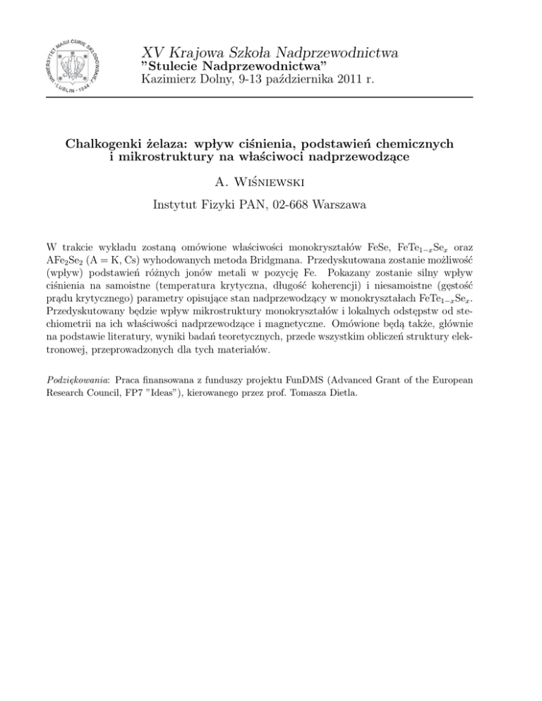 XV Krajowa Szkola Nadprzewodnictwa ”Stulecie Nadprzewodnictwa” Kazimierz Dolny, 9-13 października 2011 r. Chalkogenki żelaza: wplyw ciśnienia, podstawień chemicznych i mikrostruktury na wlaściwoci nadprzewodza֒ce A. Wiśniewski Instytut Fizyki PAN, 02-668 Warszawa W trakcie wykladu zostana֒ omówione wlaściwości monokrysztalów FeSe, FeTe1−x Sex oraz AFe2 Se2 (A = K, Cs) wyhodowanych metoda Bridgmana. Przedyskutowana zostanie możliwość (wplyw) podstawień różnych jonów metali w pozycje֒ Fe. Pokazany zostanie silny wplyw ciśnienia na samoistne (temperatura krytyczna, dlugość koherencji) i niesamoistne (ge֒stość pra֒du krytycznego) parametry opisuja֒ce stan nadprzewodza֒cy w monokrysztalach FeTe1−x Sex . Przedyskutowany be֒dzie wplyw mikrostruktury monokrysztalów i lokalnych odste֒pstw od stechiometrii na ich wlaściwości nadprzewodza֒ce i magnetyczne. Omówione be֒da֒ także, glównie na podstawie literatury, wyniki badań teoretycznych, przede wszystkim obliczeń struktury elektronowej, przeprowadzonych dla tych materialów. Podzie֒kowania: Praca finansowana z funduszy projektu FunDMS (Advanced Grant of the European Research Council, FP7 ”Ideas”), kierowanego przez prof. Tomasza Dietla.