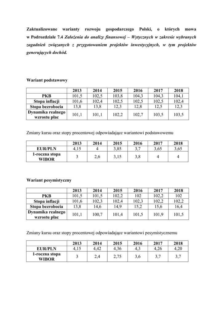 Zaktualizowane warianty rozwoju gospodarczego Polski, o których mowa w Podrozdziale 7.4 Założenia do analizy finansowej – Wytycznych w zakresie wybranych zagadnień związanych z przygotowaniem projektów inwestycyjnych, w tym projektów generujących dochód. Wariant podstawowy PKB Stopa inflacji Stopa bezrobocia Dynamika realnego wzrostu płac 2013 101,5 101,6 13,8 2014 102,5 102,4 13,8 2015 103,8 102,5 12,3 2016 104,3 102,5 12,8 2017 104,3 102,5 12,5 2018 104,1 102,4 12,3 101,1 101,1 102,2 102,7 103,5 103,5 Zmiany kursu oraz stopy procentowej odpowiadające wariantowi podstawowemu EUR/PLN 1-roczna stopa WIBOR 2013 4,15 2014 4 2015 3,85 2016 3,7 2017 3,65 2018 3,65 3 2,6 3,15 3,8 4 4 2013 101,5 101,6 13,8 2014 101,5 102,3 14,6 2015 102,2 102,4 14,9 2016 102 102,3 15,2 2017 102,2 102,2 15,6 2018 102 102,2 16,4 101,1 100,7 101,4 101,5 101,9 101,5 Wariant pesymistyczny PKB Stopa inflacji Stopa bezrobocia Dynamika realnego wzrostu płac Zmiany kursu oraz stopy procentowej odpowiadające wariantowi pesymistycznemu EUR/PLN 1-roczna stopa WIBOR 2013 4,15 2014 4,42 2015 4,36 2016 4,3 2017 4,26 2018 4,20 3 2,4 2,75 3,6 3,7 3,7