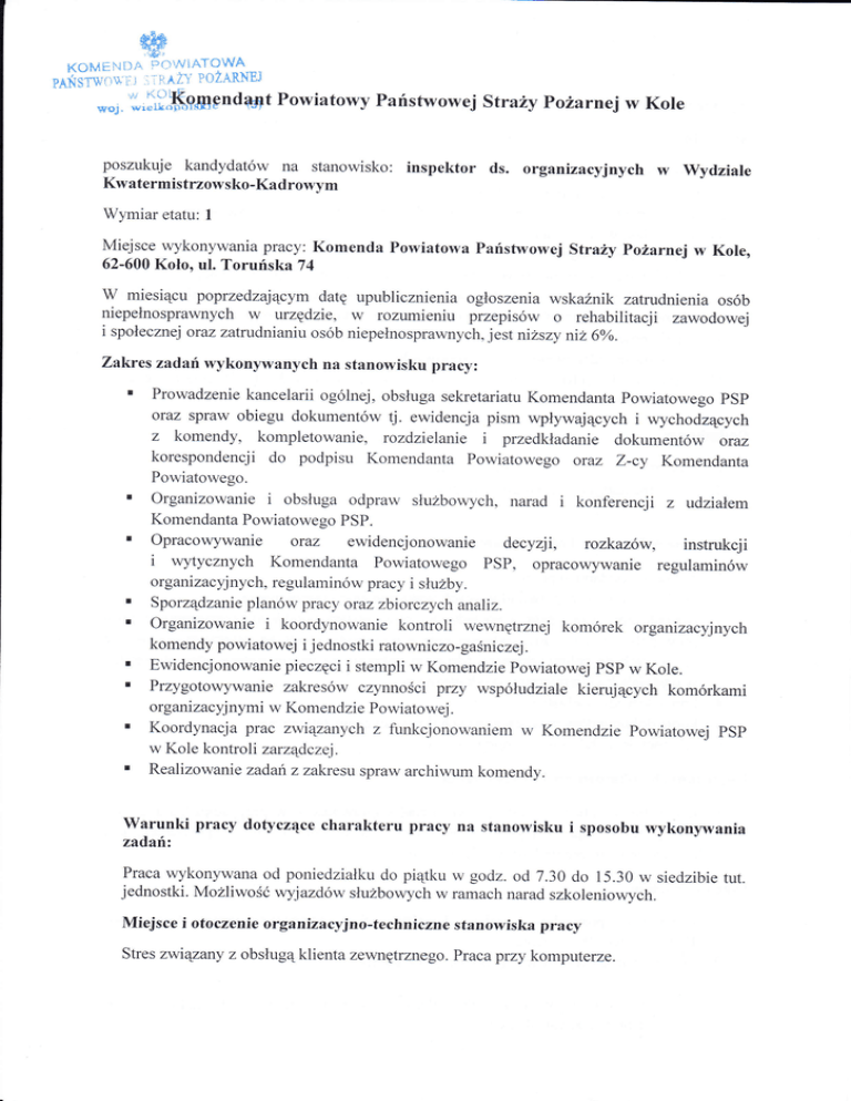 Miejsce wykonywania pracy: Komenda Powiatowa Państwowej Straży Pożarnej w Kole,