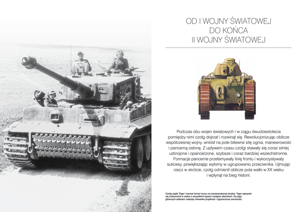 OD I WOJNY ŚWIATOWEJ DO KOŃCA II WOJNY ŚWIATOWEJ Podczas obu wojen światowych i w ciągu dwudziestolecia pomiędzy nimi czołg dojrzał i rozwinął się. Rewolucjonizując oblicze współczesnej wojny, wniósł na pole bitewne siłę ognia, manewrowość i pancerną osłonę. Z upływem czasu czołgi stawały się coraz silniej uzbrojone i opancerzone, szybsze i coraz bardziej wszechstronne. Formacje pancerne przełamywały linię frontu i wykorzystywały sukcesy, powiększając wyłomy w ugrupowaniu przeciwnika. Ujmując rzecz w skrócie, czołg odmienił oblicze pola walki w XX wieku i wpłynął na bieg historii. Czołg ciężki Tiger I wznosi tuman kurzu na nieutwardzonej drodze. Tiger spisywał się znakomicie w walce z wszystkimi typami czołgów alianckich. Do jego głównych słabości należały niewielka prędkość i ograniczona zwrotność.