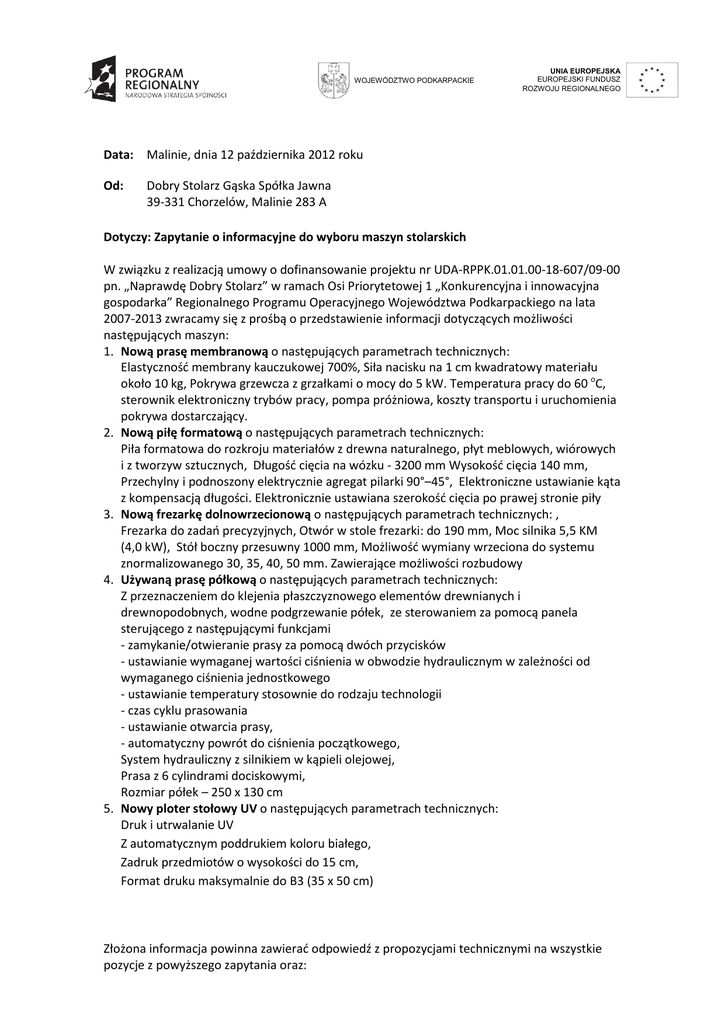 WOJEWÓDZTWO PODKARPACKIE UNIA EUROPEJSKA EUROPEJSKI FUNDUSZ ROZWOJU REGIONALNEGO Data: Malinie, dnia 12 października 2012 roku Od: Dobry Stolarz Gąska Spółka Jawna 39-331 Chorzelów, Malinie 283 A Dotyczy: Zapytanie o informacyjne do wyboru maszyn stolarskich W związku z realizacją umowy o dofinansowanie projektu nr UDA-RPPK.01.01.00-18-607/09-00 pn. „Naprawdę Dobry Stolarz” w ramach Osi Priorytetowej 1 „Konkurencyjna i innowacyjna gospodarka” Regionalnego Programu Operacyjnego Województwa Podkarpackiego na lata 2007-2013 zwracamy się z prośbą o przedstawienie informacji dotyczących możliwości następujących maszyn: 1. Nową prasę membranową o następujących parametrach technicznych: Elastyczność membrany kauczukowej 700%, Siła nacisku na 1 cm kwadratowy materiału około 10 kg, Pokrywa grzewcza z grzałkami o mocy do 5 kW. Temperatura pracy do 60 oC, sterownik elektroniczny trybów pracy, pompa próżniowa, koszty transportu i uruchomienia pokrywa dostarczający. 2. Nową piłę formatową o następujących parametrach technicznych: Piła formatowa do rozkroju materiałów z drewna naturalnego, płyt meblowych, wiórowych i z tworzyw sztucznych, Długość cięcia na wózku - 3200 mm Wysokość cięcia 140 mm, Przechylny i podnoszony elektrycznie agregat pilarki 90°–45°, Elektroniczne ustawianie kąta z kompensacją długości. Elektronicznie ustawiana szerokość cięcia po prawej stronie piły 3. Nową frezarkę dolnowrzecionową o następujących parametrach technicznych: , Frezarka do zadań precyzyjnych, Otwór w stole frezarki: do 190 mm, Moc silnika 5,5 KM (4,0 kW), Stół boczny przesuwny 1000 mm, Możliwość wymiany wrzeciona do systemu znormalizowanego 30, 35, 40, 50 mm. Zawierające możliwości rozbudowy 4. Używaną prasę półkową o następujących parametrach technicznych: Z przeznaczeniem do klejenia płaszczyznowego elementów drewnianych i drewnopodobnych, wodne podgrzewanie półek, ze sterowaniem za pomocą panela sterującego z następującymi funkcjami - zamykanie/otwieranie prasy za pomocą dwóch przycisków - ustawianie wymaganej wartości ciśnienia w obwodzie hydraulicznym w zależności od wymaganego ciśnienia jednostkowego - ustawianie temperatury stosownie do rodzaju technologii - czas cyklu prasowania - ustawianie otwarcia prasy, - automatyczny powrót do ciśnienia początkowego, System hydrauliczny z silnikiem w kąpieli olejowej, Prasa z 6 cylindrami dociskowymi, Rozmiar półek – 250 x 130 cm 5. Nowy ploter stołowy UV o następujących parametrach technicznych: Druk i utrwalanie UV Z automatycznym poddrukiem koloru białego, Zadruk przedmiotów o wysokości do 15 cm, Format druku maksymalnie do B3 (35 x 50 cm) Złożona informacja powinna zawierać odpowiedź z propozycjami technicznymi na wszystkie pozycje z powyższego zapytania oraz: • nazwę i adres oferenta, • opis nawiązujący do parametrów wyszczególnionych w zapytaniu ofertowym, Wskazane jest, by informacja zawierała również inne warunki tj.: gwarancja, dodatkowe funkcje dostawy, maksymalny czas realizacji. Dodatkowych informacji w sprawach szczegółowych udziela: Pan Wojciech Gąska tel. 509 990 056, 17 7743700, fax 17 7743717, e-mal: [email protected] Z poważaniem, -------------------------Wojciech Gąska wspólnik/dyrektor handlowy