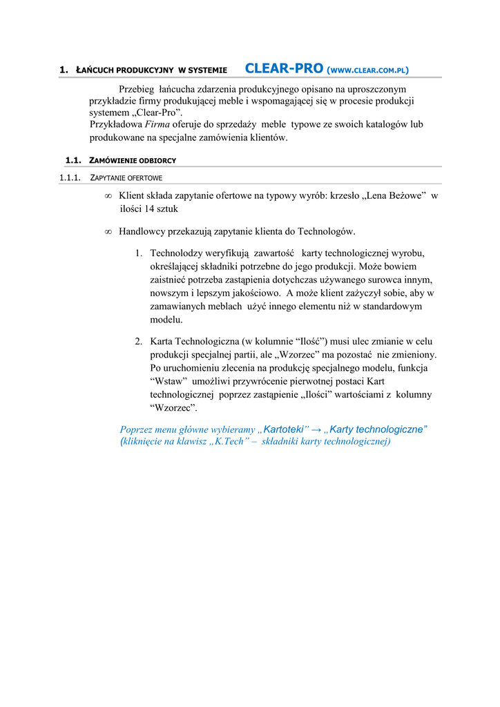 1. ŁAŃCUCH PRODUKCYJNY W SYSTEMIE CLEAR-PRO (WWW.CLEAR.COM.PL) Przebieg łańcucha zdarzenia produkcyjnego opisano na uproszczonym przykładzie firmy produkującej meble i wspomagającej się w procesie produkcji systemem „Clear-Pro”. Przykładowa Firma oferuje do sprzedaŜy meble typowe ze swoich katalogów lub produkowane na specjalne zamówienia klientów. 1.1. ZAMÓWIENIE ODBIORCY 1.1.1. ZAPYTANIE OFERTOWE • Klient składa zapytanie ofertowe na typowy wyrób: krzesło „Lena BeŜowe” w ilości 14 sztuk • Handlowcy przekazują zapytanie klienta do Technologów. 1. Technolodzy weryfikują zawartość karty technologicznej wyrobu, określającej składniki potrzebne do jego produkcji. MoŜe bowiem zaistnieć potrzeba zastąpienia dotychczas uŜywanego surowca innym, nowszym i lepszym jakościowo. A moŜe klient zaŜyczył sobie, aby w zamawianych meblach uŜyć innego elementu niŜ w standardowym modelu. 2. Karta Technologiczna (w kolumnie “Ilość”) musi ulec zmianie w celu produkcji specjalnej partii, ale „Wzorzec” ma pozostać nie zmieniony. Po uruchomieniu zlecenia na produkcję specjalnego modelu, funkcja “Wstaw” umoŜliwi przywrócenie pierwotnej postaci Kart technologicznej poprzez zastąpienie „Ilości” wartościami z kolumny “Wzorzec”. Poprzez menu główne wybieramy „Kartoteki” → „Karty technologiczne” (kliknięcie na klawisz „K.Tech” – składniki karty technologicznej) Na ekranie karty technologicznej surowce pokazane są czarnym kolorem, półwyroby –niebieskim, oraz robocizna –fioletowym. (Karta moŜe takŜe zawierać usługi obce i narzędzia). Półwyroby mają swoje własne karty technologiczne, które mogą zawierać takŜe półwyroby, surowce, itd. Ilość poziomów zagnieŜdŜenia – dowolna. 1.1.2. 1.1.2.1. KALKULACJE PRODUKCYJNE KALKULACJA WYROBU Karta technologiczna jest podstawą do przekalkulowania kosztów produkcji wyrobu (bazą do kalkulacji wartościowych mogą być ceny średnie surowców lub ceny ostatniego zakupu). Kalkulację moŜna wykonać wielowariantowo z uwzględnieniem: robocizny, usług obcych, narzędzi. Półwyroby zawarte w karcie mogą być kalkulowane jako „nie rozwinięte” – będą w cenach własnych lub „rozwinięte” do najniŜszego poziomu składników – będą w cenach surowców. Wynik kalkulacji wyrobów Poprzez menu główne wybieramy „Analizy” → „Kalkulacje” → „Wyrobów” 1.1.2.2. ZAPOTRZEBOWANIE MATERIAŁOWE Zadaniem Technologów (ewentualnie handlowców ) jest takŜe wycena zamówienia odbiorcy. Podstawą do powstania takiej analizy są aktualne karty technologiczne i ceny materiałowe. Analiza umoŜliwia jednoczesne przekalkulowanie dowolnej ilości róŜnych wyrobów (składających się np. na jedno zamówienie od klienta) i stworzenie zapotrzebowania na surowce, robociznę i ew. inne składniki z karty technologicznej. W efekcie pokazane zostanie łączne zapotrzebowanie ilościowe i wartościowe dla zrealizowania zamówienia (koszty bezpośrednie). Poprzez menu główne wybieramy „Analizy” → „Kalkulacje” → „Zapotrzebowań” 1.1.2.3. KALKULACJE CEN W oddzielnym module „Kalkulacje cen” moŜna, za pomocą zadanych, własnych algorytmów skalkulować ceny magazynowe i sprzedaŜy poszczególnych wyrobów. Ceny mogą uwzględniać koszty materiałów i robocizny (informacje z bazy) oraz określone w algorytmach, własne narzuty i marŜe. Poprzez menu główne wybieramy „Okresowe” → „Kalkulacje cen” W efekcie powstaje oferta cenowa na zapytanie klienta . 1.1.3. REJESTRACJA ZAMÓWIENIA ODBIORCY Kolejnym etapem jest potwierdzenie przez odbiorcę naszej oferty cenowej oficjalnym zamówieniem. Dział handlu rejestruje zamówienie od klienta. Na zamówieniu wpisana zostają uzgodnione ceny i rabaty. Informacje te zostaną uŜyte (jako podpowiedź) przy wystawianiu faktury. PoniŜej ekran ze składnikami zamówienia. W przykładzie zamówienie jest jednopozycyjne - na 14 sztuk krzeseł. Poprzez menu główne wybieramy „Kartoteki” → „Zamówienia” → „Od odbiorców” 1.2. ZLECENIE PRODUKCYJNE 1.2.1. WERYFIKACJA PLANU PRODUKCJI Analiza aktualnych zadań produkcyjnych to zadanie Szefa produkcji. Aby podjąć racjonalne decyzje, konfrontuje plan produkcji z aktualnymi zamówieniami i stanami magazynowymi. W tym celu uruchamia „Analizę wykonalności zamówień”. Poprzez menu główne wybieramy „Analizy” → „Wykonalności zamówień” Analiza tworzy się na podstawie aktywnych zamówień odbiorców. Pokazuje wyroby jeszcze nie zrealizowane z zamówień i podpowiada ilości, jakie powinny zostać wyprodukowane. W pokazanym przykładzie, analizowane są wspólnie dwa aktywne zamówienia. Rozpatrujemy krzesło LENA beŜowe (24 sztuki trzeba zrealizować, 4 sztuki są w magazynie, 10 w produkcji, a do uzupełnienia minimum magazynowego potrzeba 2 sztuk) Sugerowana ilość do wyprodukowania to 10 (24-6-10+2) krzeseł LENA : na potrzeby 2 zamówień i minimum magazynowego. Taka analiza moŜe być wysłana do uprawnionego uŜytkownika za pomocą tzw. powiadomienia systemowego: „F11Wyślij”. 1.2.2. URUCHOMIENIE ZLECENIA PRODUKCYJNEGO Szef produkcji uruchamia zlecenie produkcyjne na 10 sztuk krzeseł „Lena BeŜowych”. Zlecenie moŜna uruchamiać z poziomu listy zleceń. MoŜna teŜ uruchomić zlecenie z poziomu „Analizy wykonalności zamówień”, czy zamówienia odbiorcy. Poprzez menu główne wybieramy „Kartoteki” → „Zlecenia” 1.2.3. KARTA ZLECENIOWA Do zlecenia, w sposób automatyczny tworzy się karta zleceniowa. Zawiera ona ilości składników, które naleŜy wydać na produkcję tego konkretnego zlecenia – czyli 10-ciu krzeseł „Lena” (ilości z karty technologicznej przemnoŜone przez ilość wyrobu zadeklarowaną na zleceniu). OD TEJ PORY WSZELKIE RUCHY NA ZLECENIU SYSTEM KONTROLUJE POPRZEZ KARTĘ ZLECENIOWĄ. Poprzez menu główne wybieramy „Kartoteki” → „Zlecenia” (kliknięci