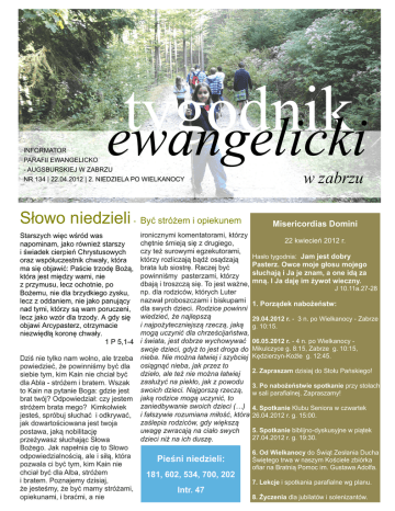 tygodnik ewangelicki INFORMATOR PARAFII EWANGELICKO - AUGSBURSKIEJ W ZABRZU NR 134 | 22.04.2012 | 2. NIEDZIELA PO WIELKANOCY Słowo niedzieli - Być stróżem i opiekunem Starszych więc wśród was napominam, jako również starszy i świadek cierpień Chrystusowych oraz współuczestnik chwały, która ma się objawić: Paście trzodę Bożą, która jest między wami, nie z przymusu, lecz ochotnie, po Bożemu, nie dla brzydkiego zysku, lecz z oddaniem, nie jako panujący nad tymi, którzy są wam poruczeni, lecz jako wzór dla trzody. A gdy się objawi Arcypasterz, otrzymacie niezwiędłą koronę chwały. 1 P 5,1-4 . Dziś Św. nie tylko nam wolno, ale trzeba powiedzieć, że powinniśmy być dla siebie tym, kim Kain nie chciał być dla Abla - stróżem i bratem. Wszak to Kain na pytanie Boga: gdzie jest brat twój? Odpowiedział: czy jestem stróżem brata mego? Kimkolwiek jesteś, spróbuj słuchać i odkrywać, jak dowartościowana jest twoja postawa, jaką nobilitację przeżywasz słuchając Słowa Bożego. Jak napełnia cię to Słowo odpowiedzialnością, ale i siłą, która pozwala ci być tym, kim Kain nie chciał być dla Alba, stróżem i bratem. Poznajemy dzisiaj, że jesteśmy, że być mamy stróżami, opiekunami, i braćmi, a nie ironicznymi komentatorami, którzy chętnie śmieją się z drugiego, czy też surowymi egzekutorami, którzy rozliczają bądź osądzają brata lub siostrę. Raczej być powinniśmy pasterzami, którzy dbają i troszczą się. To jest ważne, np. dla rodziców, których Luter nazwał proboszczami i biskupami dla swych dzieci. Rodzice powinni wiedzieć, że najlepszą i najpożyteczniejszą rzeczą, jaką mogą uczynić dla chrześcijaństwa, i świata, jest dobrze wychowywać swoje dzieci, gdyż to jest droga do nieba. Nie można łatwiej i szybciej osiągnąć nieba, jak przez to dzieło, ale też nie można łatwiej zasłużyć na piekło, jak z powodu swoich dzieci. Najgorszą rzeczą, jaką rodzice mogą uczynić, to zaniedbywanie swoich dzieci (…) i fałszywie rozumiana miłość, która zaślepia rodziców, gdy większą uwagę zwracają na ciało swych dzieci niż na ich duszę. Pieśni niedzieli: w zabrzu Misericordias Domini 22 kwiecień 2012 r. Hasło tygodnia: Jam jest dobry Pasterz. Owce moje głosu mojego słuchają i Ja je znam, a one idą za mną. I Ja daję im żywot wieczny. J 10.11a.27-28 1. Porządek nabożeństw: 29.04.2012 r. - 3 n. po Wielkanocy - Zabrze g. 10:15. 06.05.2012 r. - 4 n. po Wielkanocy Mikulczyce g. 8:15, Zabrze g. 10:15, Kędzierzyn-Koźle g. 12:45. 2. Zapraszam dzisiaj do Stołu Pańskiego! 3. Po nabożeństwie spotkanie przy stołach w sali parafialnej. Zapraszamy! 4. Spotkanie Klubu Seniora w czwartek 26.04.2012 r. g. 15:00. 5. Spotkanie biblijno-dyskusyjne w piątek 27.04.2012 r. g. 19:30. 6. Od Wielkanocy do Świąt Zesłania Ducha Świętego trwa w naszym Kościele zbiórka ofiar na Bratnią Pomoc im. Gustawa Adolfa. 181, 602, 534, 700, 202 7. Lekcje i spotkania parafialne wg planu. Intr. 47 8. Życzenia dla jubilatów i solenizantów. Kantata Wielkanocna W pierwszą niedzielę po Wielkanocny, w trakcie nabożeństwa zabrzmiała w naszym kościele „Pokoju” kantata wielkanocna Jana Sebastiana Bacha „Christ lag in Todes Banden” (Jezus w więzach śmierci). Kantatę wykonali pracownicy i absolwenci Akademii Muzycznej w Katowicach. Było to już drugie, tego rodzaju, przedsięwzięcie w naszej parafii. Pierwsza kantata została wykonana w październiku 2011 roku z okazji pamiątki Reformacji. Warto przypomnieć, że Jan Sebastian Bach pisał kantaty tematyczne na każdą niedzielę i święto. Napisał ich kilkaset, do naszych czasów zachowało się dwieście kantat religijnych. W ten sposób kompozytor ujawnił nie tylko swój wielki kunszt artystyczny, ale też ogromną wrażliwość religijną. Wizyta gości z Niemiec W miniony czwartek 19.04.2012 r. gościliśmy w naszej parafii delegację Diakonii niemieckiej na czele z ks. K. Kottnikiem. Goście zapoznali się z kierunkami aktywności diakonijnej w naszej parafii. Sam zdecyduj, co z 1% Za sprawą 1 % naszego podatku możemy wesprzeć działania diakonijne realizowane w naszej zabrzańskiej parafii: Świetlicę „Szansa”, Klub Seniora, Wypożyczalnię Sprzętu Rehabilitacyjnego. Wystarczy w swoim zeznaniu podatkowym wypełnić: Nazwa OPP: Diakonia Kościoła EwangelickoAugsburskiego w RP Numer KRS: 0000260697 Cel szczegółowy: Diakonia Parafii w Zabrzu
