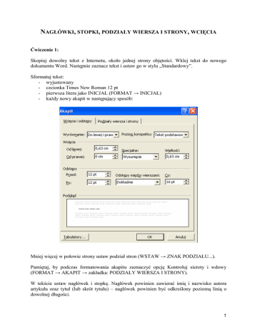 NAGŁÓWKI, STOPKI, PODZIAŁY WIERSZA I STRONY, WCIĘCIA Ćwiczenie 1: Skopiuj dowolny tekst z Internetu, około jednej strony objętości. Wklej tekst do nowego dokumentu Word. Następnie zaznacz tekst i ustaw go w stylu „Standardowy”. Sformatuj tekst: - wyjustowany - czcionka Times New Roman 12 pt - pierwsza litera jako INICJAŁ (FORMAT → INICJAŁ) - kaŜdy nowy akapit w następujący sposób: Mniej więcej w połowie strony ustaw podział stron (WSTAW → ZNAK PODZIAŁU...). Pamiętaj, by podczas formatowania akapitu zaznaczyć opcję Kontroluj sieroty i wdowy (FORMAT → AKAPIT → zakładka: PODZIAŁY WIERSZA I STRONY). W tekście ustaw nagłówek i stopkę. Nagłówek powinien zawierać imię i nazwisko autora artykułu oraz tytuł (lub skrót tytułu) – nagłówek powinien być odkreślony poziomą linią o dowolnej długości. 1 Wstawienie nagłówka i stopki. • • • • • • • • wybieramy z menu Widok polecenie Nagłówek i stopka; spowoduje to przemieszczenie kursora do nagłówka, w którym wpisujemy: autor, tytuł etc. rysujemy linię w nagłówku: w tym celu uaktywniamy pasek narzędzi Rysowanie klikając prawym przyciskiem myszy na dowolnym pasku narzędziowym i wybierając Ŝądany pasek; po uaktywnieniu paska narzędziowego Rysowanie klikamy na ikonie (linia) a następnie ustawiamy wskaźnik myszki przy lewym brzegu nagłówka, przytrzymujemy wciśnięty lewy klawisz myszki i przesuwamy wskaźnik do prawego brzegu nagłówka; zwolnienie przycisku spowoduje narysowanie linii; klikając na ikonie znajdującej się na pasku narzędziowym Nagłówek i stopka przechodzimy do stopki, gdzie wpisujemy podtytuł bądź hasło przewodnie artykułu i podobnie jak w nagłówku rysujemy linię. Klikamy na przycisku Zamknij znajdującym się na pasku narzędziowym Nagłówek i stopka; Zapisujemy zmiany. Ćwiczenie 2 Wstawianie numerów stron. • • • Uruchamiamy polecenie Numery stron... z menu Wstaw; w otworzonym oknie określamy połoŜenie numerów stron; klikając na przycisku OK kończymy wstawianie stron. Plik z poprzednich 2 ćwiczeń zapisujemy jako artykuł.doc STYLE. TWORZENIE SPISÓW I INDEKSÓW Ćwiczenie 1 Tworzenie nowego stylu na bazie istniejącego 1. Do nowego dokumentu wstawiamy skopiowaną wcześniej zawartość pliku artykuł.doc 2. Formatujemy jeden akapit i zaznaczamy go (stanowi on wzorzec). 3. Na pasku narzędzi Formatowanie wybieramy listę Styl (zostanie zaznaczona nazwa stylu, który jest aktualnie przypisany do akapitu. Wpisujemy w tym polu nową nazwę, np.: Nowy-styl (rysunek poniŜej), i naciskamy Enter. Word doda nowy styl do listy stylów w dokumencie. 2 Nazwa nowego stylu Po zmianie elementu formatowania stylu bazowego, zmiana ta będzie równieŜ dotyczyła wszystkich stylów w dokumencie, które pochodzą od tego stylu bazowego. MoŜna równieŜ spowodować, Ŝe Word będzie uaktualniał styl automatycznie, co oznacza, Ŝe Word wykrywa aktualizację formatu tekstu, który zawiera styl, a następnie automatycznie uaktualnia styl. Kiedy Word automatycznie uaktualnia styl, całość tekstu sformatowanego przy pomocy tego stylu jest uaktualniana, tak aby była zgodna z formatem tekstu, który został zmieniony. Aby szybko zmienić cały tekst, który jest sformatowany przy uŜyciu określonego stylu, moŜna ponownie zdefiniować styl. Na przykład, jeŜeli główny tekst jest pisany czcionką Arial, 14 pkt., wyrównany do lewej, a później trzeba zmienić czcionkę na TimesNewRoman 12 pkt. i wyjustować, to nie trzeba zmieniać formatu dla kaŜdego akapitu w dokumencie. Zamiast tego moŜna zmienić właściwości tego stylu. W tym celu wybieramy kolejno z menu Format polecenie Styl i następnie Modyfikacja stylu. Zastosowanie innego stylu do akapitu Aby zastosować nowy styl do akapitu, wystarczy ustawić kursor w dowolnym miejscu wewnątrz akapitu (w przypadki kilku akapitów naleŜy je zaznaczyć) i wybrać styl akapitu w polu Styl na pasku narzędzi Formatowanie. Aby zastosować styl znaku, naleŜy kliknąć słowo lub zaznaczyć grupę słów, które mają być zmienione i następnie w polu Styl na pasku narzędzi Formatowanie wybrać odpowiedni styl znaku. Uwaga: Z prawej (lub lewej) strony nazwy kaŜdego ze stylów akapitu znajduje się znacznik akapitu ¶, natomiast dla nazw stylów znaków znajduje się pogrubiona podkreślona litera "a". PowyŜsze zmiany moŜna takŜe wprowadzać wybierając z menu Format polecenie Styl. Po wskazaniu w polu Style, stylu, który ma być zastosowany wystarczy kliknąć przycisk Zastosuj. JeŜeli stylu, który nas interesuje nie ma na liście, wybieramy inną grupę stylów w polu Lista. Aby szybko zastosować styl, moŜna takŜe korzystać z malarza formatów. Plik zapisujemy jako style.doc 3 Ćwiczenie 2 Automatyczne tworzenie spisu treści W celu automatycznego wygenerowania spisu treści naleŜy do odpowiednich akapitów przypisać style nagłówków, np.; nagłówek1, nagłówek2 itd. (z listy Styl na pasku narzędzi Formatowanie). Otwieramy dokument style.doc i uzupełniamy go o odpowiednie tytuły wg schematu: Ćwiczenie 1 Interfejs programu Word ......... (istniejący tekst) Ćwiczenie 2 Polecenie zapisz jako ......... (istniejący tekst) itd. Do tytułów przypisujemy styl nagłówek 1, natomiast do tekstu ćwiczenie 1 itd., styl nagłówek 2. Wywołujemy z menu Wstaw polecenie Indeksy i spisy i następnie Spis treści. Ograniczamy liczbę poziomów do 2. Włączamy znaki wiodące tabulacji ..... oraz PokaŜ i wyrównaj do prawej numery stron – rysunek poniŜej. Następnie modyfikujemy styl spisu treści. Word automatycznie przypisuje do stylu Nagłówek 1 styl Spis treści 1 itd. Wybierając przycisk Modyfikuj moŜemy zmienić atrybuty poszczególnych stylów uŜywanych do generowania spisu treści. W tym celu naleŜy wskazać styl do modyfikacji (na rysunku poniŜej jest to styl Spis treści 1), wybrać przycisk Modyfikuj i w kolejnym oknie rozwinąć przycisk Format. Dalej w z