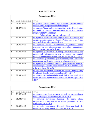 ZARZĄDZENIA Zarządzenia 2016 Lp. Data zarządzenia 1 07.01.2016 2 11.02.2016 3 29.02.2016 4 01.06.2016 5 17.06.2016 6 30.08.2016 7 09.09.2016 8 14.09.2016 9 29.09.2016 Treść w sprawie procedury oraz wykazu osób upoważnionych do składania podpisów elektronicznych w sprawie Wprowadzenia Jednolitej treści Regulaminu stołówki w Szkole Podstawowej nr 4 im. Adama Mickiewicza w Siedlcach Załącznik nr 1 do zarządzenia nr 2 w sprawie wprowadzenia regulaminu oddziałów dla dzieci sześcioletnich w Szkole Podstawowej nr 4 im. Adama Mickiewicza w Siedlcach w sprawie zasad klasyfikacji wydatków zadań związanych ze stosowaniem specjalnej organizacji nauki i metod pracy dla dzieci w sprawie powołania Komisji Kwalifikacyjnej dla nauczycieli ubiegających się o awans na stopień nauczyciela kontraktowego w roku szkolnym 2015/201 w sprawie powołania przewodniczących zespołów przedmiotowych, oraz zespołu wychowawczego. w sprawie określenia sposobu prowadzenia kontroli zarządczej w Szkole Podstawowej nr 4 w Siedlcach w roku szkolnym 2016/2017 w sprawie powołania zespołu do spraw Wewnętrznej Ewaluacji Szkoły w roku szkolnym 2016/2017 w sprawie ustalenia dodatkowych dni wolnych od zajęć dydaktyczno - wychowawczych w roku szkolnym 2016 /2017 Zarządzenia 2015 Lp. Data zarządzenia 1 20.02.2015 2 01.04.2015 3 04.05.2015 Treść w sprawie powołania składów komisji na sprawdzian w klasie szóstej w roku szkolnym 2014/2015 w sprawie powołania Komisji do oceny stanu bezpłatnych podręczników w klasie pierwszej w roku szkolnym 2014/2015 w sprawie powołania Komisji Rekrutacyjnej do świetlicy szkolnej na rok szkolny 2015/2016 4 04.05.2015 5 22.06.2015 6 03.07.2015 7 31.08.2015 8 09.09.2015 9 15.09.2015 10 24.09.2015 11 30.09.2015 12 30.09.2015 13 18.12.2015 w sprawie powołania Komisji Rekrutacyjnej do Przeprowadzenia rekrutacji do klas pierwszych na rok szkolny 2015/2016 w sprawie powołania Komisji Kwalifikacyjnej dla nauczycieli ubiegających się o awans na stopień nauczyciela kontraktowego w roku szkolnym 2014/2015 w sprawie wprowadzenia Regulaminu udzielania zamówień publicznych o wartości od 4.000 do 30.000 euro Załącznik nr 1 do zarządzenia nr 6 w sprawie powołania przewodniczących i zespołów przedmiotowych, oraz zespołu wychowawczego w sprawie określenia sposobu prowadzenia kontroli zarządczej w Szkole Podstawowej nr 4 w Siedlcach w roku szkolnym 2015/2016 w sprawie przeprowadzenia inwentaryzacji materiałów objętych ewidencją ilościowo wartościową w sprawie przeprowadzenia inwentaryzacji w Bibliotece szkolnej w sprawie ustalenia dodatkowych dni wolnych od zajęć dydaktyczno - wychowawczych w roku szkolnym 2015 /2016 Załącznik nr 1 do zarządzenia nr 11 w sprawie ustalenia dyżurów nauczycielskich w dodatkowych dniach wolnych od zajęć dydaktyczno wychowawczych w roku szkolnym 2015 /2016 w sprawie ustalenia harmonogramu pracy pracowników administracji i obsługi w dniach wolnych od zajęć dydaktyczno - wychowawczych w roku szkolnym 2015/2016 Zarządzenia 2014 Lp. Data zarządzenia 1 31.01.2014 2 17.03.2014 3 4 23.06.2014 25.08.2014 Treść w sprawie wprowadzenia regulaminu stołówki w sprawie Wprowadzenia Regulaminu rekrutacji do klas I Szkoły Podstawowej nr 4 im. Adama Mickiewicza w Siedlcach w sprawie powołania Komisji Socjalnej w sprawie określenia szczegółowych warunków 5 29.08.2014 6 12.09.2014 7 12.09.2014 8 30.09.2014 9 30.09.2014 10 28.11.2014 korzystania przez uczniów z bezpłatnych podręczników lub materiałów edukacyjnych w sprawie powołania przewodniczących i zespołów przedmiotowych, oraz zespołu wychowawczego w sprawie powołania zespołu do spraw Wewnętrznej Ewaluacji Szkoły w roku szkolnym 2014/2015 w sprawie ustanowienia zasad pisania i formatowania dokumentów szkolnych w sprawie ustalenia dodatkowych dni wolnych od zajęć dydaktyczno - wychowawczych w roku szkolnym 2014/2015 w sprawie ustalenia dyżurów nauczycielskich w dodatkowych dniach wolnych od zajęć dydaktyczno wychowawczych w roku szkolnym 2014/2015 w sprawie ustalenia harmonogramu pracy pracowników administracji i obsługi w dniach wolnych od zajęć dydaktyczno - wychowawczych w roku szkolnym 2014/2015 Zarządzenia 2013 Lp. Data zarządzenia 1 02.01.2013 2 04.01.2013 3 4 11.03.2013 11.03.2013 5 18.03.2013 6 20.03.2013 7 17.04.2013 8 19.04.2013 9 19.04.2013 10 22.04.2013 Treść W sprawie wprowadzenia instrukcji magazynowej W sprawie wprowadzenia opłat za wydawanie duplikatów i odpisów świadectw W sprawie przekazywania dokumentacji szkolnej W sprawie ustalenia kwot odzieży ochronnej dla nauczycieli wychowania fizycznego W sprawie wprowadzenia „Instrukcji w sprawie szczegółowych zasad i sposobu prowadzenia inwentaryzacji majątku” W sprawie wewnętrznego systemu zarządzania obiektami sportowymi W sprawie Instrukcji kontroli i ewidencji druków ścisłego zarachowania W sprawie wprowadzenia procedur tworzenia szkolnego zestawu programów nauczania i podręczników w Szkole Podstawowej nr 4 im. Adama Mickiewicza w Siedlcach W sprawie wprowadzenia w Szkole Systemu Bezpieczeństwa W sprawie powołania Komisji Rekrutacyjnej dla dzieci 11 24.06.2013 12 24.06.2013 13 28.06.2013 14 28.06.2013 15 13.09.2013 16 13.09.2013 17 30.09.2013 18 8.10. 2013 do oddziału przedszkolnego Szkoły Podstawowej nr 4 w Siedlcach w roku szkolnym 2013/2014 w sprawie powołania Komisji Kwalifikacyjnej dla nauczycieli ubiegających się o awans na stopień nauczyciela kontraktowego w roku szkolnym 2013/2014 w sprawie powołania Komisji Rekrutacyjnej do świetlicy szkolnej na rok szkolny 2013/2014 w sprawie naboru na stanowisko Kierownika Gospodarczego w Szkole Podstawowej nr 4 im. Adama Mickiewicza w Siedlcach w sprawie upoważniania osób do składania podpisów pod względem merytorycznym. w sprawie powołania zespołu do spraw Wewnętrznej Ewaluacji Szkoły w sprawie powołania Komisji ds. okresowej oceny Dyrektora Szkoły w sprawie ustalenia dodatkowych dni 