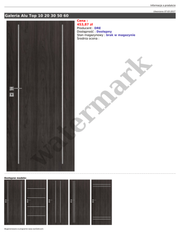 Informacje o produkcie Utworzono 07-03-2017 Galeria Alu Top 10 20 30 50 60 Cena : 453,87 zł w at er m ar k Producent : DRE Dostępność : Dostępny Stan magazynowy : brak w magazynie Średnia ocena : Dostępne modele: Wygenerowano w programie www.oscGold.com top 10 top 20 model top 30 top 50 top 60 dekor DRE-Cell dekor DRE-Cell dekor Finish jesion, calvados, wiśnia ciemna, orzech, orzech satyna biała mat, dąb złoty ryfla, orzech ciemny ryfla, wenge ryfla, dąb szary ryfla, dąb bielony ryfla, dąb polski 3D, wiąz antracyt, wiąz tabac wiąz, heban, orzech amerykański 369 zł netto | 453,87 zł brutto 396zł netto | 487,08 zł brutto 396 zł netto | 487,08 zł brutto GALERIA ALU TOP 10, 20, 30, 50, 60 *** dekor tylko w usłojeniu poziomym KOLORY calvados dąb złoty ryfla orzech ciemny ryfla dąb piaskowy wiąz W standardzie ● ● ● ● ● ● ● biała mat wenge ryfla dąb szary ryfla dąb bielony ryfla wiąz antracyt wiąz tabac wenge ciemne heban orzech amerykański dąb polski 3d wiśnia złota w ● orzech satyna ramka przyszybowa płaska wypełnienie płyta wiórowa otworowa rama z drewna iglastego okleina DRE-Cell lub folia Finish wstawki aluminiowe o przekroju 8x2 mm. zamek na klucz zwykły, blokadę łazienkową, wkładkę patentową lub zamek oszczędnościowy szyba KORA BIAŁA gr. 4 mm Skrzydło przylgowe ● orzech at ● wiśnia ciemna er m ar k jesion krawędź prosta 2 lub 3 zawiasy (srebrne) zamek zasuwkowy Skrzydło bezprzylgowe ● ● ● krawędź bez przylgi zamek magnetyczny gniazda pod 3 zawiasy wpuszczane W1078 Opcje bez dopłaty ● ● ● szyba CHINCHILA lub ŻALUZJA tuleje wentylacyjne skrzydło bezprzylgowe do systemu przesuwnego Opcje za dopłatą szyba dekoracyjna DECORMAT, DECORMAT BRĄZ, DECORMAT GRAFIT (dotyczy skrzydła) ● ● ● ● ● GALERIA ALU TOP 11, 13, 23............................10 zł | 12,30 zł GALERIA ALU TOP 21........................................20 zł | 24,60 zł GALERIA ALU TOP 24, 25..................................40 zł | 49,20 zł GALERIA ALU TOP 12, 22..................................65 zł | 79,95 zł skrzydła bezprzylgowe rozwierne....................55 zł | 67,65 zł Informacje o produkcie ● ● ● ● ● ● skrzydła „90” i „100”.......................................18 zł | 22,14 zł podcięcie wentylacyjne...................................20 zł | 24,60 zł kratka wentylacyjna tworzywowa...................20 zł | 24,60 zł kratka wentylacyjna aluminiowa.....................90 zł | 110,70 zł listwa przymykowa drzwi dwuskrzydłowych...16 zł | 19,68 zł drzwi dwuskrzydłowe....................................cena skrzydła x 2 UWAGA: Skrzydła bierne GALERIA ALU TOP 20, 21, 22, 23, 24, 25, 60 bez poziomych wstawek aluminiowych w jednolitym usłojeniu. Skrzydła bezprzylgowe rozwierne zaopatrzone są w gniazda, przeznaczone do dalszego montażu zawiasów, które osadzone są w ościeżnicy. Skrzydła bezprzylgowe rozwierne są droższe o 55 zł netto od skrzydeł przylgowych. Szerokość skrzydeł: jednoskrzydłowe „60”÷„100”, dwuskrzydłowe przylgowe „120” ÷ „200”, dwuskrzydłowe bezprzylgowe „120” ÷ „180” UWAGA! w at er m ar k Podana cena obejmuje model podstawowy. Podczas zakupów w polu "dodoaj komentarz do zamówienia" należy podać: model, kolor, stronę otwierania, wymiary oraz ewentualne dodatki. Wygenerowano w programie www.oscGold.com