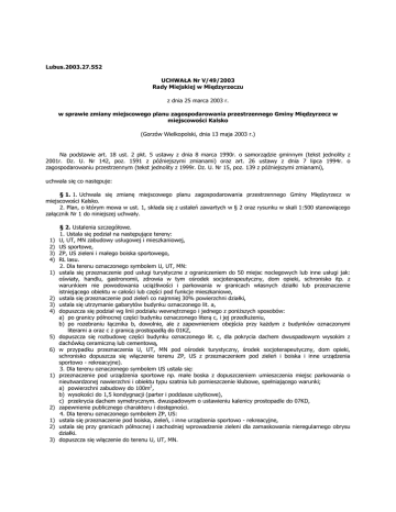 Lubus.2003.27.552 UCHWAŁA Nr V/49/2003 Rady Miejskiej w Międzyrzeczu z dnia 25 marca 2003 r. w sprawie zmiany miejscowego planu zagospodarowania przestrzennego Gminy Międzyrzecz w miejscowości Kalsko (Gorzów Wielkopolski, dnia 13 maja 2003 r.) Na podstawie art. 18 ust. 2 pkt. 5 ustawy z dnia 8 marca 1990r. o samorządzie gminnym (tekst jednolity z 2001r. Dz. U. Nr 142, poz. 1591 z późniejszymi zmianami) oraz art. 26 ustawy z dnia 7 lipca 1994r. o zagospodarowaniu przestrzennym (tekst jednolity z 1999r. Dz. U. Nr 15, poz. 139 z późniejszymi zmianami), uchwala się co następuje: § 1. 1. Uchwala się zmianę miejscowego planu zagospodarowania przestrzennego Gminy Międzyrzecz w miejscowości Kalsko. 2. Plan, o którym mowa w ust. 1, składa się z ustaleń zawartych w § 2 oraz rysunku w skali 1:500 stanowiącego załącznik Nr 1 do niniejszej uchwały. 1) 2) 3) 4) 1) 2) 3) 4) 5) 6) 1) 2) 1) 2) 3) § 2. Ustalenia szczegółowe. 1. Ustala się podział na następujące tereny: U, UT, MN zabudowy usługowej i mieszkaniowej, US sportowe, ZP, US zieleni i małego boiska sportowego, RL lasu. 2. Dla terenu oznaczonego symbolem U, UT, MN: ustala się przeznaczenie pod usługi turystyczne z ograniczeniem do 50 miejsc noclegowych lub inne usługi jak: oświaty, handlu, gastronomii, zdrowia w tym ośrodek socjoterapeutyczny, dom opieki, schronisko itp. z warunkiem nie powodowania uciążliwości i parkowania w granicach własnych działki lub przeznaczenie istniejącego obiektu w całości lub części pod funkcje mieszkaniowe, ustala się przeznaczenie pod zieleń co najmniej 30% powierzchni działki, ustala się utrzymanie gabarytów budynku oznaczonego lit. a, dopuszcza się podział wg linii podziału wewnętrznego i jednego z poniższych sposobów: a) po granicy północnej części budynku oznaczonego literą c, i jej przedłużeniu, b) po rozebraniu łącznika b, dowolnie, ale z zapewnieniem obejścia przy każdym z budynków oznaczonymi literami a oraz c z granicą prostopadłą do 01KZ, dopuszcza się rozbudowę części budynku oznaczonego lit. c, dla pokrycia dachem dwuspadowym wysokim z dachówką ceramiczną lub cementową, w przypadku przeznaczenia U, UT, MN pod ośrodek turystyczny, środek socjoterapeutyczny, dom opieki, schronisko dopuszcza się włączenie terenu ZP, US z przeznaczeniem pod zieleń i boiska i inne urządzenia sportowo - rekreacyjne). 3. Dla terenu oznaczonego symbolem US ustala się: przeznaczenie pod urządzenia sportowe np. małe boska z dopuszczeniem umieszczenia miejsc parkowania o nieutwardzonej nawierzchni i obiektu typu szatnia lub pomieszczenie klubowe, spełniającego warunki; a) powierzchni zabudowy do 100m2, b) wysokości do 1,5 kondygnacji (parter i poddasze użytkowe), c) przekrycia dachem symetrycznym. dwuspadowym o ustawieniu kalenicy prostopadle do 07KD, zapewnienie publicznego charakteru i dostępności. 4. Dla terenu oznaczonego symbolem ZP, US: ustala się przeznaczenie pod boiska, zieleń, i inne urządzenia sportowo - rekreacyjne, ustala się przy granicach północnej i zachodniej wprowadzenie zieleni dla zamaskowania nieregularnego obrysu działki. dopuszcza się włączenie do terenu U, UT, MN. 1) 2) 3) 4) 5) 6) 7) 5. Dla terenu oznaczonego symbolem RL ustala się utrzymanie istniejącego lasu. 6. Ustala się następujące zasady obsługi infrastruktury technicznej: neutralizacja odpadów płynnych: a) dopuszczenie gromadzenia ścieków sanitarnych w osadnikach, jako formy przejściowej, z wywozem ścieków na punkt zlewny przy działających oczyszczalniach, b) docelowo, budowę sieci kanalizacji sanitarnej umieszczanej w liniach rozgraniczenia ulic i neutralizację ścieków na oczyszczalni poza obszarem opracowania, odprowadzenie wód opadowych z dachów obiektów na tereny nieutwardzone w granicach działek budowlanych, zaopatrzenie w wodę z wodociągu wiejskiego, z lokalizacją ujęcia wody poza obszarem opracowania, gromadzenie odpadów stałych na wiejskim składowisku odpadów komunalnych usytuowanym poza obszarem opracowania, zaopatrzenie w energię elektryczną istniejące, linią kablową 0,4kV, zaopatrzenie w ciepło przy zastosowaniu gazu, energii elektrycznej i paliw płynnych, obsługa telekomunikacyjna z dopuszczeniem systemu łączności przewodowej w oparciu o sieć kablową wprowadzoną w liniach rozgraniczenia ulic. § 3. Skutki prawne uchwalenia planu. Zgodnie z art. 10 ust. 3 i art. 36. ust. 3 ustawy o zagospodarowaniu przestrzennym ustala się jednorazową opłatę uiszczaną w wypadku zbycia działek w wysokości 0% wzrostu wartości nieruchomości, § 4. Uchyla się Plan Ogólny Zagospodarowania Przestrzennego Gminy Międzyrzecz uchwalony przez Radę Miejską w Międzyrzeczu uchwałą Nr XLIlI/293/94 z dnia 16 maja 1994r. (Dziennik Urzędowy Województwa Gorzowskiego z 1994r. Nr 10 poz. 69 z późniejszymi zmianami), obszaru w granicach objętych niniejszą uchwałą. § 5. Wykonanie uchwały powierza się Burmistrzowi Międzyrzecza. § 6. Uchwała wchodzi w życie po upływie 14 dni od dnia jej ogłoszenia w Dzienniku Urzędowym Województwa Lubuskiego. ZAŁĄCZNIK Nr 1 ZMIANA MIEJSCOWEGO PLANU ZAGOSPODAROWANIA PRZESTRZENNEGO GMINY MIĘDZYRZECZ W MIEJSCOWOŚCI KALSKO (grafikę pominięto)