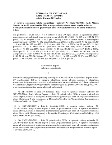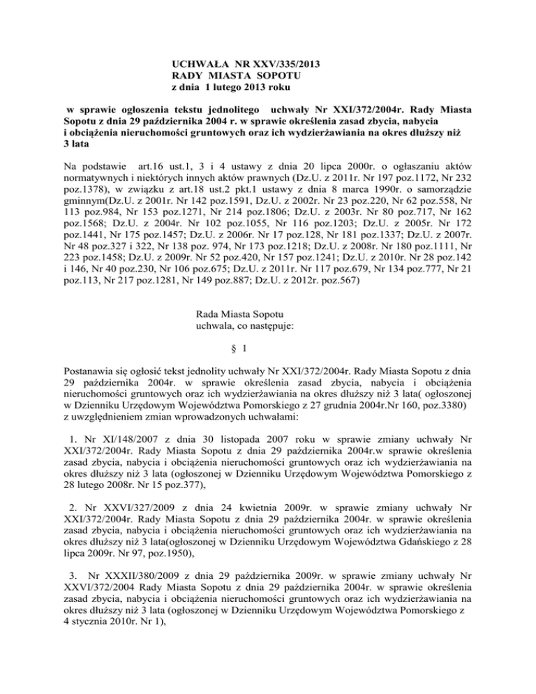 UCHWAŁA NR XXV/335/2013 RADY MIASTA SOPOTU z dnia 1 lutego 2013 roku w sprawie ogłoszenia tekstu jednolitego uchwały Nr XXI/372/2004r. Rady Miasta Sopotu z dnia 29 października 2004 r. w sprawie określenia zasad zbycia, nabycia i obciążenia nieruchomości gruntowych oraz ich wydzierżawiania na okres dłuższy niż 3 lata Na podstawie art.16 ust.1, 3 i 4 ustawy z dnia 20 lipca 2000r. o ogłaszaniu aktów normatywnych i niektórych innych aktów prawnych (Dz.U. z 2011r. Nr 197 poz.1172, Nr 232 poz.1378), w związku z art.18 ust.2 pkt.1 ustawy z dnia 8 marca 1990r. o samorządzie gminnym(Dz.U. z 2001r. Nr 142 poz.1591, Dz.U. z 2002r. Nr 23 poz.220, Nr 62 poz.558, Nr 113 poz.984, Nr 153 poz.1271, Nr 214 poz.1806; Dz.U. z 2003r. Nr 80 poz.717, Nr 162 poz.1568; Dz.U. z 2004r. Nr 102 poz.1055, Nr 116 poz.1203; Dz.U. z 2005r. Nr 172 poz.1441, Nr 175 poz.1457; Dz.U. z 2006r. Nr 17 poz.128, Nr 181 poz.1337; Dz.U. z 2007r. Nr 48 poz.327 i 322, Nr 138 poz. 974, Nr 173 poz.1218; Dz.U. z 2008r. Nr 180 poz.1111, Nr 223 poz.1458; Dz.U. z 2009r. Nr 52 poz.420, Nr 157 poz.1241; Dz.U. z 2010r. Nr 28 poz.142 i 146, Nr 40 poz.230, Nr 106 poz.675; Dz.U. z 2011r. Nr 117 poz.679, Nr 134 poz.777, Nr 21 poz.113, Nr 217 poz.1281, Nr 149 poz.887; Dz.U. z 2012r. poz.567) Rada Miasta Sopotu uchwala, co następuje: § 1 Postanawia się ogłosić tekst jednolity uchwały Nr XXI/372/2004r. Rady Miasta Sopotu z dnia 29 października 2004r. w sprawie określenia zasad zbycia, nabycia i obciążenia nieruchomości gruntowych oraz ich wydzierżawiania na okres dłuższy niż 3 lata( ogłoszonej w Dzienniku Urzędowym Województwa Pomorskiego z 27 grudnia 2004r.Nr 160, poz.3380) z uwzględnieniem zmian wprowadzonych uchwałami: 1. Nr XI/148/2007 z dnia 30 listopada 2007 roku w sprawie zmiany uchwały Nr XXI/372/2004r. Rady Miasta Sopotu z dnia 29 października 2004r.w sprawie określenia zasad zbycia, nabycia i obciążenia nieruchomości gruntowych oraz ich wydzierżawiania na okres dłuższy niż 3 lata (ogłoszonej w Dzienniku Urzędowym Województwa Pomorskiego z 28 lutego 2008r. Nr 15 poz.377), 2. Nr XXVI/327/2009 z dnia 24 kwietnia 2009r. w sprawie zmiany uchwały Nr XXI/372/2004r. Rady Miasta Sopotu z dnia 29 października 2004r. w sprawie określenia zasad zbycia, nabycia i obciążenia nieruchomości gruntowych oraz ich wydzierżawiania na okres dłuższy niż 3 lata(ogłoszonej w Dzienniku Urzędowym Województwa Gdańskiego z 28 lipca 2009r. Nr 97, poz.1950), 3. Nr XXXII/380/2009 z dnia 29 października 2009r. w sprawie zmiany uchwały Nr XXVI/372/2004 Rady Miasta Sopotu z dnia 29 października 2004r. w sprawie określenia zasad zbycia, nabycia i obciążenia nieruchomości gruntowych oraz ich wydzierżawiania na okres dłuższy niż 3 lata (ogłoszonej w Dzienniku Urzędowym Województwa Pomorskiego z 4 stycznia 2010r. Nr 1), 4. Nr XVIII/215/2012 z dnia 30 marca 2012 roku w sprawie zmiany uchwały Nr XXVI/372/2004 Rady Miasta Sopotu z dnia 29 października 2004r. w sprawie określenia zasad zbycia, nabycia i obciążenia nieruchomości gruntowych oraz ich wydzierżawiania na okres dłuższy niż 3 lata (ogłoszonej w Dzienniku Urzędowym Województwa Pomorskiego z 8 maja 2012r. poz.1613). § 2 Ogłoszenie tekstu jednolitego, o którym mowa w § 1, nastąpi w formie obwieszczenia stanowiącego załącznik do niniejszej uchwały. § 3 Obwieszczenie podlega ogłoszeniu w Dzienniku Urzędowym Województwa Pomorskiego. § 4 Wykonanie uchwały powierza się Prezydentowi Miasta Sopotu. § 5 Uchwała wchodzi w życie z dniem podjęcia Przewodniczący Rady Miasta Sopotu Wojciech Fułek Załącznik do uchwały Rady Miasta Sopotu nr XXV/335/2013 z dnia 1 lutego 2013 roku Obwieszczenie Rady Miasta Sopotu z dnia 1 lutego 2013 roku w sprawie: ogłoszenia tekstu jednolitego uchwały Nr XXI/372/2004r. Rady Miasta Sopotu z dnia 29 października 2004 r. w sprawie określenia zasad zbycia, nabycia i obciążenia nieruchomości gruntowych oraz ich wydzierżawiania na okres dłuższy niż 3 lata Na podstawie art.16 ust.1, 3 i 4 ustawy z dnia 20 lipca 2000r. o ogłaszaniu aktów normatywnych i niektórych innych aktów prawnych (Dz.U. z 2011r. Nr 197 poz.1172, Nr 232 poz.1378) ogłasza się tekst jednolity uchwały Nr XXI/372/2004r. Rady Miasta Sopotu z dnia 29 października 2004 r. w sprawie określenia zasad zbycia, nabycia i obciążenia nieruchomości gruntowych oraz ich wydzierżawiania na okres dłuższy niż 3 lata z uwzględnieniem zmian wprowadzonych uchwałami: 1. Nr XI/148/2007 z dnia 30 listopada 2007 roku w sprawie zmiany uchwały Nr XXI/372/2004r. Rady Miasta Sopotu z dnia 29 października 2004r.w sprawie określenia zasad zbycia, nabycia i obciążenia nieruchomości gruntowych oraz ich wydzierżawiania na okres dłuższy niż 3 lata (ogłoszonej w Dzienniku Urzędowym Województwa Pomorskiego z 28 lutego 2008r. Nr 15 poz.377), 2. Nr XXVI/327/2009 z dnia 24 kwietnia 2009r. w sprawie zmiany uchwały Nr XXI/372/2004r. Rady Miasta Sopotu z dnia 29 października 2004r. w sprawie określenia zasad zbycia, nabycia i obciążenia nieruchomości gruntowych oraz ich wydzierżawiania na okres dłuższy niż 3 lata(ogłoszonej w Dzienniku Urzędowym Województwa Gdańskiego z 28 lipca 2009r. Nr 97, poz.1950), 3. Nr XXXII/380/2009 z dnia 29 października 2009r. w sprawie zmiany uchwały Nr XXVI/372/2004 Rady Miasta Sopotu z dnia 29 października 2004r. w sprawie określenia zasad zbycia, nabycia i obciążenia nieruchomości gruntowych oraz ich wydzierżawiania na okres dłuższy niż 3 lata (ogłoszonej w Dzienniku Urzędowym Województwa Pomorskiego z 4 stycznia 2010r. Nr 1), 4. Nr XVIII/215/2012 z dnia 30 marca 2012 roku w sprawie zmiany uchwały Nr XXVI/372/2004 Rady Miasta Sopotu z dnia 29 października 2004r. w sprawie określenia zasad zbycia, nabycia i obciążenia nieruchomości gruntowych oraz ich wydzierżawiania na okres dłuższy niż 3 lata (ogłoszonej w Dzienniku Urzędowym Województwa Pomorskiego z 2012r. 