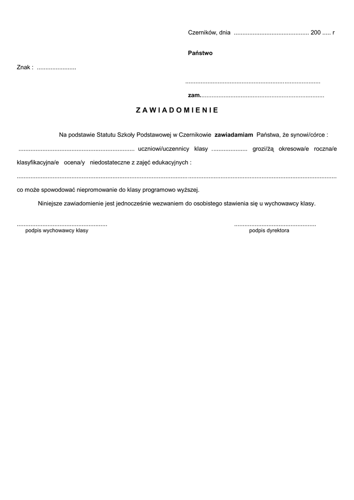 Czerników, dnia ............................................ 200 ..... r Państwo Znak : ....................... ............................................................................... zam......................................................................... ZAWIADOMIENIE Na podstawie Statutu Szkoły Podstawowej w Czernikowie zawiadamiam Państwa, że synowi/córce : .................................................................... uczniowi/uczennicy klasy ..................... grozi/żą okresowa/e roczna/e klasyfikacyjna/e ocena/y niedostateczne z zajęć edukacyjnych : ........................................................................................................................................................................................... co może spowodować niepromowanie do klasy programowo wyższej. Niniejsze zawiadomienie jest jednocześnie wezwaniem do osobistego stawienia się u wychowawcy klasy. ..................................................... podpis wychowawcy klasy ................................................ podpis dyrektora Prawa ucznia oraz jego rodziców wynikające ze Statutu Szkoły Podstawowej w Czernikowie 1. Na tydzień przed klasyfikacyjnym posiedzeniem rady pedagogicznej nauczyciel zajęć edukacyjnych zobowiązany jest poinformować ucznia o przewidywanej okresowej(rocznej) ocenie z zajęć edukacyjnych, a wychowawca o przewidywanej ocenie zachowania. 2. Uczeń lub jego rodzice (prawni opiekunowie) mogą zgłosić zastrzeżenia do dyrektora szkoły, jeżeli uznają, że roczna ( okresowa) ocena klasyfikacyjna z zajęć edukacyjnych lub roczna ( okresowa ) ocena klasyfikacyjna zachowania została ustalona niezgodnie z przepisami prawa dotyczącymi trybu ustalania tej oceny. Zastrzeżenia mogą być zgłoszone w terminie do 7 dni po zakończeniu zajęć dydaktyczno-wychowawczych. 3. W przypadku stwierdzenia, że roczna (semestralna) ocena klasyfikacyjna z zajęć edukacyjnych lub roczna ocena klasyfikacyjna zachowania została ustalona niezgodnie z przepisami prawa dotyczącymi trybu ustalania tej oceny, dyrektor szkoły powołuje komisję, która: 1) w przypadku rocznej (okresowej) oceny klasyfikacyjnej z zajęć edukacyjnych - przeprowadza sprawdzian wiadomości i umiejętności ucznia, w formie pisemnej i ustnej, oraz ustala roczną (okresową) ocenę klasyfikacyjną z danych zajęć edukacyjnych; 2) w przypadku rocznej oceny klasyfikacyjnej zachowania - ustala roczną ocenę klasyfikacyjną zachowania w drodze głosowania zwykłą większością głosów; w przypadku równej liczby głosów decyduje głos przewodniczącego komisji. 4. Uczeń który nie jest klasyfikowany z powodu długotrwałej nieobecności w szkole, której przyczyną była choroba lub inny ważny powód, ma prawo ubiegać się o egzamin klasyfikacyjny. Wszelkich dodatkowych informacji dotyczących praw ucznia lub rodziców możecie Państwo uzyskać od wychowawcy klasy. Prawa ucznia oraz jego rodziców wynikające ze Statutu Szkoły Podstawowej w Czernikowie 5. Na tydzień przed klasyfikacyjnym posiedzeniem rady pedagogicznej nauczyciel zajęć edukacyjnych zobowiązany jest poinformować ucznia o przewidywanej okresowej(rocznej) ocenie z zajęć edukacyjnych, a wychowawca o przewidywanej ocenie zachowania. 6. Uczeń lub jego rodzice (prawni opiekunowie) mogą zgłosić zastrzeżenia do dyrektora szkoły, jeżeli uznają, że roczna ( okresowa) ocena klasyfikacyjna z zajęć edukacyjnych lub roczna ( okresowa ) ocena klasyfikacyjna zachowania została ustalona niezgodnie z przepisami prawa dotyczącymi trybu ustalania tej oceny. Zastrzeżenia mogą być zgłoszone w terminie do 7 dni po zakończeniu zajęć dydaktyczno-wychowawczych. 7. W przypadku stwierdzenia, że roczna (semestralna) ocena klasyfikacyjna z zajęć edukacyjnych lub roczna ocena klasyfikacyjna zachowania została ustalona niezgodnie z przepisami prawa dotyczącymi trybu ustalania tej oceny, dyrektor szkoły powołuje komisję, która: 3) w przypadku rocznej (okresowej) oceny klasyfikacyjnej z zajęć edukacyjnych - przeprowadza sprawdzian wiadomości i umiejętności ucznia, w formie pisemnej i ustnej, oraz ustala roczną (okresową) ocenę klasyfikacyjną z danych zajęć edukacyjnych; 4) w przypadku rocznej oceny klasyfikacyjnej zachowania - ustala roczną ocenę klasyfikacyjną zachowania w drodze głosowania zwykłą większością głosów; w przypadku równej liczby głosów decyduje głos przewodniczącego komisji. 8. Uczeń który nie jest klasyfikowany z powodu długotrwałej nieobecności w szkole, której przyczyną była choroba lub inny ważny powód, ma prawo ubiegać się o egzamin klasyfikacyjny. Wszelkich dodatkowych informacji dotyczących praw ucznia lub rodziców możecie Państwo uzyskać od wychowawcy klasy. Czerników, dnia ............................................ 200 ..... r Państwo Znak : SPC II. 412. ....................... ............................................................................... zam......................................................................... ZAWIADOMIENIE Na podstawie Statutu Szkoły Podstawowej w Czernikowie zawiadamiam Państwa, że synowi/córce : .................................................................... uczniowi/uczennicy klasy ..................... grozi/żą okresowa/e roczna/e klasyfikacyjna/e ocena/y niedostateczne z zajęć edukacyjnych : ........................................................................................................................................................................................... co może spowodować niepromowanie do klasy programowo wyższej. Niniejsze zawiadomienie jest jednocześnie wezwaniem do osobistego stawienia się u wychowawcy klasy. ..................................................... podpis wychowawcy klasy ................................................ podpis dyrektora