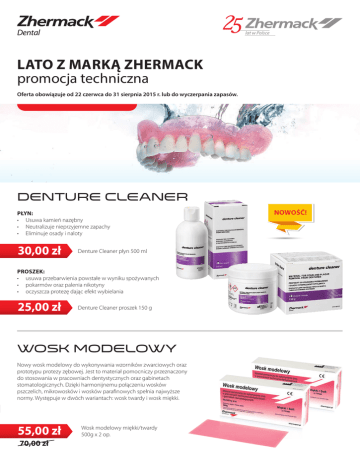 LATO Z MARKĄ ZHERMACK promocja techniczna Oferta obowiązuje od 22 czerwca do 31 sierpnia 2015 r. lub do wyczerpania zapasów. denture cleaner PŁYN: • Usuwa kamień nazębny • Neutralizuje nieprzyjemne zapachy • Eliminuje osady i naloty 30,00 zł Denture Cleaner płyn 500 ml PROSZEK: • usuwa przebarwienia powstałe w wyniku spożywanych • pokarmów oraz palenia nikotyny • oczyszcza protezę dając efekt wybielania 25,00 zł Denture Cleaner proszek 150 g wosk modelowy Nowy wosk modelowy do wykonywania wzorników zwarciowych oraz prototypu protezy zębowej. Jest to materiał pomocniczy przeznaczony do stosowania w pracowniach dentystycznych oraz gabinetach stomatologicznych. Dzięki harmonijnemu połączeniu wosków pszczelich, mikrowosków i wosków parafinowych spełnia najwyższe normy. Występuje w dwóch wariantach: wosk twardy i wosk miękki. 55,00 zł 70,00 zł Wosk modelowy miękki/twardy 500g x 2 op. NOWOŚĆ! villacryl Bogata oferta materiałów akrylowych umożliwia najróżnorodniejsze ich zastosowanie. Dzięki naturalnej kolorystyce oraz wytrzymałości mechanicznej materiałów użycie produktów z grupy Villacryl gwarantuje wysoką estetykę i jakość wykonanej pracy. 50%CENY Villacryl H Plus (750 g + 400 ml) + Denture Cleaner proszek 150 g (ZA 50% CENY) 50%CENY Villacryl H Plus (750 g + 400 ml) + Denture Cleaner płyn 500 ml (ZA 50% CENY) 50%CENY Villacryl SP (500 g + 300 ml) + Villacryl Bond (ZA 50% CENY) 254,00 zł 303,00 zł Polimeryzator ci nieniowy TM 177,00 zł 167,00 zł 182,00 zł 193,50 zł 219,00 zł Villacryl Rapid V4 2 kg + płyn 400 ml za 1 zł + koszulka termoaktywna W CENIE Villacryl H Plus 2 kg + płyn 400 ml za 1 zł + koszulka termoaktywna W CENIE W CENIE 164,50 zł 286,00 zł W CENIE 346,00 zł prothyl polimer Komora polimeryzacyjna PROTHYL POLIMER* 1.500,00 zł Polimeryzator ciśnieniowy TM 6l + Villacryl SPV4 za 1 zł 1.100,00 zł 1.268,00 zł * Promocja obejmuje zakup komory polimeryzacyjnej po promocyjnej cenie 1500,00 zł oraz w ciągu 12 miesięcy materiałów akrylowych linii Villacryl za 5000,00 zł. (Dokonaj zakupu komory polimeryzacyjnej za 1500zł oraz akryli za minimum 500zł, prześlij do nas kopię dowodu zakupu, podpisz umowę a my wyślemy komorę polimeryzacyjną. Następnie w ciągu kolejnych 12 miesięcy dokonaj zakupu akryli linii Villacryl za 4500zł). Szczegółowy regulamin promocji dostępny na stronie www.zhermapol.pl zetalabor Masa silikonowa typu C przeznaczona specjalnie dla pracowni techniczno-dentystycznych. P100400 Zetalabor 2,6 kg + Indurent 60 ml za 1 zł 149,00 zł 186,00 zł x2 W CENIE x4 C400798 Zetalabor 5 kg + 2 x Indurent 60 ml W CENIE 289,00 zł P201804 Zetalabor 10 kg + 4 x Indurent 60 ml za 4 zł 499,00 zł 316,00 zł 667,00 zł PLATINUM 95 Masa silikonowa typu A przeznaczona dla pracowni technicznodentystycznych. C400700 Platinum 95 1 kg + 1 kg 135,00 zł 175,00 zł elite lc tray round Jednoskładnikowy materiał do wykonywania światłoutwardzalnych łyżek indywidualnych. Ergonomiczny kształt płytek umożliwia ekonomiczne wykorzystanie materiału. Opakowania 50 szt w kolorach: biały, różowy, niebieski. NOWOŚĆ! 139,00 zł platinum 85 touch sięgnij po NOWĄ generację silikonów Zhermack o konsystencji putty. NOWA silikonowa masa typu A do zastosowań w pracowniach techniczno-dentystycznych o konsystencji putty Platinum 85 TOUCH. Gładka i aksamitna powierzchnia, duża precyzja odwzorowania szczegółów, pachnąca wanilią – odkryj cechy, które sprawiają, że NOWA Platinum 85 TOUCH to idealny wybór dla wszystkich zastosowań, wymagających jakości i niezawodności. C400750 Platinum 85 Touch 4,3 kg + 4,3 kg + Villacryl SP za 1 zł + koszulka termoaktywna W CENIE 599,00 zł 813,00 zł W CENIE C400751 Platinum 85 Touch 200 g + 200 g pachnąca wanilią 35,00 zł 40,00 zł ELITE DOUBLE silikony addycyjne do powielania modeli przy wykonywaniu protez szkieletowych i innych prac laboratoryjnych. Elite Double 16/22 Normal/Fast (1 kg+1 kg) 189,00 zł 219,00 zł Zhermapol Sp. z o.o. ul. Augustówka 14, 02-981 Warszawa tel. +48 22 858 82 72, fax +48 22 642 07 14 www.zhermapol.pl DYSTRYBUTOR *Zhermapol Sp. z o.o. zastrzega sobie prawo do wcześniejszego zakończenia promocji bez uprzedniego powiadomienia.