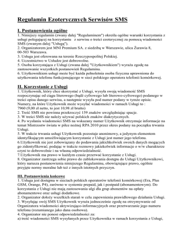 Regulamin Ezoterycznych Serwisów SMS I. Postanowienia ogólne 1. Niniejszy regulamin (zwany dalej "Regulaminem") określa ogólne warunki korzystania z usługi polegającej na korzystaniu z serwisu o treści ezoterycznej za pomocą wiadomości SMS (zwanym dalej "Usługą"). 2. Organizatorem jest MNI Premium SA. z siedzibą w Warszawie, ulica Żurawia 8, 00-503 Warszawa. 3. Usługa jest oferowana na terenie Rzeczypospolitej Polskiej. 4. Uczestnictwo w Usłudze jest dobrowolne. 5. Osoba korzystająca z Usługi (zwana dalej "Użytkownikiem") wyraża zgodę na zastosowanie wszystkich postanowień Regulaminu. 6. Użytkownikiem usługi może być każda pełnoletnia osoba fizyczna uprawniona do użytkowania telefonu funkcjonującego w sieci polskiego operatora telefonii komórkowej. II. Korzystanie z Usługi 1. Użytkownik, który chce skorzystać z Usługi, wysyła swoją wiadomość SMS rozpoczynając od ciągu literowego (bądź cyfrowego lub literowo-cyfrowego) podanego w treści opisu danego serwisu, a następnie wysyła pod numer podany w tymże opisie. Numery, na które Użytkownik może wysyłać wiadomości w ramach Usługi to : 7960 (9,00 zł netto, to jest 10,98 zł brutto) 2. Treść SMS nie powinna przekroczyć 159 znaków uwzględniając spacje. 3. W treści SMS nie należy używać polskich znaków diakrytycznych. 4. Po wysłaniu wiadomości SMS na wskazany numer Użytkownik otrzymuje informacje na temat Mistrzostw świata w piłce nożnej RPA 2010 przez okres podany na początku trwania Usługi. 5. W trakcie trwania usługi Użytkownik pozostaje anonimowy, a jedynym elementem identyfikującym umożliwiającym korzystanie z Usługi jest numer jego telefonu. 6.Użytkownik nie jest zobowiązany do podawania jakichkolwiek swoich danych mogących go zidentyfikować; podając w trakcie rozmowy jakiekolwiek informacje o w/w charakterze czyni to dobrowolnie i na własną odpowiedzialność. 7.Użytkownik ma prawo w każdym czasie przerwać korzystanie z Usługi. 8. Organizator zastrzega sobie prawo do zablokowania dostępu do Usługi Użytkownikowi, który narusza postanowienia niniejszego Regulaminu, obowiązujące prawo, ogólnie przyjęte normy moralne lub też z innych istotnych przyczyn. III. Postanowienia końcowe 1. Usługa jest dostępna w sieciach polskich operatorów telefonii komórkowej (Era, Plus GSM, Orange, P4), zarówno w systemie prepaid, jak i postpaid (abonamentowym). Do korzystania z Usługi nie mają zastosowania ulgi dla grup abonentów na opłaty abonamentowe oraz usługi dodatkowe. 2. Organizator dołoży wszelkich starań w celu zapewnienia prawidłowego działania Usługi. 3. Wysyłając swój SMS Użytkownik wyraża jednocześnie zgodę na otrzymywanie od Organizatora wiadomości aktywizująco-informacyjnych oraz przetwarzanie jego numeru telefonu (rozumianego jako dana osobowa). 4. Organizator nie ponosi odpowiedzialności za: a) treść wiadomości SMS wysyłanych przez Użytkownika w ramach korzystania z Usługi, b) korzystanie z Usługi przez osoby niepełnoletnie oraz osoby nieuprawnione do użytkowania telefonu komórkowego, c) szkody spowodowane nieprawidłowym korzystaniem przez Użytkownika z Usługi, d) wiadomości SMS, które zostały nadane przez Użytkownika w sposób nieprawidłowy, a w szczególności uniemożliwiające mu prawidłowe zalogowanie się do wybranego serwisu, e) ewentualny dyskomfort psychiczno-moralny, jaki może zostać potencjalnie wywołany poprzez treści otrzymywane w trakcie rozmowy na czacie, f) za błędy lub przekłamania występujące w trakcie rozmowy, jeśli przyczyną tej sytuacji były błędy lub problemy techniczne leżące po stronie podmiotów trzecich, ze szczególnym uwzględnieniem operatorów telefonii komórkowej, g) korzystanie z Usługi przez Użytkowników niezgodnie z postanowieniami niniejszego Regulaminu lub bez zapoznania się z Regulaminem, w tym zwłaszcza wynikające z niewłaściwego zrozumienia przez Użytkownika charakteru Usługi oraz związanych z tym postanowień regulaminowych, przerwy w świadczeniu Usługi zaistniałe z przyczyn technicznych (np. konserwacja, przegląd, wymiana sprzętu) lub niezależnych od Organizatora, 5. Informacje otrzymywane przez Użytkownika w ramach korzystania z Usługi nie mają charakteru wiążących porad, zaś ewentualne stosowanie się do nich jest przez Użytkownika dobrowolne. Organizator nie ponosi odpowiedzialności za sposób, w jaki Użytkownik wykorzysta uzyskane informacje lub jakie działania podejmie w rezultacie zapoznania się z nimi. 6. Organizator zastrzega sobie prawo zmiany postanowień Regulaminu w razie zmiany przepisów prawnych lub z innej przyczyny. Regulamin w zmienionej formie obowiązuje od chwili podania do wiadomości Użytkowników Usługi. 7. Reklamacje dotyczące Usługi należy zgłaszać pisemnie pod adresem email: [email protected]