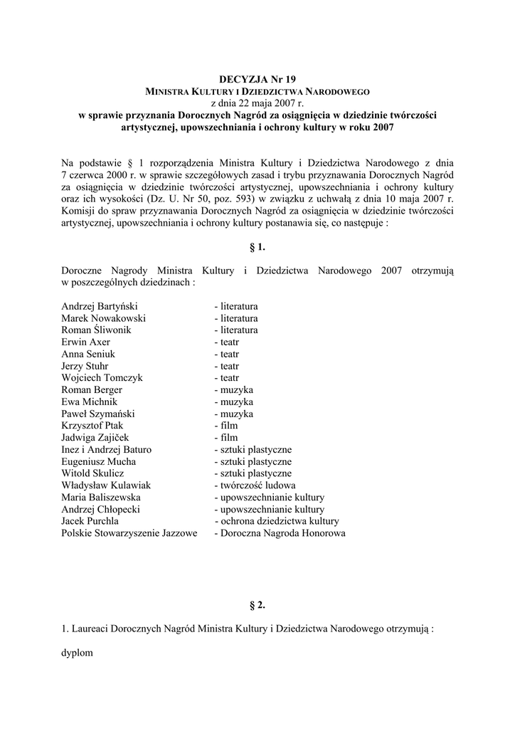 DECYZJA Nr 19 MINISTRA KULTURY I DZIEDZICTWA NARODOWEGO z dnia 22 maja 2007 r. w sprawie przyznania Dorocznych Nagród za osiągnięcia w dziedzinie twórczości artystycznej, upowszechniania i ochrony kultury w roku 2007 Na podstawie § 1 rozporządzenia Ministra Kultury i Dziedzictwa Narodowego z dnia 7 czerwca 2000 r. w sprawie szczegółowych zasad i trybu przyznawania Dorocznych Nagród za osiągnięcia w dziedzinie twórczości artystycznej, upowszechniania i ochrony kultury oraz ich wysokości (Dz. U. Nr 50, poz. 593) w związku z uchwałą z dnia 10 maja 2007 r. Komisji do spraw przyznawania Dorocznych Nagród za osiągnięcia w dziedzinie twórczości artystycznej, upowszechniania i ochrony kultury postanawia się, co następuje : § 1. Doroczne Nagrody Ministra Kultury i Dziedzictwa Narodowego 2007 otrzymują w poszczególnych dziedzinach : Andrzej Bartyński Marek Nowakowski Roman Śliwonik Erwin Axer Anna Seniuk Jerzy Stuhr Wojciech Tomczyk Roman Berger Ewa Michnik Paweł Szymański Krzysztof Ptak Jadwiga Zajiček Inez i Andrzej Baturo Eugeniusz Mucha Witold Skulicz Władysław Kulawiak Maria Baliszewska Andrzej Chłopecki Jacek Purchla Polskie Stowarzyszenie Jazzowe - literatura - literatura - literatura - teatr - teatr - teatr - teatr - muzyka - muzyka - muzyka - film - film - sztuki plastyczne - sztuki plastyczne - sztuki plastyczne - twórczość ludowa - upowszechnianie kultury - upowszechnianie kultury - ochrona dziedzictwa kultury - Doroczna Nagroda Honorowa § 2. 1. Laureaci Dorocznych Nagród Ministra Kultury i Dziedzictwa Narodowego otrzymują : dyplom statuetkę nagrodę finansową w wysokości 36 000 zł 2. Laureat Dorocznej Nagrody Honorowej Ministra Kultury i Dziedzictwa Narodowego otrzymuje dyplom i statuetkę. § 3. Decyzja wchodzi w życie z dniem podpisania. MINISTER KULTURY I DZIEDZICTWA NARODOWEGO (-) Kazimierz M. Ujazdowski