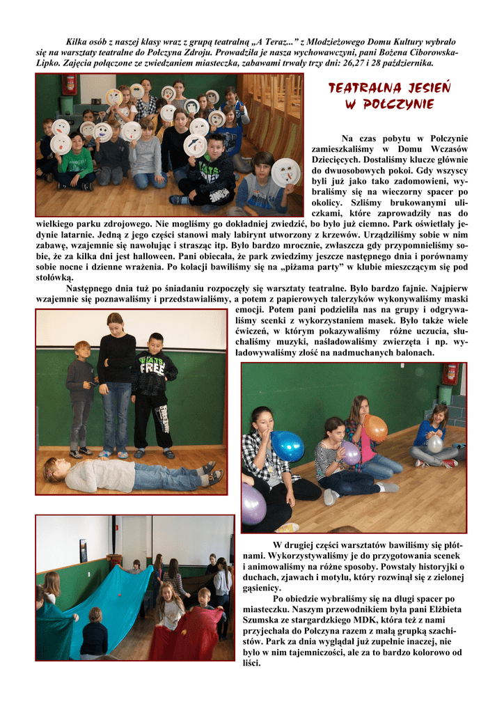 Kilka osób z naszej klasy wraz z grupą teatralną „A Teraz...” z Młodzieżowego Domu Kultury wybrało się na warsztaty teatralne do Połczyna Zdroju. Prowadziła je nasza wychowawczyni, pani Bożena CiborowskaLipko. Zajęcia połączone ze zwiedzaniem miasteczka, zabawami trwały trzy dni: 26,27 i 28 października. TEATRALNA JESIEŃ W POŁCZYNIE Na czas pobytu w Połczynie zamieszkaliśmy w Domu Wczasów Dziecięcych. Dostaliśmy klucze głównie do dwuosobowych pokoi. Gdy wszyscy byli już jako tako zadomowieni, wybraliśmy się na wieczorny spacer po okolicy. Szliśmy brukowanymi uliczkami, które zaprowadziły nas do wielkiego parku zdrojowego. Nie mogliśmy go dokładniej zwiedzić, bo było już ciemno. Park oświetlały jedynie latarnie. Jedną z jego części stanowi mały labirynt utworzony z krzewów. Urządziliśmy sobie w nim zabawę, wzajemnie się nawołując i strasząc itp. Było bardzo mrocznie, zwłaszcza gdy przypomnieliśmy sobie, że za kilka dni jest halloween. Pani obiecała, że park zwiedzimy jeszcze następnego dnia i porównamy sobie nocne i dzienne wrażenia. Po kolacji bawiliśmy się na „piżama party” w klubie mieszczącym się pod stołówką. Następnego dnia tuż po śniadaniu rozpoczęły się warsztaty teatralne. Było bardzo fajnie. Najpierw wzajemnie się poznawaliśmy i przedstawialiśmy, a potem z papierowych talerzyków wykonywaliśmy maski emocji. Potem pani podzieliła nas na grupy i odgrywaliśmy scenki z wykorzystaniem masek. Było także wiele ćwiczeń, w którym pokazywaliśmy różne uczucia, słuchaliśmy muzyki, naśladowaliśmy zwierzęta i np. wyładowywaliśmy złość na nadmuchanych balonach. W drugiej części warsztatów bawiliśmy się płótnami. Wykorzystywaliśmy je do przygotowania scenek i animowaliśmy na różne sposoby. Powstały historyjki o duchach, zjawach i motylu, który rozwinął się z zielonej gąsienicy. Po obiedzie wybraliśmy się na długi spacer po miasteczku. Naszym przewodnikiem była pani Elżbieta Szumska ze stargardzkiego MDK, która też z nami przyjechała do Połczyna razem z małą grupką szachistów. Park za dnia wyglądał już zupełnie inaczej, nie było w nim tajemniczości, ale za to bardzo kolorowo od liści. Dowiedzieliśmy się, że Połczyn Zdrój ma bogatą historię i różne ciekawostki. Jego początki związane są z bogatymi rodami Wedlów ( tych od czekolady) i Manteufflów. W jego herbie (widocznym obok) znajdują się trzy krzewy winorośli, co jest nawiązaniem do winnic, które na południe od zamku, na stokach doliny rzeczki Wogry, założył prawdopodobnie Hasso von Wedel. Przy zamku usłyszeliśmy legendę o księżniczce, potem wybraliśmy się do tzw. angielskiej części parku zdrojowego. Zobaczyliśmy strumyki i rzekę Wogrę między pagórkami, jeziorko, drewniane mostki, aż dotarliśmy do małej restauracji na filiżankę gorącej herbaty, kawałek ciasta albo deser. To był ciekawie spędzony weekend. Czas minął nam bardzo szybko i gdy wracaliśmy w niedzielę po obiedzie do domu, trochę żal nam było opuszczać to miłe miasteczko. Jessica Nackowicz NAJBARDZIEJ ZAPAMIĘTAM CZEKOLADĘ Na warsztatach wykonywaliśmy maski, które pokazywały różne emocje: gniew, radość, szczęście, złość, niechęć, smutek lub zdziwienie. Po obiedzie graliśmy w ciekawe gry. Najbardziej zapamiętałam tę o nazwie „Czekolada”. Polega na tym, że siadamy w kółku i po kolei rzucamy kostką. Osoba, która wyrzuci sześć oczek, musi szybko pobiec do stołu, założyć kuchenny fartuch, rękawice i drewnianymi no- żykami ukroić kawałek czekolady. Te czynności musi wykonać, zanim ktoś inny z kręgu wyrzuci kostką sześć oczek. Jeśli nie zdąży, wraca do kręgu, a zabawa toczy się dalej. Nagrodą jest kostka pysznej czekolady. Zabawa wywołuje bardzo dużo śmiechu i emocji. W czasie pobytu w Połczynie podobał mi się też spacer po parku zdrojowym, wielkie szachy, amfiteatr i fontanna. Nasz wyjazd był udany. Pokazał nam m.in., jak można bawić się za pomocą płótna, jak wykonać maski z papierowych talerzyków. Weronika Pilarowska