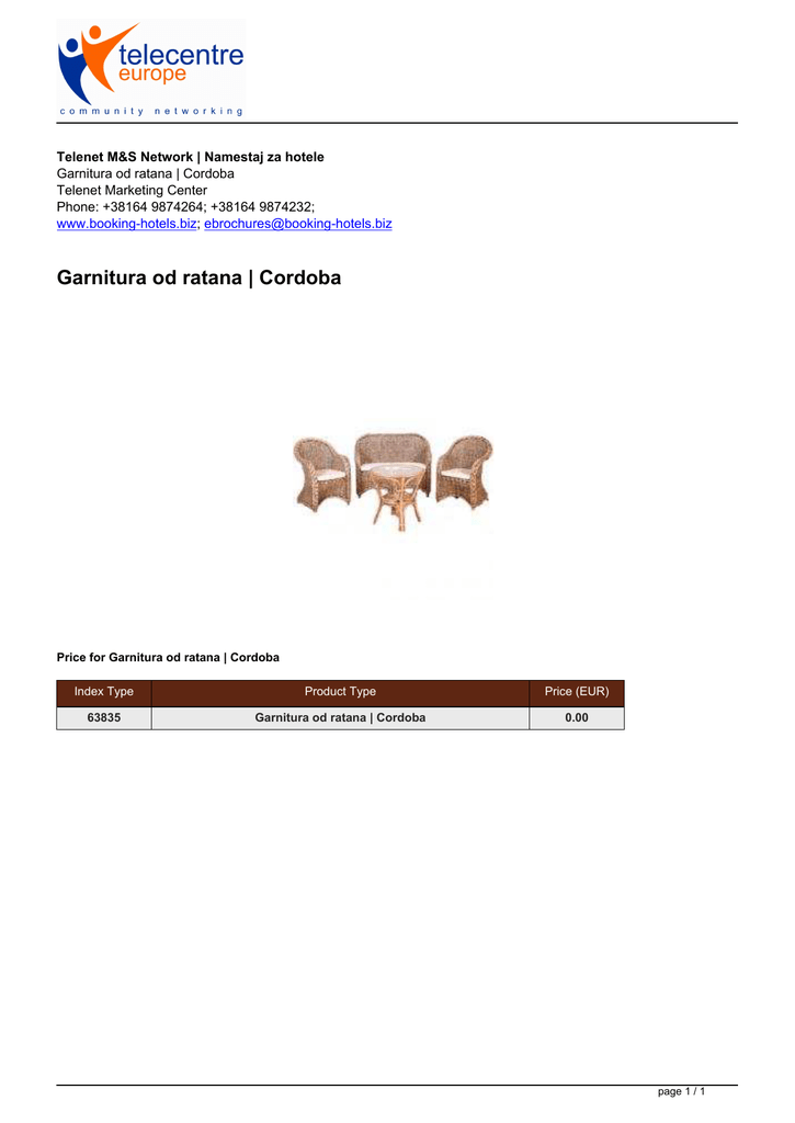 Telenet M&S Network | Namestaj za hotele Garnitura od ratana | Cordoba Telenet Marketing Center Phone: +38164 9874264; +38164 9874232; www.booking-hotels.biz; [email protected] Garnitura od ratana | Cordoba Price for Garnitura od ratana | Cordoba Index Type Product Type Price (EUR) 63835 Garnitura od ratana | Cordoba 0.00 page 1 / 1
