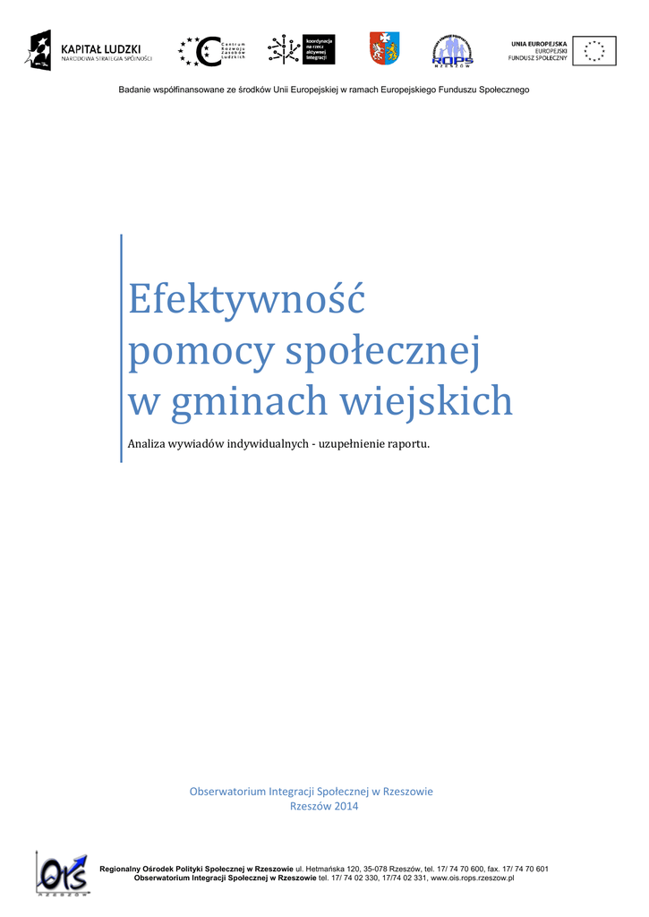 Badanie współfinansowane ze środków Unii Europejskiej w ramach Europejskiego Funduszu Społecznego Efektywność pomocy społecznej w gminach wiejskich Analiza wywiadów indywidualnych - uzupełnienie raportu. Obserwatorium Integracji Społecznej w Rzeszowie Rzeszów 2014 Regionalny Ośrodek Polityki Społecznej w Rzeszowie ul. Hetmańska 120, 35-078 Rzeszów, tel. 17/ 74 70 600, fax. 17/ 74 70 601 Obserwatorium Integracji Społecznej w Rzeszowie tel. 17/ 74 02 330, 17/74 02 331, www.ois.rops.rzeszow.pl Spis treści Analiza wyników badania jakościowego ................................................................................................. 2 Wnioski .................................................................................................................................................... 8 Aneks ..................................................................................................................................................... 10 1 Analiza wyników badania jakościowego Jednym z etapów realizowanego badania były indywidualne wywiady pogłębione przeprowadzone w wybranych gminach Podkarpacia. Zgodnie z założeniami zrealizowano 10 wywiadów w gminach wiejskich. Poniżej przedstawione są wyniki badania podzielone na bloki tematyczne zgodnie ze scenariuszem wywiadu. Działania zwiększające efektywność pomocy społecznej W większości zrealizowanych wywiadów respondenci zwracali uwagę na problem braku środków finansowych. Uważam, że na pewno trzeba zwiększyć środki finansowe. Zmniejszyć pewną dysproporcje środków finansowych. Jeżeli na utrzymanie ośrodka, w którym pracuje 6 osób, otrzymujemy 60 tysięcy to to jest zdecydowanie za mało (wywiad 1). Jednocześnie najbardziej skutecznym działaniem, jakie może podjąć gmina w celu zwiększenia efektywności pomocy społecznej jest wzrost, przekazywanych na pomoc społeczną, środków finansowych. … bardzo istotnym elementem zwiększenia efektywności są finanse (wywiad 8). Wiąże się to z ilością zatrudnionych pracowników w ośrodku, których głównym zadaniem powinna być praca w terenie. … istnieje (…) duża potrzeba, żeby zwiększyć liczbę pracowników socjalnych, którzy najwięcej czasu powinni spędzać w terenie. Tymczasem niedobór środków finansowych powoduje, że w dużej mierze pracownicy socjalni zajmują się sprawami administracyjnymi (wywiad 8). Ponadto: Przyznanie pomocy nie powinno wymagać każdorazowego sporządzenia wywiadu środowiskowego. Jest znana rodzina, jest wywiad środowiskowy, pewne elementy są już pracownikowi socjalnemu znane więc po co ponownie wykonywać tą samą robotę. To czasowo zabiera czas, który mógłby być przeznaczony na realne kontakty z rodziną, odwiedzanie częste, nie tylko wtedy, gdy jest składany wniosek o pomoc i konieczne sporządzenie wywiadu środowiskowego (wywiad 8). Do czynników zwiększających efektywność pomocy społecznej zaliczono również: uczestniczenie pracowników w szkoleniach podnoszących kwalifikacje zawodowe, dopracowanie zakresu obowiązków pracownika socjalnego do jego możliwości czasowych (…) i współpraca ośrodka z innymi instytucjami samorządowymi, powiatowy urząd pracy, powiatowe centrum pomocy rodzinie np. i projekty z zakresu aktywnej integracji, aktywizujące osoby zagrożone wykluczeniem społecznym (wywiad 7). Przykłady skutecznych działań na rzecz przeciwdziałania problemom społecznym Jednym ze skutecznych działań zapobiegających powstawaniu problemów społecznych jest aktywność projektowa jednostki. … udział w nawet projektach tzw. systemowych, (…) wiem, że przynosi to pewien efekt, bo braliśmy udział przez kilka lat w projekcie, został on realizowany przez nasz GOPS i tutaj oprócz tego, że były szkolenia specjalistyczne, bo chodziło o przeciwdziałanie wykluczeniom społecznym osób, bezrobotnych, aktywizacja osób wykluczonych społecznie to były w ramach tego realizowane staże i wiem, że skończyły się tym też, że zmniejszyła się liczba osób korzystających z pomocy społecznej, bo te osoby dostały zatrudnienie (wywiad 2). Jednostki dzięki środkom pozyskanym w ramach projektu mają możliwość poszerzenia oferty kierowanej do osób najbardziej potrzebujących. Jeden z badanych uważa, że trudno mówić o skuteczności w pomocy społecznej. Zadowalająca skuteczność jest ściśle związana z otoczeniem, możliwością znalezienia 2 pracy, infrastrukturą i posiadaniem odpowiednich zasobów. Ta skuteczność, jej nigdy nie uda się uzyskać na wysokim poziomie. Nie znam takich przykładów skutecznego działania tak, żeby podopieczni, osoby objęte pomocą społeczną były w pełni zadowolone. Bo jednak przyznawanie pomocy, ono pomaga jakoś w utrzymaniu rodziny, ale nigdy nie zaspokoi wszystkich potrzeb. Zadowolenia rodzin objętych pomocą nie będzie nigdy (wywiad 8). Deinstytucjonalizacja pomocy społecznej Proces deistytucjonalizacji pomocy społecznej w gminach odbywa się często przy aktywnym udziale organizacji pozarządowych. … aktywnie przejawiają działalność te właśnie kościelne organizacje charytatywne w pomocy społecznej, (…) które świadczą pomoc finansową i takie wsparcie tym potrzebującym (wywiad 3). Są również inicjatywy oddolne. Pierwszymi takimi ogniwami, w zasadzie w każdej miejscowości działa jakieś stowarzyszenie, gdzie też się do nich przychodzi z problemem. Oni znają daną rodzinę. Są blisko tej rodziny. Albo zgłaszają tutaj do GOPS-u jeżeli jest to jakieś takie doraźne czy incydentalne wydarzenie, jak również we własnym zakresie to rozwiązują. I zostaje to z dobrym skutkiem załatwione (wywiad 10). W gminach funkcjonuje również wsparcie środowiskowe: Jako nieliczna gmina na Podkarpaciu, dzięki pomocy wojewody, udało nam się otworzyć Środowiskowy Dom Samopomocy. Ponad 30 osób niepełnosprawnych znalazło tam swoje miejsce (wywiad 1). Jeden z 