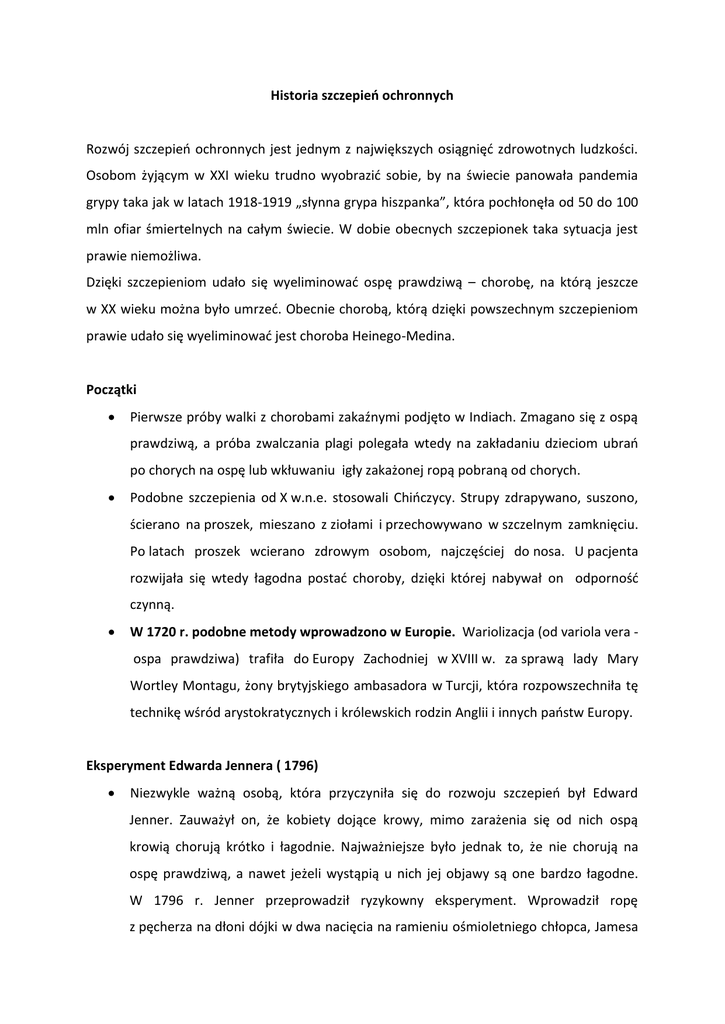 Historia szczepieo ochronnych Rozwój szczepieo ochronnych jest jednym z największych osiągnięd zdrowotnych ludzkości. Osobom żyjącym w XXI wieku trudno wyobrazid sobie, by na świecie panowała pandemia grypy taka jak w latach 1918-1919 „słynna grypa hiszpanka”, która pochłonęła od 50 do 100 mln ofiar śmiertelnych na całym świecie. W dobie obecnych szczepionek taka sytuacja jest prawie niemożliwa. Dzięki szczepieniom udało się wyeliminowad ospę prawdziwą – chorobę, na którą jeszcze w XX wieku można było umrzed. Obecnie chorobą, którą dzięki powszechnym szczepieniom prawie udało się wyeliminowad jest choroba Heinego-Medina. Początki Pierwsze próby walki z chorobami zakaźnymi podjęto w Indiach. Zmagano się z ospą prawdziwą, a próba zwalczania plagi polegała wtedy na zakładaniu dzieciom ubrao po chorych na ospę lub wkłuwaniu igły zakażonej ropą pobraną od chorych. Podobne szczepienia od X w.n.e. stosowali Chioczycy. Strupy zdrapywano, suszono, ścierano na proszek, mieszano z ziołami i przechowywano w szczelnym zamknięciu. Po latach proszek wcierano zdrowym osobom, najczęściej do nosa. U pacjenta rozwijała się wtedy łagodna postad choroby, dzięki której nabywał on odpornośd czynną. W 1720 r. podobne metody wprowadzono w Europie. Wariolizacja (od variola vera ospa prawdziwa) trafiła do Europy Zachodniej w XVIII w. za sprawą lady Mary Wortley Montagu, żony brytyjskiego ambasadora w Turcji, która rozpowszechniła tę technikę wśród arystokratycznych i królewskich rodzin Anglii i innych paostw Europy. Eksperyment Edwarda Jennera ( 1796) Niezwykle ważną osobą, która przyczyniła się do rozwoju szczepieo był Edward Jenner. Zauważył on, że kobiety dojące krowy, mimo zarażenia się od nich ospą krowią chorują krótko i łagodnie. Najważniejsze było jednak to, że nie chorują na ospę prawdziwą, a nawet jeżeli wystąpią u nich jej objawy są one bardzo łagodne. W 1796 r. Jenner przeprowadził ryzykowny eksperyment. Wprowadził ropę z pęcherza na dłoni dójki w dwa nacięcia na ramieniu ośmioletniego chłopca, Jamesa Phippsa. Wszczepił chłopcu krowiankę. Po nadzwyczaj łagodnym przebiegu choroby James wyzdrowiał, a po roku okazało się, że został uodporniony także na ospę prawdziwą. Metoda Jennera, zwana pod nazwą wakcynacji (od variola vaccina- ospa krowia) szybko rozpowszechniła się w niemal całej Europie. Eksperyment Jennera dał początek szczepieniom! Szczepienia przeciwospowe metodą Jannera, zostały wprowadzone w Polsce w latach 1801 - 1802 dzięki Hiacyntowi Dziarkowskiemu, Wojciechowi Jerzemu Boduszyoskiemu, Neuhauserowi i Vannotiemu. Szczepionki przeciwko wąglikowi i wściekliźnie (1881-1885) Ludwik Pasteur zaobserwował zjawisko osłabienia zjadliwości zarazków chorobotwórczych. Stało się to przez przypadek, ponieważ asystent Pasteura pozostawił w laboratoryjnej szafce hodowlę zarazków cholery drobiu, przeznaczoną do podania kurom, i całkowicie o niej zapomniał. Po kilku tygodniach wstrzyknął ptakom cholerę. Wbrew oczekiwaniom kury nie zachorowały. Przez poddanie bakterii różnym czynnikom fizycznym (temperatura, powietrze) można uzyskad osłabienie ich właściwości chorobotwórczych. Pasteur przewidział, że podanie teraz zwykłych zarazków nie powinno wpłynąd na zdrowie zwierząt. Potwierdził to w publicznym doświadczeniu, uodparniając owce na laseczki wąglika, a następnie udowadniając ich odpornośd. W 1885 Ludwik Pasteur stworzył szczepionkę przeciw wściekliźnie. Opracował on metodę przenoszenia choroby ze zwierząt chorych na zdrowe. Szczepionkę uzyskał z wysuszonego rdzenia zwierząt doświadczalnych. Po serii szczepieo uzyskał u psów całkowite uodpornienie na zarazki wścieklizny, podobne postępowanie ratowało także psy, które były już na nią chore. Po raz pierwszy szczepionkę zastosował u człowieka zmuszony koniecznością. 6 lipca 1885r, przywieziono do Pasteura ciężko pogryzionego chłopca. wiedząc że nic innego nie da się zrobid postanowił podad chłopcu szczepionkę, która uratowała mu życie. Polski bakteriolog Odo Bujwid po kilkumiesięcznym pobycie w Paryżu założył w Warszawie – drugą po paryskiej – stację szczepieo przeciwko wściekliźnie metodą Pasteura. Do Warszawy zaczęli przybywad pogryzieni przez wściekłe zwierzęta z całej wschodniej i środkowej Europy. Tuberkulina (1890) W 1890 r. wybitny niemiecki bakteriolog Robert Koch ogłosił, że znalazł sposób na leczenie gruźlicy za pomocą opracowanego przez siebie preparatu. Nie poprawiała ona jednak stanu chorego, ale często gwałtownie go pogarszała. Mimo porażki Koch kontynuował prace nad gruźlicą, a w roku 1905 za wszechstronne badania nad prątkami gruźlicy otrzymał Nagrodę Nobla. Polak Odon Bujwid nadał preparatowi nazwę Tuberkulina. Surowica błonicy i surowica przeciw tężcowi (1890) Niemiec Emil Behring i Japooczyk Szibasaburo Kitasato – opublikowali artykuł „O powstawaniu odporności na błonicę i tężec u zwierząt”. Był to rezultat kilkuletnich prac dotyczących bakteriobójczych właściwości surowicy zwierząt. Był to całkowicie nowy sposób walki z chorobami zakaźnymi. Dotychczasowe szczepienia polegały na uodpornieniu organizmu, surowice zaś zawierały gotowe przeciwciała. Pierwszy raz surowicę przeciwbłoniczą zastosowano w roku 1891. Behring podał ją małej dziewczynce, której stan oceniano jako beznadziejny, preparat zadziałał. Preparaty opracowane przez Behringa zyskały wkrótce nazwy: surowica błonicy i surowica przeciw tężcowi. Szczepionka przeciwko cholerze (1892) Waldemar Haffkine, pracownik Instytutu Pasteura opracował szczepionkę przeciw cholerze. Profilaktyczna szczepionka składa się z osłabionych przez gorące powietrze przecinkowców cholery. W roku 1893 szczepionka Haffkine’a zgasiła epidemię w Kalkucie. Podobny sukces zanotowano w Bombaju w roku 1896. 