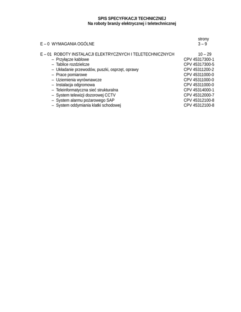SPIS SPECYFIKACJI TECHNICZNEJ Na roboty branży elektrycznej i teletechnicznej E – 0 WYMAGANIA OGÓLNE E – 01 ROBOTY INSTALACJI ELEKTRYCZNYCH I TELETECHNICZNYCH – Przyłącze kablowe – Tablice rozdzielcze – Układanie przewodów, puszki, osprzęt, oprawy – Prace pomiarowe – Uziemienia wyrównawcze – Instalacja odgromowa – Teleinformatyczna sieć strukturalna – System telewizji dozorowej CCTV – System alarmu pożarowego SAP – System oddymiania klatki schodowej strony 3–9 10 – 29 CPV 45317300-1 CPV 45317300-5 CPV 45311200-2 CPV 45311000-0 CPV 45311000-0 CPV 45311000-0 CPV 45314000-1 CPV 45312000-7 CPV 45312100-8 CPV 45312100-8 E–0 WYMAGANIA OGÓLNE 1. WSTĘP 1.1. Przedmiot ST Przedmiotem niniejszej Specyfikacji Technicznej są wymagania ogólne dotyczące wykonania i odbioru robót instalacji elektrycznych dla "PRZEBUDOWA I ROZBUDOWA BUDYNKU SZKOŁY PODSTAWOWEJ ORAZ BUDOWA HALI SPORTOWEJ W MIEJSCOWOŚCI MALCANÓW”. 1.2. Zakres stosowania ST Specyfikacja techniczna (ST) stanowi dokument przetargowy i kontraktowy przy zlecaniu i realizacji robót wymienionych w pkt. 1.1. 1.3. Zakres robót objętych ST Ustalenia zawarte w niniejszej specyfikacji obejmują wymagania ogólne, wspólne dla robót objętych szczegółowymi specyfikacjami, dla poszczególnych asortymentów robót branży elektrycznej i słaboprądowej. 1.4. Dane ogólne Zakres opracowania obejmuje wykonanie instalacji elektrycznych i słaboprądowych dla „PRZEBUDOWA I ROZBUDOWA BUDYNKU SZKOŁY PODSTAWOWEJ ORAZ BUDOWA HALI SPORTOWEJ W MIEJSCOWOŚCI MALCANÓW”. Określenia podstawowe Określenia podstawowe użyte w niniejszej ST są zgodne z obowiązującymi normami i przepisami, a także z podanymi poniżej: aprobatą techniczną – dokument stwierdzający przydatność danego wyrobu do określonego obszaru zastosowania i zakresu robót z wyposażeniem, wewnętrznymi połączeniami, osprzętem, obudowami i konstrukcjami wsporczymi służących do łączenia, sterowania, pomiaru, zabezpieczeń i regulacji pracy obwodów elektrycznych; Zawiera ustalenia techniczne co do wymagań podstawowych wyrobu oraz metodykę badań dla potwierdzenia tych wymagań. certyfikat zgodności – dokument wydany przez upoważnioną jednostkę badawczą stwierdzający zgodność z kryteriami określonymi odpowiednimi aktami prawnymi, normami przepisami, wymogami lub specyfikacją techniczna dla badanego materiału lub wyrobu część czynna – przewód lub inny element przewodzący, wchodzący w skład instalacji elektrycznej lub urządzenia, który w warunkach normalnej pracy instalacji elektrycznej może być pod napięciem a nie spełnia funkcji przewodu ochronnego (przewody ochronne PE i PEN nie są częścią czynną) deklaracja zgodności - dokument w formie oświadczenia wydanego przez producenta, stwierdzający zgodność z kryteriami określonymi odpowiednimi normami, certyfikatami, aktami prawnymi, przepisami, wymogami lub specyfikacją techniczną dla badanego materiału lub wyrobu. instalacja elektryczna – zespół odpowiednio połączonych przewodów i kabli wraz ze sprzętem i osprzętem elektroinstalacyjnym (np. elementami mocującymi i izolacyjnymi), a także urządzeniami oraz aparatami - przeznaczony do przesyłu, rozdziału, zabezpieczenia i zasilania odbiorników energii elektrycznej; instalacja odbiorcza – część instalacji elektrycznej, znajdująca się za układem pomiarowym służącym do rozliczeń pomiędzy dostawcą i odbiorcą energii elektrycznej, a w przypadku braku takiego układu pomiarowego, za wyjściowymi zaciskami pierwszego urządzenia zabezpieczającego instalację odbiorcy od strony zasilania; kabel (kabel elektryczny) – przewód jedno – lub wielożyłowy z oddzielną izolacją każdej żyły, przeznaczony do przewodzenia prądu elektrycznego, zaopatrzony w powłokę ochronną i pancerz uzależniony od środowiska, w jakim ma być ułożony (ziemia, woda, kanały podziemne, powietrze) klasa ochronności – umowne oznaczenie, określone możliwości ochronne urządzenia, ze względu na jego cechy budowy, przy bezpośrednim dotyku. łącznik izolacyjny – łącznik umożliwiający w stanie otwarcia utworzenie przerw izolacyjnych między rozłączonymi częściami poszczególnych biegunów o wytrzymałości elektrycznej i innych właściwościach zapewniających bezpieczeństwo ludzi i urządzeń; napięcie znamionowe instalacji – napięcie, na które instalacja elektryczna lub jej część została zaprojektowana (zbudowana); obciążalność prądowa długotrwała (przewodu) – maksymalna wartość prądu, który może płynąć długotrwale w określonych warunkach bez przekraczania dopuszczalnej temperatury przewodu; obciążenie instalacji elektrycznej – stan pracy instalacji, w którym cześć bądź wszystkie odbiorniki energii elektrycznej w poszczególnych obwodach są włączone i pobierają energię; rozróżnia się obciążenie instalacji prądem lub mocą; obwód (instalacji elektrycznej) – zespół elementów np. odbiorniki, aparaty elektryczne, łączniki) odpowiednio połączonych ze sobą przewodami elektrycznymi i pośrednio lub bezpośrednio ze źródłem energii (złącze, źródło awaryjne) chronionych wspólnym zabezpieczeniem; obwód instalacji elektrycznej – zespół elementów połączonych pośrednio lub bezpośrednio ze źródłem energii elektrycznej za pomocą chronionego przed przetężeniem wspólnym zabezpieczeniem, kompletu odpowiednio połączonych przewodów elektrycznych. W skład obwodu elektrycznego wchodzą przewody pod napięciem, przewody ochronne oraz wszelkie urządzenia zmieniające parametry elektryczne obwodu, rozdzielcze, sterownicze i sygnalizacyjne, związane z danym punktem zasilania w energię. odbiornik energii elektrycznej – urządzenie przeznaczone do przetwarzania energii elektrycznej w inną formę energii, np. światło, energię mechaniczną; oprawa oświetleniowa – kompletne urządzenie służą