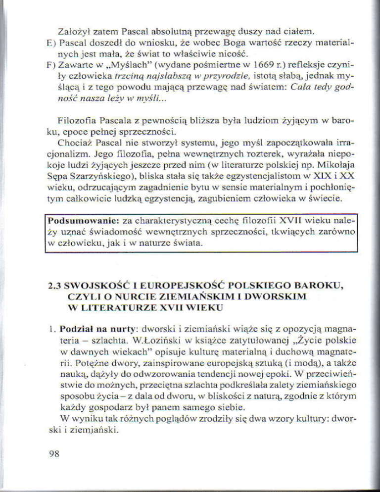 Założyłza1ęmPascal absolulnąprzcwagę duszy nad cjałęm. rzeczy materiaLE) Pascal doszcdłdo wniosku, Źe \ł.obecBoga war1ość ' o s u w | a ( c | $ i e m d l | . ż ę i a | n ' c o s ć ' r\.h c(j F) Zawai1c w '.Myślach''(\\'ydanepośmiertllew ló69 r) refleksjc czyni\1,p tzlrodz ie, istotąsłabŁ jednak rny|\, człowie|<a tĘdną naisłCłbszą śla!4i Z togo powodu rnaja!ąplzcwagę nad śwja|cm:Cała ted),god. nośćndsza lez! \, ]],,śli''' Filozofia PascaLaz pewnościąlrliźsfalryłaludfiotrr żyjącym w barc' ku, epocc pcłncjsprzcczności' Chociaż Pascal nię stworzyłsystemu,jego myśLfapocza]kowa|aifia. cjonalizm' Jcgo fiLozofia.pe}nawęwnę1rznychtozterek' wyrażałaniopokoje ludzi żyjącychjeszcfeplzed niln (w Lilcmlurzcpols1dcjnp' Miko1aja w XlX i xx sępa szarzyńskjc8o),bliska stałasiętakżeegz)'stencjalistom wie]<u, i pochłonięodrzucajalym zagadnieniebyiu w scnsic maLcriaLny1n tym całkowicieludzką egzysLcncjąza$rbienicm człowie]Gw święcie' Podśumo.rYanie: za chamklcrystycznąccchę filozofii XvII wieku na]ewęwnętEnych sprzccmości,lkwiących zarówno ży uznać świadomość jak w człowicl(u' i w naluŹc ś!via1a' 2.3swoJsKoŚc I EURoPEJsKoŚc PoLsKIEGo BARoKU, c7'Yt'I o NURCIE ZIEMIAŃSKIM W LTTERAIURZE XVII WIEKU l DwoRsKlM l ' P o d / i a |n a n u r Ę ' d b o r s l i i z ' e ' n i a . . L $i ' d l e \ j e f o p o 4 c ' U ' r d g n d terja szLachla'WŁoziński w ksią7cc falyiułowancj ,'Życie polskie \! dawoych Wje]Gch''opisuje ku]turęma1ęrialnąi dllchową magnalcrii. PotęŹned\\'or]'zainspirowaneeuropejskąszLuką(i ]nodd' a ul(że naulq' dążytydo odwzolo\łanialendencjinowej epoki' w przcciwjeńf ienianskicgo stwie do możnych,przeciętnasz]ach1apodkreśLałazaLety sPosobużycia z daLaod dworu' w bliskościz na1ura.zgodnięZ ]dórym każdy gospoda]zbyl panem samego siebLe' W wyniku tak różnychpoglądów zrodziłysię dwa wzory l(ultury:dwor. ski i ziem]ański. 98 pocci: Jan Andrzej Morszlyn iDanieL 2) Nu dworski reprezentowali Naborowskiwykształccnic i piastowaniewyso]<ich a) Ccchąobupoetówjests1aranne godności: . J' A' Morsztynpo studiachw Europiezająłsię działa]nością poli na dwoŹc LubomiIskich'co umoźliiłiło 1ycznąm.in' przębywał mu związaniesięz dworemkrólęwskim.Byłonzwolcnnikicmwładzy lcóLcwskicjna Wzór fiancuski'cieszącsiQ ZaufanicmMarii Ludwiki' stałsięjcdnymz przywódcówstronnictwa|rancuskiego' Nies|cty'lojaLnybyłjedyniedo czasu'kicdy dwóI spźyjalFmncji (pozoslałw opozycjido JanalII, który swc pLanywiązalz polityką proausiriacką)'oslalnie lata źyciapoe1aspędziłwc Flancji pod o zdmdęslanu' Paryżem'posa.dzony 'D. Naborowskizdobyłwszechs1ronno *rykszlałcenie, m' 1' studiowałplawo w ollcanie' medycynęw Bazylci, mcchanikiuczyłgo pęłniłfunkcjędyGaliLcusz.Przebywalna dworzc Radziwiłłórt., plomalyi lłLrmacza' Z pŹckonańpolitycznychiIenista,z poglądów pruyją1 religijnych L(aLWń, olwaf!ąposlawęwobęckulturyeuropcjsldcj. zajęcięmobu poe1ów: b) Literaturanie byłagłó\"/nym . J' A' Morsayn pisałwicrszcprzedrozpocz4ciemdziałaLność politycznęj; . D' Naborowskipozostawił swojcutwory,będąceucięczL(ą od rzeczywistości, wlQkopisil]' na rolępoc1y ',szlifierzadiamenzapatrywanie c) obu twórców łącuyło 1ów,'ofaz czcrpaniewzorów f obcejkullury: . J ' A V o r . 7 ' ) . .c 7 o l o ł }p o l c l in ^ d r : . i s I a : - kontynuował nu poczji zmysłowej, opicwancjpŻez Marina.1łutekstv lvłoskicgopoety (,'Adone'',liczne maczyłi parafuazował soncty), - dokonałplzcldadusiclanl(iTassa''Amintas'., - przetłumaczy} u1wórPio1racomcillc,a..cyd a]boRoderyk'Kome. diahiszpańska'', - czerpałpomysłyliterackiez antyku99 . D. Naborowski: - pżcthrmacuył poematPetarki,,TryumfMiłości'', . inspjracjęjegowielszy stanowiły motywybiblłne. d) Twórczość J' A' Morsztynai D- Nabofowskiegodowodfińżnorodnonurtudworskięgow literaturz€ . ścitematycznej . J. A. Morsztynupmwiałpoezjęzmysłową . D' NaborowskireplezenlowalLitemtulę mctafizycznąreflcksyjną 3) Nurt ziemiański łączysiQz nazwiskamiJ. Ch. Paskai w. Potockiego. a) obaj poeciSarmaciodznaczalisię pŹecięmym'chalaklcrystycznym dla średniozamożnej szlachtywykształcenlem: .J' Ch' Pasekuczyłsię prawdopodobnie w kolegiumjezrrickim, .w Potocki miałnauczycieladomoweBo'wiedzęzdobyłczylając ksią'd (*.zmianeko szkołach w jegobiografiinie ma);byłsamoukrem. b) Potocki iPasek naleŹelido nurlulitera|urysamackiej. .w Potocki iyp sflachcica-sanna1yzatroskanęgo o iosykraju;ti'o' ier.7e o lemdlyce palrio')cłej: | 7 ) l ' 1 1 . i nw -,,Nierządem Polska stoi'' - poetapźedstawiaojczyznę.Polskę (Co ro| to noweprawa ikon. w którejpfu1uje całkowitebezp|^wię '' Niktnie słucha,żatlensięnie oglądaną nie)' ftcjęmogą st.ytucje' miećjedynieci, ktorzypiastująurzędylub sąmajęmi' - W '.Pospolitymnrszeniu.'skiytykowałsfiachtęfa to' żemającna względziejedyniewłasnedoblo' daje zły przykład,co w efekcie prowadzido denoralizacjiniższychwańtw społeczeństwa: Widzącdobosz,żego nikt zgołąnie usłuchą, Paszedłsa sPać, ni kto sttzepie u kozucha' I rchnistfz, tova,.zvstt.,o,kied})się nie trwo4J, Zdją||,sz!zbroję ze Erzbiefu,zno\L,l,| się połĄ,. zwróć uwagęna ironicznytytułutwoflr;właściwie powinienonbanieó ,'Pospolitespanic'',Bdyższlachtasmacmieśpi,zamiastszykowaćsię do odpa.ciaataku. - Uperconifikowana Polskaw ',Zbytkachpolski.h'' myś1i tylko o sobie, o zabawic,o uciechach,rrwonimajątekna pelły,kanaki (naszyjniki),sobolci kryszt^Iy,..Tymczasem nó horgunierają żołrlie100 rze os tątni (bore _ Wedyr). Za upadek p ańsi\ła Potocki wini szlachtę i klęr' Ut\łór ullz'vmanv wlonie oskaźycielskim, nalezy |Iakiowaćjako pżcshogą plóbę przemówienia rodakom do rozsądku. - omówięnię .'Transakcji wojny chocimskiej,'znajdziesz w pylaniu ,,Róż]reobl icza lilemlu ),*sarmackicj'' W. Poiocki w sw.oichutwolach \rymzałnastępującepog]ądy: . sławiłstan szlachecki' . by