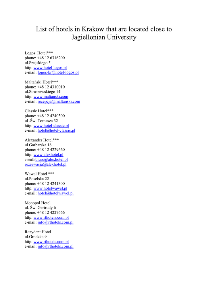 List of hotels in Krakow that are located close to Jagiellonian University Logos Hotel*** phone: +48 12 6316200 ul.Szujskiego 5 http: www.hotel-logos.pl e-mail: [email protected] Maltański Hotel*** phone: +48 12 4310010 ul.Straszewskiego 14 http: www.maltanski.com e-mail: [email protected] Classic Hotel*** phone: +48 12 4240300 ul .Św. Tomasza 32 http: www.hotel-classic.pl e-mail: [email protected] Alexander Hotel*** ul.Garbarska 18 phone: +48 12 4229660 http: www.alexhotel.pl e-mail: [email protected] [email protected] Wawel Hotel *** ul.Poselska 22 phone: +48 12 4241300 http: www.hotelwawel.pl e-mail: [email protected] Monopol Hotel ul. Św. Gertrudy 6 phone: +48 12 4227666 http: www.rthotels.com.pl e-mail: [email protected] Rezydent Hotel ul.Grodzka 9 http: www.rthotels.com.pl e-mail: [email protected] Senacki Hotel ul.Grodzka 51 phone: +48 12 4211161 http: www.senacki.krakow.pl e-mail: [email protected] Campanile Hotel** ul.Św.Tomasza 34 phone: +48 12 4242600 http: www.campanile.com.pl e-mail: [email protected] [email protected] Pollera hotel** ul.Szpitalna 30 phone: +48 12 4221044 http: www.pollera.com.pl e-mail: [email protected] Copernicus Hotel**** ul.Kanonicza 16 phone: +48 12 4243400 www.hotel.com.pl e-mail:[email protected] Amadeus Hotel**** ul.Mikolajska 20 phone: +48 12 4296070 http: www.hotel-amadeus.com.pl e-mail: [email protected] Radisson SAS Hotel***** ul.Straszewskiego 17 phone:+48 12 6188888 http: www.radissonnsas.com e-mail: [email protected] Novotel Kraków Centrum**** ul.Kościuszki 5 phone: +48 12 2992900 http: www.radissonnsas.com e-mail: [email protected] Ostoya Palace Hotel**** ul. Pilsudskiego 24 phone: +48 12 4309000 http: www.ostoyapalace.com e-mail: [email protected] Pension: Dom Polonii Rynek Glowny 14 phone: +48 12 4280460 Guest Rooms Wielopole ul.Wielopole 3 phone: +48 12 4221475 http: www.wielopole .pl e-mail: [email protected] Kadetus Hostel ul. Zwierzyniecka 25 phone: +48 12 4223617 http: www.kadetus.com e-mail: [email protected]