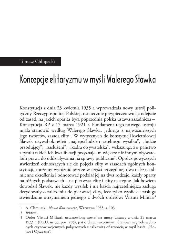 Tomasz Chłopecki Koncepcje elitaryzmu w myśli Walerego Sławka Konstytucja z dnia 23 kwietnia 1935 r. wprowadzała nowy ustrój polityczny Rzeczypospolitej Polskiej, ostatecznie przypieczętowując odejście od zasad, na jakich opar ta była poprzednia polska ustawa zasadnicza – Konstytucja RP z 17 marca 1921 r. Fundament tego no wego ustroju miała stanowić według Walerego Sławka, jednego z najważniejszych jego twórców, zasada elity 1. W wytycznych do konstytucji kwietnio wej Sławek używał okr eśleń „najlepsi ludzie r zetelnego wysiłku”, „ludzie przodujący”, „zasłużeni”, „kadra ob ywatelska”, wskazując, ż e państwo z tytułu takich ich kwalifikacji przyznaje im większe niż innym obywatelom prawa do oddziaływania na sprawy publiczne 2. Oprócz powyższych stwierdzeń odnoszących się do pojęcia elity w zasadach ogólnych konstytucji, możemy wyróżnić jeszcze w części szczególnej dwa dalsze, odmienne określenia i odnotować podział jej na dwa rodzaje, każdy oparty na różnych podstawach – na pierwszą elitę i elity następne. Jak bowiem dowodził Sławek, nie każdy wysiłek i nie każda najrzetelniejsza zasługa decydowały o zaliczeniu do pier wszej elity, lecz tylko wysiłek i zasługa stwierdzone otrzymaniem jednego z dwóch orderów: Virtuti Militari3 1 2 3 A. Chmurski, Nowa Konstytucja, Warszawa 1935, s. 103. Ibidem. Order Virtuti Militari, ustanowiony został na mocy Ustawy z dnia 25 marca 1933 r. (Dz.U. nr 33, poz. 285), jest orderem wojennym. Stanowi nagrodę wybitnych czynów wojennych połączonych z całkowitą ofiarnością w myśl hasła: „Honor i Ojczyzna”. 140 TOMASZ CHŁOPECKI lub Krzyża Niepodległości4. W przypadku „elit następnych” Sławek podawał inne kryteria przynależności do nich: służbę polityczną, ofiarność ponad miarę obowiązku obywatelskiego i wreszcie honor5. Powyższe kryteria w pierwotnym projekcie konstytucji, uchwalonym przez Sejm dnia 26 sty cznia 1934 r., w art. 36 Sławek ujmował w następującą formułę: „ob ywatele, którzy w trybie ustawą pr zewidzianym, za przodujących w pracy na rzecz dobra zbiorowego uznani będą”, tworząc tym samym formułę elit pr zyszłych w ustawie wykonawczej. Miało to znaczenie szczególne, gdyż mogło ulegać zmianom, określenie elit następnych zależeć miało od woli zmienny ch większości Izb Ustawodawczych, albo też od woli P rezydenta6. Prawa członków elity przyznane im zostały już w samej ustawie konstytucyjnej – były one dwojakiego rodzaju polityczne i honorowe. Prawa polityczne polegały na wpływaniu na sprawy publiczne. Wpływanie znajdowało swój wyraz w prawie wyborczym do Senatu, który powinien stanowić „organ woli elity ”, Senat przedstawiał się jako organ państwa odzwier ciedlający wolę elementó w najbardziej czynnych w budowaniu dobra zbiorowego, czyli odzwierciedlający wolę elity7, w przeciwieństwie do Sejmu, który był organem władzy państwa odzwierciedlającym nie wolę Narodu, lecz tylko opinię publiczną8. Walery Sławek, oświadczył 23 czerwca 1934 r. na posiedzeniu połączonych grup konstytucyjnych BBWR – sejmowej i senackiej9, że Marszałek Piłsudski w rozmowie z nim wypowiedział myśl, iż: „dobieranie tych zasłużonych, poprzez znalezienie odpowiednich kryteriów, jest rzeczą trudną”. Sławek dodawał również ze swojej strony: „już wtedy, kiedy zdawałem sobie sprawę z dużych trudności przy jego tworzeniu [Legionu Zasłużonych – dopisek: T.Ch.] i wyraźnie zdawałem sobie spraw ę, że tutaj ujawni się przede wszystkim następująca trudność: ci, którzy mają kwalifikować się i zaliczać do Legjonu Z asłużonych, mogą nie umieć 4 5 6 7 8 9 Krzyż Niepodległości ustanowiony został na mocy Rozporządzenia Prezydenta Rzeczypospolitej z dnia 29 października 1930 r. (Dz.U. nr 95, poz. 591), w celu odznaczenia osób, które zasłużył się czynnie dla niepodległości Ojczyzny w okresie przed wojną światową lub podczas jej trwania oraz w okresie walk orężnych polskich w latach 1918–1921, z wyjątkiem wojny polsko-rosyjskiej na obszarze Polski. A. Chmurski, op. cit., s. 105. Ibidem. Artykuł 34 Konstytucji Rzeczypospolitej Polskiej z 23 kwietnia 1935. Artykuł 26 Konstytucji Rzeczypospolitej Polskiej z 23 kwietnia 1935. Zob. szerzej – „Czas”, nr 177, 30 czerwca 1934 r. KONCEPCJE ELITARYZMU W MYŚLI WALEREGO SŁAWKA 141 uniezależnić się od takich lub innych nacisków. Przewidywałem tę trudność. Sądziłem jednak, że trzeba na to ryzyko iść, bowiem zasada dobierania ludzie wedle ich wartości i zasług może dać zaspokojenie istotnie wielkiej potrzebie, którą wysuwa ciągle i stale życie, potrzebie szukania tych jednostek, które czy to w charakterze doradczym, czy bezpośrednio czynnym, miałby wpływać na ży cie zbiorowe, a które swoją bezinteresownością, swojemi kwalifikacjami moralnemi dawałb y gwarancję, ż e będą służyły dobru powszechnemu”10. Komendant uważał, notował Świtalski, że „praktycznie nie da się znaleźć kryterium dla zasłużonych (…). Komendant żachnął, gdy Sławek mu powiedział, że każdy obywatel ma prawo podać drugiego obywatela do kadry zasłużonych”11. Po rozmowie z Piłsudskim w krótkim czasie odb yło się spotkanie Walerego Sławka, Kazimierza Świtalskiego12, Aleksandra Prystora13 i Wacława Jędrzejewicza14 – w wyniku rozmów lansowana przez Sławka koncepcja Legionu 10 11 12 13 14 K.W. Kumaniecki, Nowa Konstytucja Polska, wyd. 2, Kraków 1935, s. 107. J.M. Nowakowski, Walery Sławek (1879‒1939). Zarys biografii politycznej, Warszawa 1988, s. 123. Kazimierz Stanisław Świtalski (1886‒1962) – polityk, członek Związku Walki Czynnej i Związku Strzeleckiego. Szef kancelarii I Brygady Legionów Polskich i działacz Polskiej Organizacji Wojskowej. W 1926 r. został szefem Kancelarii Cywilnej Prezydenta. W latach 1926‒1928 był Dyrektorem Departamentu