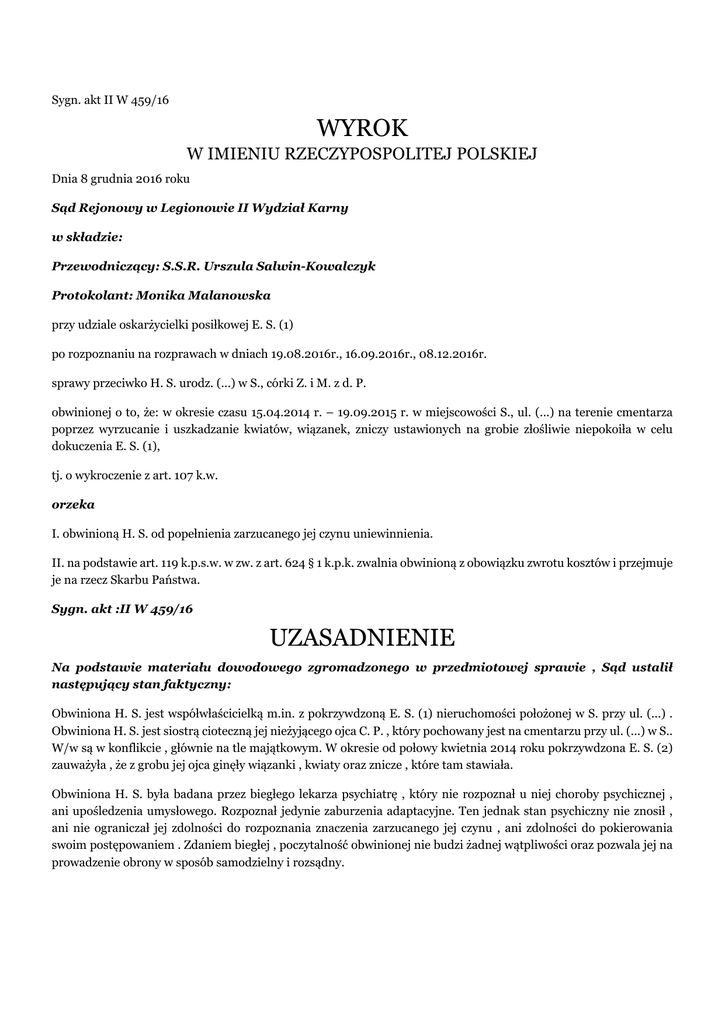 Sygn. akt II W 459/16 WYROK W IMIENIU RZECZYPOSPOLITEJ POLSKIEJ Dnia 8 grudnia 2016 roku Sąd Rejonowy w Legionowie II Wydział Karny w składzie: Przewodniczący: S.S.R. Urszula Salwin-Kowalczyk Protokolant: Monika Malanowska przy udziale oskarżycielki posiłkowej E. S. (1) po rozpoznaniu na rozprawach w dniach 19.08.2016r., 16.09.2016r., 08.12.2016r. sprawy przeciwko H. S. urodz. (...) w S., córki Z. i M. z d. P. obwinionej o to, że: w okresie czasu 15.04.2014 r. – 19.09.2015 r. w miejscowości S., ul. (...) na terenie cmentarza poprzez wyrzucanie i uszkadzanie kwiatów, wiązanek, zniczy ustawionych na grobie złośliwie niepokoiła w celu dokuczenia E. S. (1), tj. o wykroczenie z art. 107 k.w. orzeka I. obwinioną H. S. od popełnienia zarzucanego jej czynu uniewinnienia. II. na podstawie art. 119 k.p.s.w. w zw. z art. 624 § 1 k.p.k. zwalnia obwinioną z obowiązku zwrotu kosztów i przejmuje je na rzecz Skarbu Państwa. Sygn. akt :II W 459/16 UZASADNIENIE Na podstawie materiału dowodowego zgromadzonego w przedmiotowej sprawie , Sąd ustalił następujący stan faktyczny: Obwiniona H. S. jest współwłaścicielką m.in. z pokrzywdzoną E. S. (1) nieruchomości położonej w S. przy ul. (...) . Obwiniona H. S. jest siostrą cioteczną jej nieżyjącego ojca C. P. , który pochowany jest na cmentarzu przy ul. (...) w S.. W/w są w konflikcie , głównie na tle majątkowym. W okresie od połowy kwietnia 2014 roku pokrzywdzona E. S. (2) zauważyła , że z grobu jej ojca ginęły wiązanki , kwiaty oraz znicze , które tam stawiała. Obwiniona H. S. była badana przez biegłego lekarza psychiatrę , który nie rozpoznał u niej choroby psychicznej , ani upośledzenia umysłowego. Rozpoznał jedynie zaburzenia adaptacyjne. Ten jednak stan psychiczny nie znosił , ani nie ograniczał jej zdolności do rozpoznania znaczenia zarzucanego jej czynu , ani zdolności do pokierowania swoim postępowaniem . Zdaniem biegłej , poczytalność obwinionej nie budzi żadnej wątpliwości oraz pozwala jej na prowadzenie obrony w sposób samodzielny i rozsądny. Powyższy stan faktyczny Sąd ustalił w oparciu o: wyjaśnienia obwinionej H. S. /k-81/, częściowo zeznania pokrzywdzonej E. S. (1) /k- 3-3v,81-82/, dokumentację fotograficzną /k- 9-16/, nagranie / k-85,87/, opinie /k-99-101/. Obwiniona H. S. nie przyznała się do popełnienia zarzucanego jej czynu. Wyjaśniła , że w obecnym miejscu jej zamieszkania , mieszkała kiedyś pokrzywdzona ze swoimi rodzicami. Pomiędzy nimi ciągle dochodziło do konfliktów związanych z użytkowaniem wspólnej nieruchomości. W/w podała nadto , że na cmentarz , gdzie leży pochowany ojciec pokrzywdzonej przychodzi bardzo często. Jednak tylko raz się zdarzyło , że zabrała z grobu ojca pokrzywdzonej brudną wiązankę , którą zresztą na drugi dzień odstawiła oraz ze dwa razy ,gdy „ skubnęła” jakiś kwiatek z wiązanki . Było też raz tak , że wylała ze znicza wodę , która w niej zalegała. Nie zrobiła jednak tego ze złośliwości. . Sąd zważył , co następuje: Materiał dowodowy zgromadzony w przedmiotowej sprawie , nie dał podstaw do uznania obwinionej H. S. winnej popełnienia zarzucanego jej czynu. Obwiniona nie przyznała się do winy i zdaniem Sądu , w sprawie nie ma żadnego nie budzącego wątpliwości dowodu , który wskazywałby na jej sprawstwo. Jak wynika bowiem z zeznań pokrzywdzonej E. S. (1) , od połowy kwietnia 2014 roku z grobu jej ojca zaczęły znikać wiązanki , kwiaty i znicze. Zbiegło się to z tym , kiedy zwróciła obwinionej uwagę , że nie może dostać się do domu , który jest jej współwłasnością. Pokrzywdzona nie była świadkiem , aby wiązanki , kwiaty i znicze zabierała obwiniona. Za każdym jednak razem kiedy je tam postawiła , zaczęła je fotografować. Wiązanki zaś zabetonowała w doniczce. Po jakimś czasie stwierdziła , że z doniczki tej wyrywane są kwiaty, a kostka przy grobie i sam grób zalany jest parafiną. W dniu 12 września 2015 roku Straż Miejska w S. na jej prośbę zainstalowała na cmentarzu tzw.” fotopułapkę”. Pod koniec września pokrzywdzona udała się do Straży Miejskiej w S. , gdzie uzyskała informację , że na zdjęciach uwidoczniona jest obwiniona oraz jej zachowanie oraz , że w/w zobowiązała się do oddania wiązanki , którą zabrała z przedmiotowego grobu. Obwiniona w rozmowie z pokrzywdzoną nie przyznała się jednak , że zabierała z grobu jej ojca znicze , wiązanki i kwiaty . Sąd dał wiarę zeznaniom pokrzywdzonej , za wyjątkiem części , w której podała , że na zdjęciach z tzw. „ foto-pułapki „ uwidocznione jest sprawstwo obwinionej. Odtworzone bowiem przez Sąd pliki ze zdjęciami , nie potwierdzają w/w okoliczności. Nadto , zawierają błędną datę z uwagi na awarię kamery. Sąd natomiast obdarzył wiarygodnością opinię sądowo-psychiatryczną , albowiem została sporządzona przez biegłą zgodnie z jej wiedzą i doświadczeniem. Nadto , nie była kwestionowana przez żadną ze stron. H. S. obwiniona jest o to , że : w okresie czasu 15.04.2014 r. – 19.09.2015 r. w miejscowości S., ul. (...) na terenie cmentarza poprzez wyrzucanie i uszkadzanie kwiatów, wiązanek, zniczy ustawionych na grobie złośliwie niepokoiła w celu dokuczenia E. S. (1), tj. o wykroczenie z art. 107 k.w. Czyn sprawcy wykroczenia określonego w art. 107 k.w. polega na wprowadzeniu w błąd innej osoby albo na innym niepokojeniu. Zachowania te są nakierowane na dokuczenie pokrzywdzonemu. Niepokojenie polega na doprowadzeniu do powstania u osoby niepokojonej uczucia obawy, może polegać na naruszeniu spokoju i równowagi psychicznej, wywołaniu uczucia gniewu, złości, niesmaku lub oburzenia .Dla bytu wykroczenia istotne jest, że wprowadzenie w błąd albo niepokojenie ma się charakteryzować złośliwością po stronie sprawcy. Złośliwe będzie takie zachowanie, które ma na celu sprawienie innej osobie przykrości. Wyrz