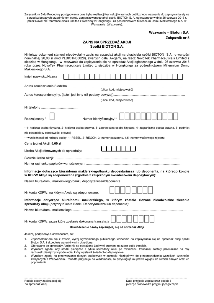 Załącznik nr 5 do Procedury postępowania oraz trybu realizacji transakcji w ramach publicznego wezwania do zapisywania się na sprzedaż będących przedmiotem obrotu zorganizowanego akcji spółki BIOTON S. A. ogłoszonego w dniu 26 czerwca 2015 r. przez NovoTek Pharmaceuticals Limited z siedzibą w Hongkongu za pośrednictwem Millennium Domu Maklerskiego S.A. w Warszawie (Wezwanie). Wezwanie – Bioton S.A. Załącznik nr 5 ZAPIS NA SPRZEDAŻ AKCJI Spółki BIOTON S.A. Niniejszy dokument stanowi nieodwołalny zapis na sprzedaż akcji na okaziciela spółki BIOTON S.A., o wartości nominalnej 20,00 zł (kod PLBIOTN00029), zwanych dalej Akcjami, na rzecz NovoTek Pharmaceuticals Limited z siedzibą w Hongkongu w wezwania do zapisywania się na sprzedaż Akcji ogłoszonego w dniu 26 czerwca 2015 roku przez NovoTek Pharmaceuticals Limited z siedzibą w Hongkongu za pośrednictwem Millennium Domu Maklerskiego S.A. Imię i nazwisko/Nazwa Adres zamieszkania/Siedziba .............................................................................................................................. (ulica, kod, miejscowość) Adres korespondencyjny, (jeżeli jest inny niż podany powyżej):.............................................................................. (ulica, kod, miejscowość) Nr telefonu ......................................... Rodzaj osoby * Numer identyfikacyjny** * 1- krajowa osoba fizyczna, 2- krajowa osoba prawna, 3- zagraniczna osoba fizyczna, 4- zagraniczna osoba prawna, 5- podmiot nie posiadający osobowości prawnej ** w zależności od rodzaju osoby: 1- PESEL, 2- REGON, 3- numer paszportu, 4,5- numer właściwego rejestru Cena jednej Akcji: 9,00 zł Liczba Akcji oferowanych do sprzedaży: Słownie liczba Akcji:........................................................................................................................................... Numer rachunku papierów wartościowych: ......................................................................................................... Informacje dotyczące biura/domu maklerskiego/banku depozytariusza lub deponenta, na którego koncie w KDPW Akcje są zdeponowane (zgodnie z załączonym świadectwem depozytowym): Nazwa biura/domu maklerskiego/banku depozytariusza/deponenta .................................................................... Nr konta KDPW, na którym Akcje są zdeponowane: Informacje dotyczące biura/domu maklerskiego, w którym zostało złożone nieodwołalne zlecenie sprzedaży Akcji (dotyczy Klienta Banku Depozytariusza lub deponenta): Nazwa biura/domu maklerskiego .......................................................................................................................... Nr konta KDPW, przez które zostanie dokonana transakcja Oświadczenie osoby zapisującej się na sprzedaż Akcji Ja niżej podpisany/-a oświadczam, że: 1. 2. 3. 4. Zapoznałem/-am się z treścią wyżej wymienionego publicznego wezwania do zapisywania się na sprzedaż akcji spółki Bioton S.A. i akceptuję warunki w nim określone. Oferowane do sprzedaży Akcje nie są obciążone żadnymi prawami na rzecz osób trzecich. Wyrażam zgodę, aby środki pieniężne z tytułu sprzedaży Akcji po rozliczeniu transakcji zostały przekazane na mój rachunek pieniężny w podmiocie, który wystawił świadectwo depozytowe. Wyrażam zgodę na przetwarzanie danych osobowych w zakresie niezbędnym do przeprowadzenia wszelkich czynności związanych z Wezwaniem. Ponadto przyjmuję do wiadomości, że przysługuje mi prawo wglądu do swoich danych oraz ich poprawiania. ................................................ Podpis osoby zapisującej się na sprzedaż Akcji .......................................................................... Data przyjęcia zapisu oraz podpis i pieczęć pracownika przyjmującego zapis