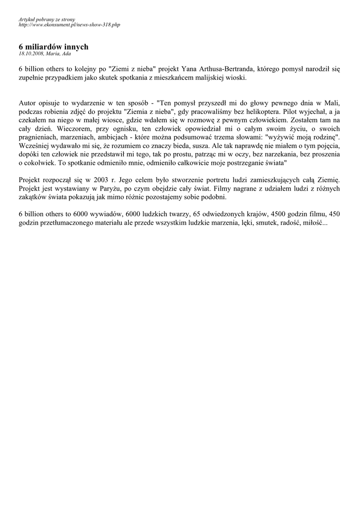 Artykuł pobrany ze strony http://www.ekonsument.pl/news-show-318.php 6 miliardów innych 18.10.2008, Maria, Ada 6 billion others to kolejny po "Ziemi z nieba" projekt Yana Arthusa-Bertranda, którego pomysł narodził się zupełnie przypadkiem jako skutek spotkania z mieszkańcem malijskiej wioski. Autor opisuje to wydarzenie w ten sposób - "Ten pomysł przyszedł mi do głowy pewnego dnia w Mali, podczas robienia zdjęć do projektu "Ziemia z nieba", gdy pracowaliśmy bez helikoptera. Pilot wyjechał, a ja czekałem na niego w małej wiosce, gdzie wdałem się w rozmowę z pewnym człowiekiem. Zostałem tam na cały dzień. Wieczorem, przy ognisku, ten człowiek opowiedział mi o całym swoim życiu, o swoich pragnieniach, marzeniach, ambicjach - które można podsumować trzema słowami: "wyżywić moją rodzinę". Wcześniej wydawało mi się, że rozumiem co znaczy bieda, susza. Ale tak naprawdę nie miałem o tym pojęcia, dopóki ten człowiek nie przedstawił mi tego, tak po prostu, patrząc mi w oczy, bez narzekania, bez proszenia o cokolwiek. To spotkanie odmieniło mnie, odmieniło całkowicie moje postrzeganie świata" Projekt rozpoczął się w 2003 r. Jego celem było stworzenie portretu ludzi zamieszkujących całą Ziemię. Projekt jest wystawiany w Paryżu, po czym obejdzie cały świat. Filmy nagrane z udziałem ludzi z różnych zakątków świata pokazują jak mimo różnic pozostajemy sobie podobni. 6 billion others to 6000 wywiadów, 6000 ludzkich twarzy, 65 odwiedzonych krajów, 4500 godzin filmu, 450 godzin przetłumaczonego materiału ale przede wszystkim ludzkie marzenia, lęki, smutek, radość, miłość...