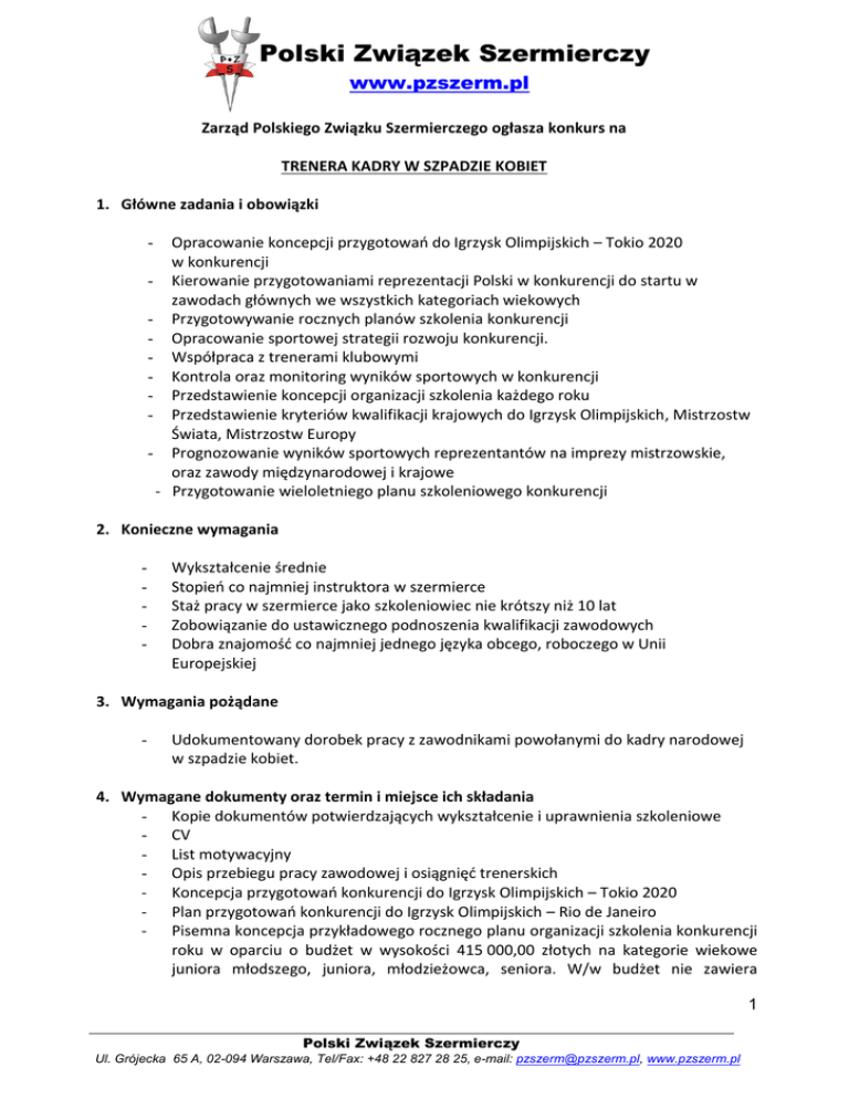 Polski Związek Szermierczy www.pzszerm.pl Zarząd Polskiego Związku Szermierczego ogłasza konkurs na TRENERA KADRY W SZPADZIE KOBIET 1. Główne zadania i obowiązki Opracowanie koncepcji przygotowań do Igrzysk Olimpijskich – Tokio 2020 w konkurencji - Kierowanie przygotowaniami reprezentacji Polski w konkurencji do startu w zawodach głównych we wszystkich kategoriach wiekowych - Przygotowywanie rocznych planów szkolenia konkurencji - Opracowanie sportowej strategii rozwoju konkurencji. - Współpraca z trenerami klubowymi - Kontrola oraz monitoring wyników sportowych w konkurencji - Przedstawienie koncepcji organizacji szkolenia każdego roku - Przedstawienie kryteriów kwalifikacji krajowych do Igrzysk Olimpijskich, Mistrzostw Świata, Mistrzostw Europy - Prognozowanie wyników sportowych reprezentantów na imprezy mistrzowskie, oraz zawody międzynarodowej i krajowe - Przygotowanie wieloletniego planu szkoleniowego konkurencji - 2. Konieczne wymagania - Wykształcenie średnie Stopień co najmniej instruktora w szermierce Staż pracy w szermierce jako szkoleniowiec nie krótszy niż 10 lat Zobowiązanie do ustawicznego podnoszenia kwalifikacji zawodowych Dobra znajomość co najmniej jednego języka obcego, roboczego w Unii Europejskiej 3. Wymagania pożądane - Udokumentowany dorobek pracy z zawodnikami powołanymi do kadry narodowej w szpadzie kobiet. 4. Wymagane dokumenty oraz termin i miejsce ich składania - Kopie dokumentów potwierdzających wykształcenie i uprawnienia szkoleniowe - CV - List motywacyjny - Opis przebiegu pracy zawodowej i osiągnięć trenerskich - Koncepcja przygotowań konkurencji do Igrzysk Olimpijskich – Tokio 2020 - Plan przygotowań konkurencji do Igrzysk Olimpijskich – Rio de Janeiro - Pisemna koncepcja przykładowego rocznego planu organizacji szkolenia konkurencji roku w oparciu o budżet w wysokości 415 000,00 złotych na kategorie wiekowe juniora młodszego, juniora, młodzieżowca, seniora. W/w budżet nie zawiera 1 Polski Związek Szermierczy Ul. Grójecka 65 A, 02-094 Warszawa, Tel/Fax: +48 22 827 28 25, e-mail: [email protected], www.pzszerm.pl Polski Związek Szermierczy www.pzszerm.pl - kosztów stypendiów i międzynarodowych mistrzowskich zawodów szermierczych w każdej kategorii wiekowej. Koncepcja zespołu szkoleniowego konkurencji Propozycja rozwoju konkurencji Projekt wieloletniego programu organizacji szkolenia konkurencji Zobowiązanie do ustawicznego podnoszenia kwalifikacji zawodowych Oświadczenie o posiadaniu dobrej znajomości co najmniej jednego języka obcego, roboczego w Unii Europejskiej. Dokumenty należy dostarczyć do dnia 18 grudnia 2015 do godziny 15.00 do biura Polskiego Związku Szermierczego przy ul. Grójecka 65 A, 02-094 Warszawa. (decyduje data i godzina wpływu wniosku do biura PZS) lub skanem na adres mejlowy [email protected] do dnia 18 grudnia 2015 do godziny 15:00. 5. Procedura i przebieg konkursu Komisja Konkursowa, powołana przez Zarząd Polskiego Związku Szermierczego, działa na podstawie Regulaminu Komisji Konkursowej Komisja Konkursowa rozpatrzy nadesłane zgłoszenia pod względem formalnym i merytorycznym, a następnie przedstawi Zarządowi Związku wybrane kandydatury wraz z uzasadnieniem. Komisja Konkursowa, w wypadku braku odpowiednich kandydatów, może wnioskować do Zarządu o unieważnienie konkursu. Wyniki konkursu Zarząd PZS ogłosi na stronie PZS www.pzszerm.pl nie później niż do dnia 31 grudnia 2015. 6. Inne informacje Zarząd Polskiego Związku Szermierczego zastrzega sobie prawo unieważnienia konkursu bez podania przyczyny. W imieniu Zarządu Polskiego Związku Szermierczego Adam Konopka Prezes Zarządu 2 Polski Związek Szermierczy Ul. Grójecka 65 A, 02-094 Warszawa, Tel/Fax: +48 22 827 28 25, e-mail: [email protected], www.pzszerm.pl