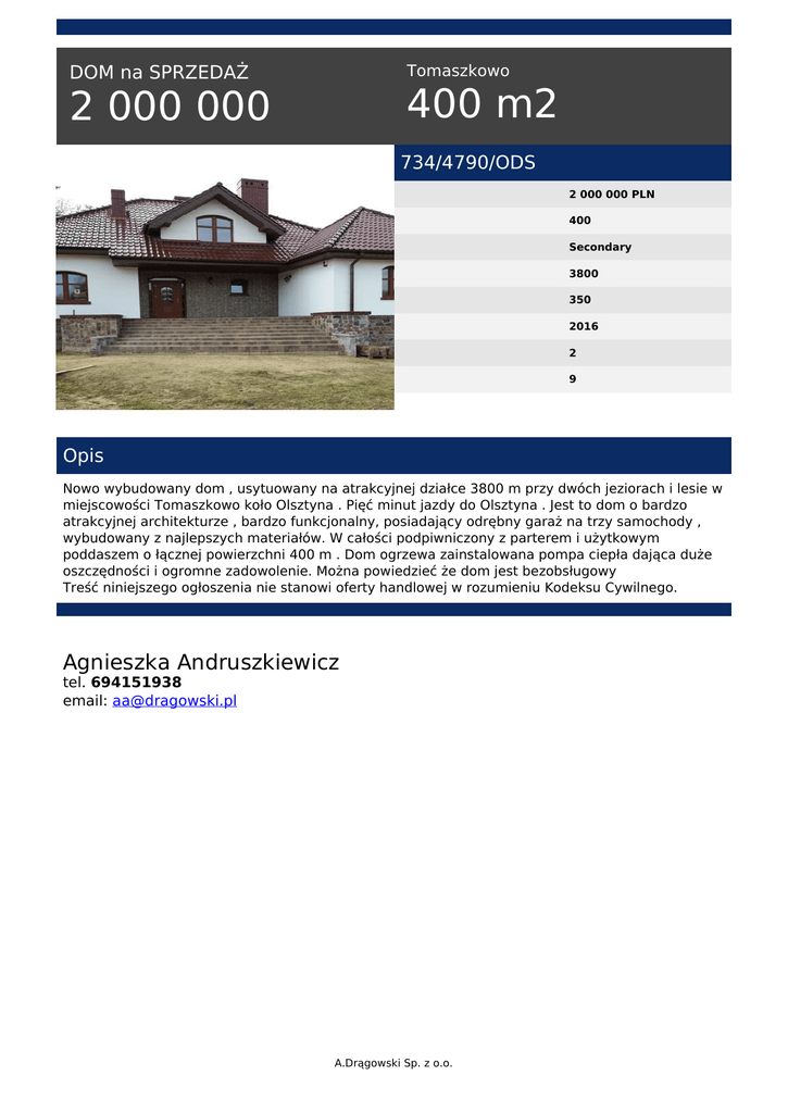 Tomaszkowo DOM na SPRZEDAŻ 400 m2 2 000 000 734/4790/ODS 2 000 000 PLN 400 Secondary 3800 350 2016 2 9 Opis Nowo wybudowany dom , usytuowany na atrakcyjnej działce 3800 m przy dwóch jeziorach i lesie w miejscowości Tomaszkowo koło Olsztyna . Pięć minut jazdy do Olsztyna . Jest to dom o bardzo atrakcyjnej architekturze , bardzo funkcjonalny, posiadający odrębny garaż na trzy samochody , wybudowany z najlepszych materiałów. W całości podpiwniczony z parterem i użytkowym poddaszem o łącznej powierzchni 400 m . Dom ogrzewa zainstalowana pompa ciepła dająca duże oszczędności i ogromne zadowolenie. Można powiedzieć że dom jest bezobsługowy Treść niniejszego ogłoszenia nie stanowi oferty handlowej w rozumieniu Kodeksu Cywilnego. Agnieszka Andruszkiewicz tel. 694151938 email: [email protected] A.Drągowski Sp. z o.o. Powered by TCPDF (www.tcpdf.org)