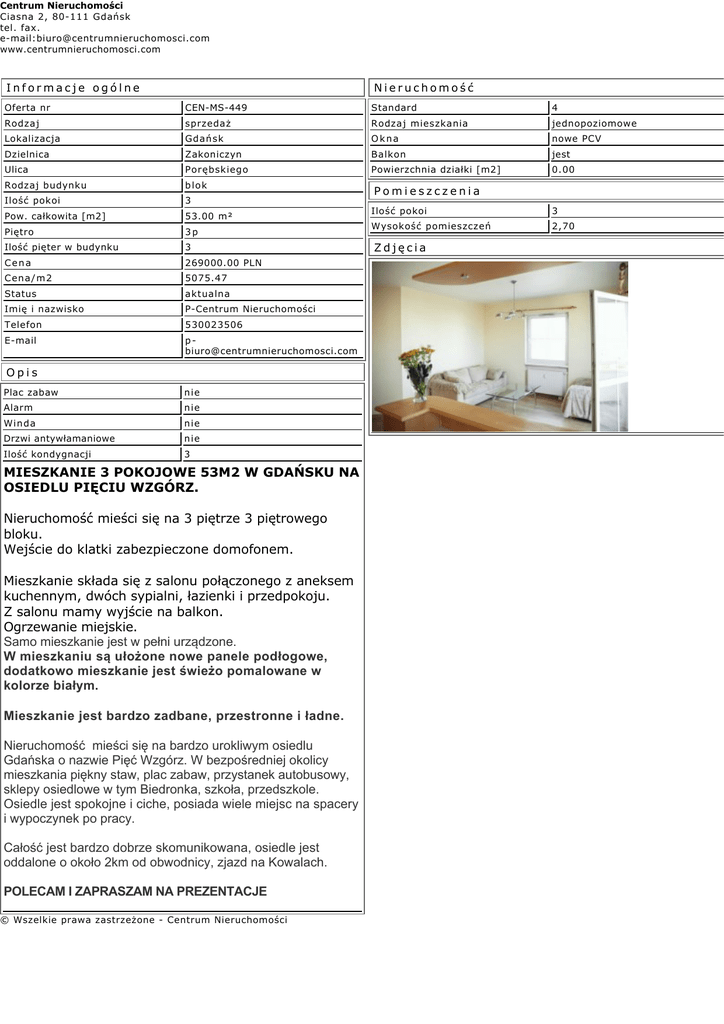 Centrum Nieruchomości Ciasna 2, 80-111 Gdańsk tel. fax. e-mail:[email protected] www.centrumnieruchomosci.com Informacje ogólne Nieruchomość Oferta nr CEN-MS-449 Standard 4 Rodzaj sprzedaż Rodzaj mieszkania jednopoziomowe Lokalizacja Gdańsk Okna nowe PCV Dzielnica Zakoniczyn Balkon jest Ulica Porębskiego Powierzchnia działki [m2] 0.00 Rodzaj budynku blok Ilość pokoi 3 Pow. całkowita [m2] 53.00 m² Piętro 3p Ilość pięter w budynku 3 Cena 269000.00 PLN Cena/m2 5075.47 Status aktualna Imię i nazwisko P-Centrum Nieruchomości Telefon 530023506 E-mail [email protected] Opis Plac zabaw nie Alarm nie Winda nie Drzwi antywłamaniowe nie Ilość kondygnacji 3 MIESZKANIE 3 POKOJOWE 53M2 W GDAŃSKU NA OSIEDLU PIĘCIU WZGÓRZ. Nieruchomość mieści się na 3 piętrze 3 piętrowego bloku. Wejście do klatki zabezpieczone domofonem. Mieszkanie składa się z salonu połączonego z aneksem kuchennym, dwóch sypialni, łazienki i przedpokoju. Z salonu mamy wyjście na balkon. Ogrzewanie miejskie. Samo mieszkanie jest w pełni urządzone. W mieszkaniu są ułożone nowe panele podłogowe, dodatkowo mieszkanie jest świeżo pomalowane w kolorze białym. Mieszkanie jest bardzo zadbane, przestronne i ładne. Nieruchomość mieści się na bardzo urokliwym osiedlu Gdańska o nazwie Pięć Wzgórz. W bezpośredniej okolicy mieszkania piękny staw, plac zabaw, przystanek autobusowy, sklepy osiedlowe w tym Biedronka, szkoła, przedszkole. Osiedle jest spokojne i ciche, posiada wiele miejsc na spacery i wypoczynek po pracy. Całość jest bardzo dobrze skomunikowana, osiedle jest oddalone o około 2km od obwodnicy, zjazd na Kowalach. POLECAM I ZAPRASZAM NA PREZENTACJE © Wszelkie prawa zastrzeżone - Centrum Nieruchomości Pomieszczenia Ilość pokoi 3 Wysokość pomieszczeń 2,70 Zdjęcia