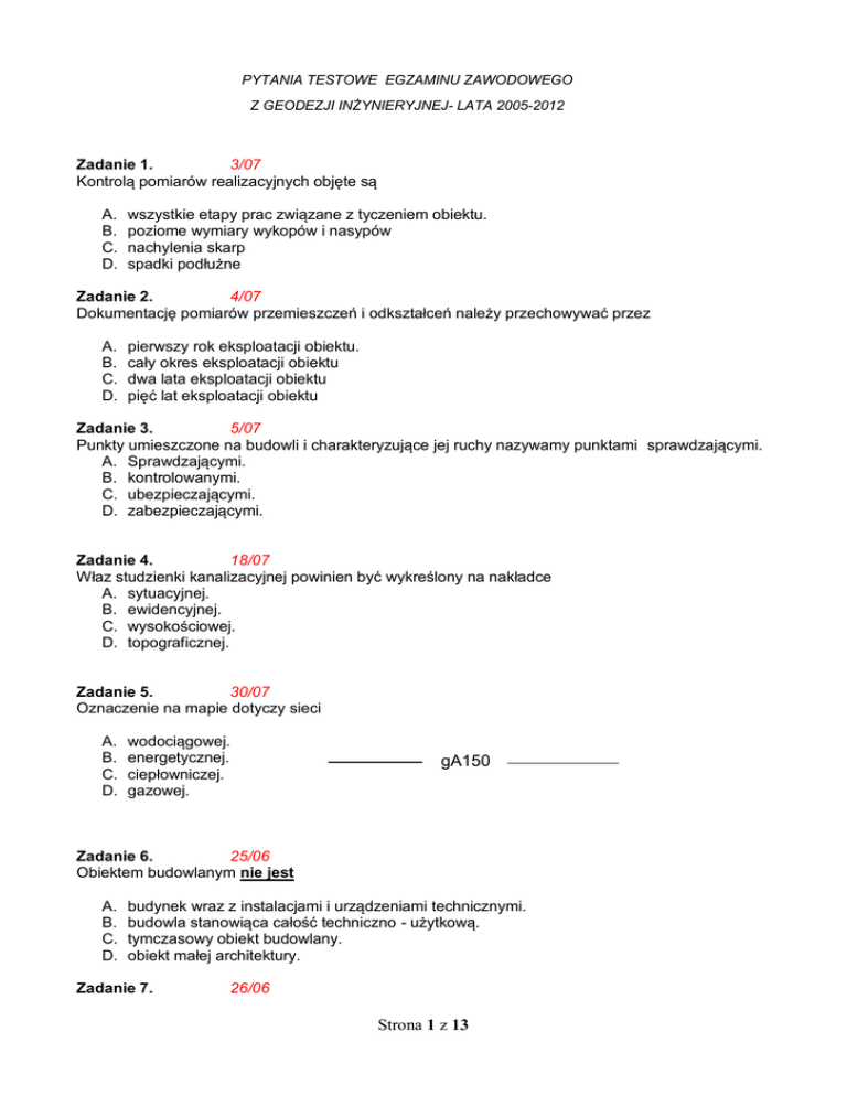 PYTANIA TESTOWE EGZAMINU ZAWODOWEGO Z GEODEZJI INŻYNIERYJNEJ- LATA 2005-2012 Zadanie 1. 3/07 Kontrolą pomiarów realizacyjnych objęte są A. B. C. D. wszystkie etapy prac związane z tyczeniem obiektu. poziome wymiary wykopów i nasypów nachylenia skarp spadki podłużne Zadanie 2. 4/07 Dokumentację pomiarów przemieszczeń i odkształceń należy przechowywać przez A. B. C. D. pierwszy rok eksploatacji obiektu. cały okres eksploatacji obiektu dwa lata eksploatacji obiektu pięć lat eksploatacji obiektu Zadanie 3. 5/07 Punkty umieszczone na budowli i charakteryzujące jej ruchy nazywamy punktami sprawdzającymi. A. Sprawdzającymi. B. kontrolowanymi. C. ubezpieczającymi. D. zabezpieczającymi. Zadanie 4. 18/07 Właz studzienki kanalizacyjnej powinien być wykreślony na nakładce A. sytuacyjnej. B. ewidencyjnej. C. wysokościowej. D. topograficznej. Zadanie 5. 30/07 Oznaczenie na mapie dotyczy sieci A. B. C. D. wodociągowej. energetycznej. ciepłowniczej. gazowej. gA150 Zadanie 6. 25/06 Obiektem budowlanym nie jest A. B. C. D. budynek wraz z instalacjami i urządzeniami technicznymi. budowla stanowiąca całość techniczno - użytkową. tymczasowy obiekt budowlany. obiekt małej architektury. Zadanie 7. 26/06 Strona 1 z 13 Sieci telekomunikacyjne na mapie zasadniczej kreśli się kolorem A. pomarańczowym. B. fioletowym. C. brązowym. D. zielonym. Zadanie 8. 27/06 Jeżeli występują rozbieżności między wynikami pomiarów wykonywanych w trakcie budowy a projektem, fakt ten należy odnotować A. na szkicu tyczenia. B. w dzienniku budowy. C. w dzienniku pomiarowym. D. na szkicu dokumentacyjnym. Zadanie 9. 28/06 Inwentaryzację powykonawczą sieci uzbrojenia terenu wykonuje się na podstawie A. danych branżowych. B. bezpośredniego pomiaru w wykopie. C. dokumentacji projektowej. D. odczytu ułożenia przewodu z mapy. Zadanie 10. 29/06 Ustalenie dokładności wyznaczenia przemieszczeń wynika A. B. C. D. z określenia granicznego błędu wyznaczenia przemieszczeń. ze średniego błędu zastosowanej metody pomiaru. ze sposobu identyfikacji punktów stałych. z błędu pomiaru osnowy. Zadanie 11. 30/06 Na mapie zasadniczej, znakiem umownym oznaczenia armatury naziemnych uzbrojenia podziemnego dla sieci elektroenergetycznej jest e A. e B. en C. n D. En Zadanie 12. 31/06 Rysunek przedstawia typowe rozmieszczenie stanowisk instrumentu do pomiarów budowli A. B. C. D. trasy drogowej. nachylenia terenu. pionowości komina. przewodów podziemnych. Zadanie 13. 32/06 Szkic dokumentacyjny wykonuje się w skali planu realizacyjnego. A. planu realizacyjnego. B. mapy zasadniczej. C. dokumentacji. D. przybliżonej. Zadanie 14. 1/05 Strona 2 z 13 Na przedstawionym obok fragmencie mapy umieszczono zapis „w B 100”. Co on oznacza? A. Przewód wodociągowy w budowie o średnicy 100 mm. B. Istniejący przewód wodociągowy o średnicy 100 mm. C. Przewód podziemny w budowie, położony na głębokości 100 mm. D. Przewód wodociągowy o średnicy 100 mm, ustalony na podstawie materiałów branżowych. Zadanie 15. 8/05 Jaki dokument, sporządzony podczas geodezyjnego opracowania projektu obiektu budowlanego, stanowi podstawę wykonania tyczenia lokalizacyjnego? A. B. C. D. Szkic tyczenia. Projekt konstrukcyjny. Szkic dokumentacyjny. Sprawozdanie techniczne. Zadanie 16. 9/05 Zakres i częstotliwość pomiarów przemieszczeń i odkształceń budowli powinny być określone w A. B. C. D. instrukcji eksploatacji budowli i instrukcji technicznej. projekcie inwestycji i instrukcji eksploatacji budowli. instrukcji technicznej i wytycznych technicznych. projekcie inwestycji i instrukcji technicznej. Zadanie 17. 12/05 Pomiaru powykonawczego przewodów podziemnych dokonuje się A. B. C. D. po zasypaniu wykopu. po zakończeniu prac na terenie budowy. na bieżąco w trakcie układania przewodów. po ułożeniu przewodów w wykopie, ale przed ich przykryciem. Zadanie 18. 31/08 Najbliżej linii zabudowy usytuowania jest sieć A B C Cieplna Gazowa Kanalizacyjna D Telekomunikacyjna Zadanie 19. 32/08 Elementy naziemne uzbrojenia terenu to A. B. C. D. Obiekty inżynierskie zlokalizowane poniżej powierzchni terenu. Części obiektów inżynierskich podziemnych, znajdujących się na powierzchni terenu. Obiekty inżynierski znajdujące się ponad powierzchnią terenu. Części obiektów inżynierskich podziemnych i naziemnych, znajdujących się na powierzchni terenu. Zadanie 20. 33/08 Pomiary geodezyjne wykonywane w czasie budowy nazywane są pomiarami A B C D Odkształceń Realizacyjnymi Przemieszczeń Powykonawczymi Zadanie 21. 34/08 Rezultatem geodezyjnego opracowania projektu jest szkic Strona 3 z 13 A B Polowy C Tyczenia D Tachimetryczny Dokumentacyjny Zadanie 22. 37/08 Promień łuku kołowego wynosi 100m, kąt zwrotu stycznych 100 g. Oblicz długość stycznej T=PW = WK A. 25 m B. 50 m Zadanie 23. C. 75 m D. 100 m 08/09 Dokonując pomiaru rozjazdu kolejowego, należy zamierzyć między innymi jego punkt początkowy, którym jest: A. styk szyn za kierownicami B. styk szyn przed iglicami C. dziób krzyżownicy Zadanie 24. D. ukres 15/09 W jakiej skali wykonuje się mapy do celów projektowych dla działek budowlanych? A. B. C. D. 1:100 1:200 1:500 1:2000 Zadanie 25. 16/09 Osnowę budowlano-montażową stosuje się do: A. B. C. D. Wytyczenia budynku pod wykop. Wytyczenie budynku w wykopie. Tyczenie wskaźników konstrukcyjnych na kolejnych kondygnacjach. Pomiaru kontrolnego stanu zerowego i wpasowania siatki konstrukcyjnej Zadanie 26. 17/09 Zakres i częstotliwość geodezyjnych pomiarów związanych z badaniem przemieszczeń i odkształceń obiektów kolejowych określone są: A. B. C. D. W wytycznych Wydziału Geodezji i Dyrekcji PKP. W projekcie inwestycji i instrukcji eksploatacji budowli i urządzeń. W dokumentacji z pomiaru powykonawczego – zgodnie z potrzebami obiektu. W operacie geodety uprawnionego do geodezyjnej obsługi realizacji obiektu w terenie. Strona 4 z 13 Zadanie 27. 18/09 Szczelinomie