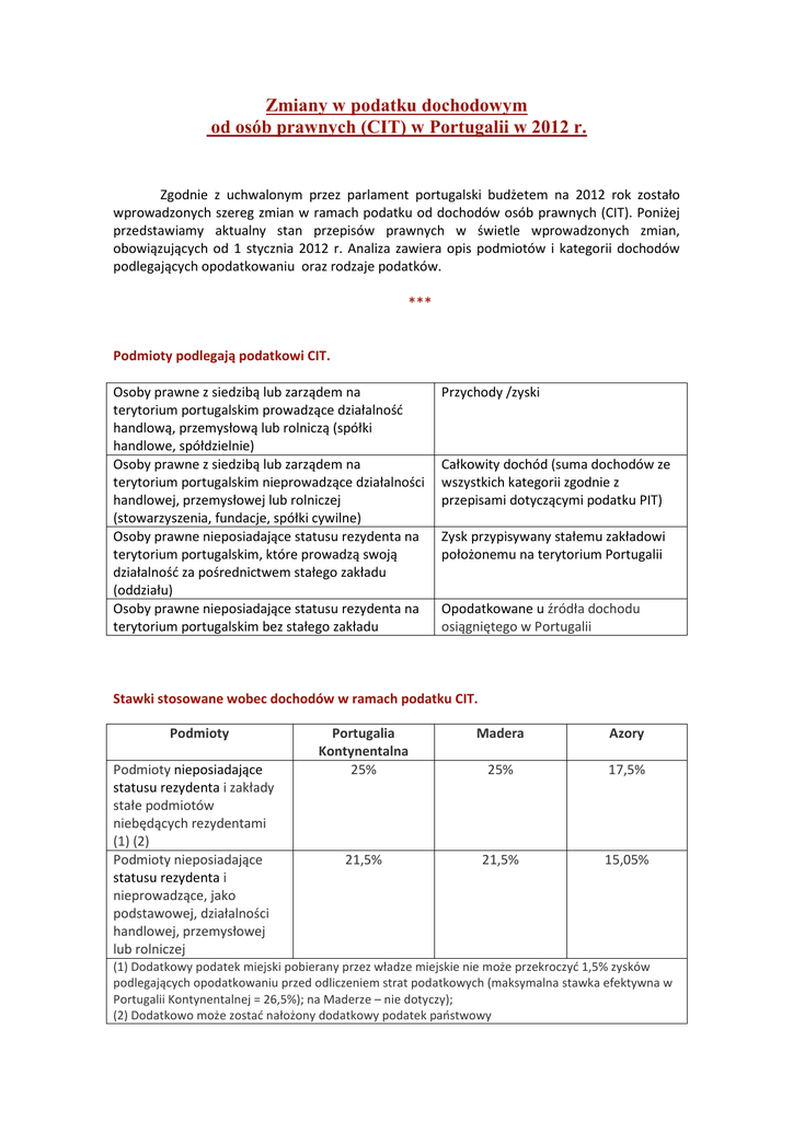 Zmiany w podatku dochodowym od osób prawnych (CIT) w Portugalii w 2012 r. Zgodnie z uchwalonym przez parlament portugalski budżetem na 2012 rok zostało wprowadzonych szereg zmian w ramach podatku od dochodów osób prawnych (CIT). Poniżej przedstawiamy aktualny stan przepisów prawnych w świetle wprowadzonych zmian, obowiązujących od 1 stycznia 2012 r. Analiza zawiera opis podmiotów i kategorii dochodów podlegających opodatkowaniu oraz rodzaje podatków. *** Podmioty podlegają podatkowi CIT. Osoby prawne z siedzibą lub zarządem na terytorium portugalskim prowadzące działalność handlową, przemysłową lub rolniczą (spółki handlowe, spółdzielnie) Osoby prawne z siedzibą lub zarządem na terytorium portugalskim nieprowadzące działalności handlowej, przemysłowej lub rolniczej (stowarzyszenia, fundacje, spółki cywilne) Osoby prawne nieposiadające statusu rezydenta na terytorium portugalskim, które prowadzą swoją działalność za pośrednictwem stałego zakładu (oddziału) Osoby prawne nieposiadające statusu rezydenta na terytorium portugalskim bez stałego zakładu Przychody /zyski Całkowity dochód (suma dochodów ze wszystkich kategorii zgodnie z przepisami dotyczącymi podatku PIT) Zysk przypisywany stałemu zakładowi położonemu na terytorium Portugalii Opodatkowane u źródła dochodu osiągniętego w Portugalii Stawki stosowane wobec dochodów w ramach podatku CIT. Podmioty Podmioty nieposiadające statusu rezydenta i zakłady stałe podmiotów niebędących rezydentami (1) (2) Podmioty nieposiadające statusu rezydenta i nieprowadzące, jako podstawowej, działalności handlowej, przemysłowej lub rolniczej Portugalia Kontynentalna 25% Madera Azory 25% 17,5% 21,5% 21,5% 15,05% (1) Dodatkowy podatek miejski pobierany przez władze miejskie nie może przekroczyć 1,5% zysków podlegających opodatkowaniu przed odliczeniem strat podatkowych (maksymalna stawka efektywna w Portugalii Kontynentalnej = 26,5%); na Maderze – nie dotyczy); (2) Dodatkowo może zostać nałożony dodatkowy podatek państwowy 2 Opodatkowanie autonomiczne Niektóre z kosztów ponoszonych przez podatników CIT są przedmiotem opodatkowania autonomicznego według wymienionych poniżej stawek: Opis Wydatki związane z osobowymi pojazdami lekkimi lub mieszanymi (2) (3) Wydatki reprezentacyjne (4) Wydatki nieudokumentowane (5) Płatności na rzecz podmiotów podlegających uprzywilejowanemu systemowi podatkowemu (6) Diety i koszty podróży poniesione przez pracownika przy użyciu własnego pojazdu, bez obciążania klienta Koszty lub wydatki związane z odszkodowaniem z tytułu zakończenia funkcji kierowniczych, administratorskich lub menadżerskich (7) Koszty lub wydatki związane z premiami lub innymi zmiennymi składnikami wynagrodzeń na rzecz kierowników, administratorów i menadżerów (8) Zyski przekazane podatnikom korzystającym z całkowitego lub częściowego zwolnienia z podatku CIT (9) 2012 10% / 20% 2011 10% / 20% 10% 50% / 70% 35% / 55% 10% 50% / 70% 35% / 55% 5% 5% 35% 35% 35% 35% 25% 20% (1) Stawki opodatkowania autonomicznego są zwiększone o 10% w przypadku podatników, którzy przedstawili straty podatkowe za okres podlegający opodatkowaniu związane z którymkolwiek z określonych faktów podatkowych. (2) Amortyzacja, wynajem, ubezpieczenia, koszty konserwacji i napraw, paliwa i podatki związane z posiadaniem i użytkowaniem pojazdu. (3) W przypadku pojazdów nabytych przed dniem 31 grudnia 2009 - zgodnie z przepisami podatkowymi z 2009 r. Stawka wzrasta do 20% w przypadkach, gdy koszty dotyczą pojazdów osobowych lekkich lub mieszanych, których koszt nabycia przekracza: − 40.000 EUR, w przypadku pojazdów nabytych pomiędzy 1.01 a 31.12 2010 r., − 30.000 EUR, w przypadku pojazdów nabytych pomiędzy 1.01 a 31.12 2011 r. (wobec pojazdów elektrycznych stosuje się limit w wysokości 45.000 EUR), − 25,000 EUR, w przypadku pojazdów nabytych pomiędzy 1.01 a 31.12 2012 r. (wobec pojazdów elektrycznych stosuje się limit w wysokości 50.000 EUR). (4) Przyjęcia, posiłki, podróże, wycieczki i spektakle oferowane w kraju lub za granicą klientom lub dostawcom, jak również innym osobom lub podmiotom. (5) Stawka wzrasta do 70% wobec podatników całkowicie lub częściowo zwolnionych z podatku, podatników nieprowadzących, jako podstawowej, działalności handlowej, przemysłowej lub rolniczej, a także tych, którzy otrzymują dochody bezpośrednio wynikające z wykonywania działalności objętej podatkiem od gier. (6) Opodatkowanie autonomiczne ma zastosowanie wobec kwot zapłaconych lub należnych od osób fizycznych lub prawnych posiadających status rezydenta poza terytorium Portugalii i objętych bardziej korzystnym systemem podatkowym - 35%. Stawka wzrasta do 55% w przypadku podmiotów całkowicie lub częściowo zwolnionych z podatku, lub nieprowadzących, jako podstawowej, działalności handlowej, przemysłowej lub rolniczej, a także tych, którzy otrzymują dochody bezpośrednio wynikające z wykonywania działalności objętej podatkiem od gier. Opodatkowanie autonomiczne może być uchylone w przypadku udowodnienia, że transakcje zostały skutecznie zrealizowane i nie posiadają nietypowego charakteru lub zbyt wysokiej wartości. 3 (7) Podlegają opodatkowaniu autonomicznemu koszty lub wydatki związane z jakimikolwiek odszkodowaniami z tytułu zakończenia sprawowania funkcji i niezwiązane z osiągnięciem określonych wcześniej w umowie celów produktywności; w przypadku wcześniejszego rozwiązania umowy o pracę opodatkowanie autonomiczne odnosi się także do wydatków związanych z przekraczającymi wartość wynagrodzenia kwotami, które pracownik otrzymał podczas pełnienia swoich funkcji do końca trwania umowy. (8) Koszty i wydatki związane z premiami lub innymi zmiennymi składnikami wynagrodzenia wypłaconymi kierownikom, administratorom lub menadżerom podlegają opodatkowaniu, gdy stanowią one większy niż 25