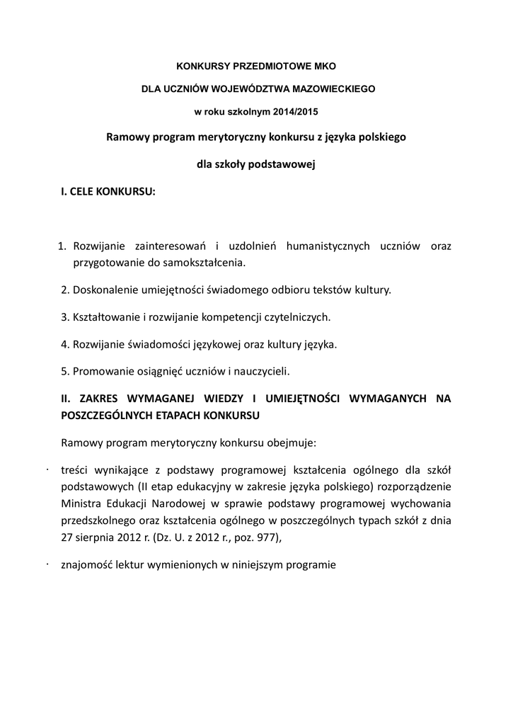 KONKURSY PRZEDMIOTOWE MKO DLA UCZNIÓW WOJEWÓDZTWA MAZOWIECKIEGO w roku szkolnym 2014/2015 Ramowy program merytoryczny konkursu z języka polskiego dla szkoły podstawowej I. CELE KONKURSU: 1. Rozwijanie zainteresowań i uzdolnień humanistycznych uczniów oraz przygotowanie do samokształcenia. 2. Doskonalenie umiejętności świadomego odbioru tekstów kultury. 3. Kształtowanie i rozwijanie kompetencji czytelniczych. 4. Rozwijanie świadomości językowej oraz kultury języka. 5. Promowanie osiągnięć uczniów i nauczycieli. II. ZAKRES WYMAGANEJ WIEDZY I UMIEJĘTNOŚCI WYMAGANYCH NA POSZCZEGÓLNYCH ETAPACH KONKURSU Ramowy program merytoryczny konkursu obejmuje: · treści wynikające z podstawy programowej kształcenia ogólnego dla szkół podstawowych (II etap edukacyjny w zakresie języka polskiego) rozporządzenie Ministra Edukacji Narodowej w sprawie podstawy programowej wychowania przedszkolnego oraz kształcenia ogólnego w poszczególnych typach szkół z dnia 27 sierpnia 2012 r. (Dz. U. z 2012 r., poz. 977), · znajomość lektur wymienionych w niniejszym programie Na wszystkich etapach uczeń powinien wykazać się umiejętnościami: a) odbioru, analizy i interpretacji tekstów kultury, b) posługiwania się pojęciami z zakresu wiedzy o literaturze, c) umiejętność wykorzystania nabytej świadomości językowej, d) tworzenia wypowiedzi pisemnych w następujących formach gatunkowych: list, sprawozdanie, opis, ogłoszenie, zaproszenie, notatka, opowiadanie, pamiętnik, dziennik III. TEKSTY KULTURY OBOWIĄZUJĄCE NA POSZCZEGÓLNYCH ETAPACH KONKURSU ETAP I (szkolny) Pełne zrozumienie i małe nieporozumienia Goscinny René: Mikołajek i inne chłopaki. Przeł. Barbara Grzegorzewska, Warszawa: Nasza Księgarnia, 2007. Jansson Tove: Dolina Muminków w listopadzie. Przeł. Teresa Chłapowska, Warszawa: Nasza Księgarnia, 2000. Koralina i tajemnicze drzwi. Reż. Henry Selick, USA, 2009. Musierowicz Małgorzata: Język Trolli. Łódź: Akapit Press, 2004. Rowling Joanne K.: Harry Potter i Kamień Filozoficzny. Przeł. Andrzej Polkowski Poznań: Media Rodzina, 2000 lub Tolkien John Ronald Reuel: Hobbit, czyli tam i z powrotem. Przeł. Maria Skibniewska, Warszawa: Iskry, 1997 ETAP II (rejonowy) Wyrazić piękno Obowiązuje znajomość zagadnień i lektur z I etapu (szkolnego), a ponadto: Burnett Frances Hodgson: Tajemniczy Włodarkiewiczowa, Warszawa: PWW, 1998. ogród. Przekł. Jadwiga Kasdepke, Grzegorz: Co to znaczy... czyli ponad 200 zabawnych historyjek, które pozwolą zrozumieć znaczenie niektórych powiedzeń. Łódź: Wydawnictwo Literatura, 2012. Mickiewicz Adam: Sonety krymskie. Kraków: Zielona Sowa, 2009 (Burza”, „Ałuszta w nocy”, Droga nad przepaścią w Czufut-Kale”, „Góra Kikineis”). Rocznica urodzin Asterixa i Obelixa, Złota księga. Tom 34. Warszawa: Egmont, 2009. Saint-Exupéry, Antoine de: Mały Książę. Przeł. Marta Malicka, Wrocław: Siedmioróg, 1995. Tuwim Julian: Wiersze na wagarach. Warszawa: Egmont, 2012. ETAP III (wojewódzki) Mówić o trudnych sprawach Obowiązuje znajomość zagadnień i lektur z I etapu (szkolnego) i II etapu (rejonowego), a ponadto: Korczak Janusz: Król Maciuś Pierwszy. Warszawa: Firma Księgarska, Jacek i Krzysztof Olesiejuk - Inwestycje, 2004. Korczak Janusz: Czapka z głowy reporterze [w:] Szczygieł Mariusz 100/XX. Antologia polskiego reportażu XX w. Tom 1: Wydawnictwo Czarne, 2014. Lindgren Astrid: Bracia Lwie Serce. Przeł. Teresa Chłapowska, Warszawa: Nasza Księgarnia, 2005. Schmitt Éric-Emmanuel: Oskar i pani Róża. Kraków: Wydawnictwo Znak, 2004. Przekł. Barbara Grzegorzewska, Szymborska Wisława: wiersze z tomu Koniec i początek. Wydawnictwo a5, 1995. Twardowski Jan: Zeszyt w kratkę. Nowy zeszyt w kratkę. Najnowszy zeszyt w kratkę. Il. Maciej Rybicki, Kraków: Wydawnictwo "M", 2002. Twardowski Jan: Niebieskie okulary. Kraków : Wydawnictwo Znak, 1996. Twardowski Jan: Na osiołku. Białystok: Unikat, 2002. Twardowski Jan: Patyki i patyczki. Il. Joanna Wydawnictwo Archidiecezji Warszawskiej, 1987 Ksycińska, Warszawa: IV. LITERATURA POMOCNICZA Chaciński Bartek: Wyczesany słownik najmłodszej polszczyzny. Kraków: Znak, 2005. Informatory o sprawdzianie od roku szkolnego 2014/2015 zamieszczone na stronie Centralnej Komisji Egzaminacyjnej, Leszczyński Grzegorz: Elementarz literacki. Warszawa: Prószyński i S-ka, 2001. Nagajowa Maria: Sztuka dobrego pisania. Warszawa: Wydawnictwo Oświata, 2003. Polszczyzna płata nam figle: poradnik językowy dla każdego, pod red. Jerzego Podrackiego, Warszawa: Wydawnictwo Medium, 1999. www.poradniajęzykowa.pl, pod red. Katarzyny Wyrwas, Katowice: Wydawnictwo Uniwersytetu Śląskiego, 2007 (porady językowe odnoszące się do: pisowni, interpunkcji, odmiany wyrazów, wyrazów obcych, składni, frazeologii, etykiety językowej). Bortnowski Stanisław: Warsztaty dziennikarskie Warszawa: Stentor, 1999 (głównie: część 2., Informacja, czyli sedno dziennikarstwa, oraz część 3., Publicystyka, czyli dziennikarstwo dla tych, którzy analizują rzeczywistość).