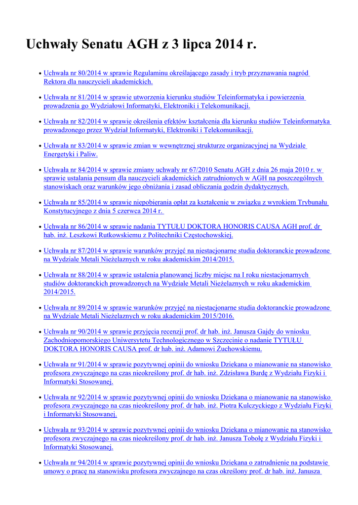 Uchwały Senatu AGH z 3 lipca 2014 r. Uchwała nr 80/2014 w sprawie Regulaminu określającego zasady i tryb przyznawania nagród Rektora dla nauczycieli akademickich. Uchwała nr 81/2014 w sprawie utworzenia kierunku studiów Teleinformatyka i powierzenia prowadzenia go Wydziałowi Informatyki, Elektroniki i Telekomunikacji. Uchwała nr 82/2014 w sprawie określenia efektów kształcenia dla kierunku studiów Teleinformatyka prowadzonego przez Wydział Informatyki, Elektroniki i Telekomunikacji. Uchwała nr 83/2014 w sprawie zmian w wewnętrznej strukturze organizacyjnej na Wydziale Energetyki i Paliw. Uchwała nr 84/2014 w sprawie zmiany uchwały nr 67/2010 Senatu AGH z dnia 26 maja 2010 r. w sprawie ustalania pensum dla nauczycieli akademickich zatrudnionych w AGH na poszczególnych stanowiskach oraz warunków jego obniżania i zasad obliczania godzin dydaktycznych. Uchwała nr 85/2014 w sprawie niepobierania opłat za kształcenie w związku z wyrokiem Trybunału Konstytucyjnego z dnia 5 czerwca 2014 r. Uchwała nr 86/2014 w sprawie nadania TYTUŁU DOKTORA HONORIS CAUSA AGH prof. dr hab. inż. Leszkowi Rutkowskiemu z Politechniki Częstochowskiej. Uchwała nr 87/2014 w sprawie warunków przyjęć na niestacjonarne studia doktoranckie prowadzone na Wydziale Metali Nieżelaznych w roku akademickim 2014/2015. Uchwała nr 88/2014 w sprawie ustalenia planowanej liczby miejsc na I roku niestacjonarnych studiów doktoranckich prowadzonych na Wydziale Metali Nieżelaznych w roku akademickim 2014/2015. Uchwała nr 89/2014 w sprawie warunków przyjęć na niestacjonarne studia doktoranckie prowadzone na Wydziale Metali Nieżelaznych w roku akademickim 2015/2016. Uchwała nr 90/2014 w sprawie przyjęcia recenzji prof. dr hab. inż. Janusza Gajdy do wniosku Zachodniopomorskiego Uniwersytetu Technologicznego w Szczecinie o nadanie TYTUŁU DOKTORA HONORIS CAUSA prof. dr hab. inż. Adamowi Żuchowskiemu. Uchwała nr 91/2014 w sprawie pozytywnej opinii do wniosku Dziekana o mianowanie na stanowisko profesora zwyczajnego na czas nieokreślony prof. dr hab. inż. Zdzisława Burdę z Wydziału Fizyki i Informatyki Stosowanej. Uchwała nr 92/2014 w sprawie pozytywnej opinii do wniosku Dziekana o mianowanie na stanowisko profesora zwyczajnego na czas nieokreślony prof. dr hab. inż. Piotra Kulczyckiego z Wydziału Fizyki i Informatyki Stosowanej. Uchwała nr 93/2014 w sprawie pozytywnej opinii do wniosku Dziekana o mianowanie na stanowisko profesora zwyczajnego na czas nieokreślony prof. dr hab. inż. Janusza Tobołę z Wydziału Fizyki i Informatyki Stosowanej. Uchwała nr 94/2014 w sprawie pozytywnej opinii do wniosku Dziekana o zatrudnienie na podstawie umowy o pracę na stanowisku profesora zwyczajnego na czas określony prof. dr hab. inż. Janusza Uchwała nr 94/2014 w sprawie pozytywnej opinii do wniosku Dziekana o zatrudnienie na podstawie umowy o pracę na stanowisku profesora zwyczajnego na czas określony prof. dr hab. inż. Janusza Kacprzyka z Wydziału Fizyki i Informatyki Stosowanej. Uchwała nr 95/2014 w sprawie pozytywnej opinii do wniosku Dziekana o mianowanie na stanowisko profesora nadzwyczajnego na czas nieokreślony prof. dr hab. Witolda Alexandrowicza z Wydziału Geologii, Geofizyki i Ochrony Środowiska. Uchwała nr 96/2014 w sprawie pozytywnej opinii do wniosku Dziekana o zatrudnienie na podstawie umowy o pracę na stanowisku profesora nadzwyczajnego na czas nieokreślony dr hab. inż. Leszka Magalasa, prof. nadzw. z Wydziału Inżynierii Metali i Informatyki Przemysłowej. Uchwała nr 97/2014 w sprawie pozytywnej opinii do wniosku Dziekana o zatrudnienie na podstawie umowy o pracę na stanowisku profesora nadzwyczajnego na czas nieokreślony dr hab. inż. Andrzeja Bienia, prof. nadzw. z Wydziału Elektrotechniki, Automatyki, Informatyki i Inżynierii Biomedycznej. Uchwała nr 98/2014 w sprawie pozytywnej opinii do wniosku Dziekana o zatrudnienie na podstawie umowy o pracę na stanowisku profesora nadzwyczajnego na czas nieokreślony dr hab. inż. Wiesława Nowaka, prof. nadzw. z Wydziału Elektrotechniki, Automatyki, Informatyki i Inżynierii Biomedycznej. Uchwała nr 99/2014 w sprawie pozytywnej opinii do wniosku Dziekana o zatrudnienie na podstawie umowy o pracę na stanowisku profesora nadzwyczajnego na czas określony dr hab. inż. Andrzeja Więckowskiego z Wydziału Górnictwa i Geoinżynierii. Uchwała nr 100/2014 w sprawie pozytywnej opinii do wniosku Dziekana o zatrudnienie na podstawie umowy o pracę na stanowisku profesora nadzwyczajnego na czas określony dr hab. inż. Tadeusza Gołdę, prof. nadzw. z Wydziału Geodezji Górniczej i Inżynierii Środowiska. Uchwała nr 101/2014 w sprawie pozytywnej opinii do wniosku Dziekana o zatrudnienie na podstawie umowy o pracę na stanowisku profesora nadzwyczajnego na czas określony dr hab. inż. Bogusława Basia z Wydziału Inżynierii Materiałowej i Ceramiki. Uchwała nr 102/2014 w sprawie pozytywnej opinii do wniosku Dziekana o zatrudnienie na podstawie umowy o pracę na stanowisku profesora nadzwyczajnego na czas określony dr hab. inż. Jacka Tarasiuka z Wydziału Fizyki i Informatyki Stosowanej.