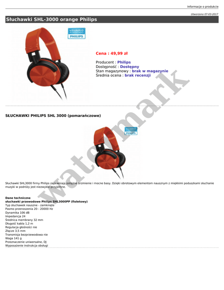 Informacje o produkcie Utworzono 07-03-2017 Słuchawki SHL-3000 orange Philips Cena : 49,99 zł er m ar k Producent : Philips Dostępność : Dostępny Stan magazynowy : brak w magazynie Średnia ocena : brak recenzji at SŁUCHAWKI PHILIPS SHL 3000 (pomarańczowe) w Słuchawki SHL3000 firmy Philips zapewniają potężne brzmienie i mocne basy. Dzięki obrotowym elementom nausznym z miękkimi poduszkami słuchanie muzyki w podróży jest niezwykle przyjemne. Dane techniczne słuchawki przewodowe Philips SHL3000PP (fioletowy) Typ słuchawek nauszne - zamknięte Pasmo przenoszenia 20 - 20000 Hz Dynamika 106 dB Impedancja 24 Średnica membrany 32 mm Długość kabla 1,2 m Regulacja głośności nie Złącze 3,5 mm Transmisja bezprzewodowa nie Waga 141 g Przeznaczenie uniwersalne, DJ Wyposażenie instrukcja obsługi
